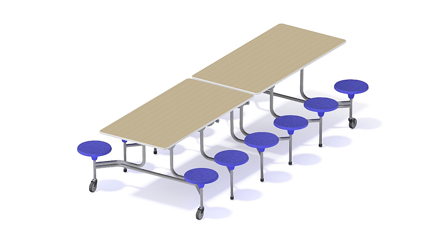 Diese Tisch-, Sitzkombination mit 12 fest montierten, runden Hockern lässt sich im Handumdrehen von stationär zu mobil zusammenklappen und somit platzsparend verstauen. Sie minimieren Geräusche, da die Stühle nicht umhergeschoben werden. Für Hort und Schule.