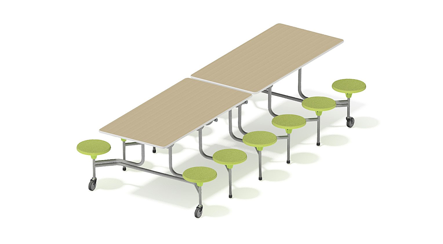Diese Tisch-, Sitzkombination mit 12 fest montierten, runden Hockern lässt sich im Handumdrehen von stationär zu mobil zusammenklappen und somit platzsparend verstauen. Sie minimieren Geräusche, da die Stühle nicht umhergeschoben werden. Für Hort und Schule.