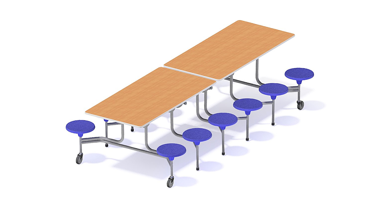 Diese Tisch-, Sitzkombination mit 12 fest montierten, runden Hockern lässt sich im Handumdrehen von stationär zu mobil zusammenklappen und somit platzsparend verstauen. Sie minimieren Geräusche, da die Stühle nicht umhergeschoben werden. Für Hort und Schule.