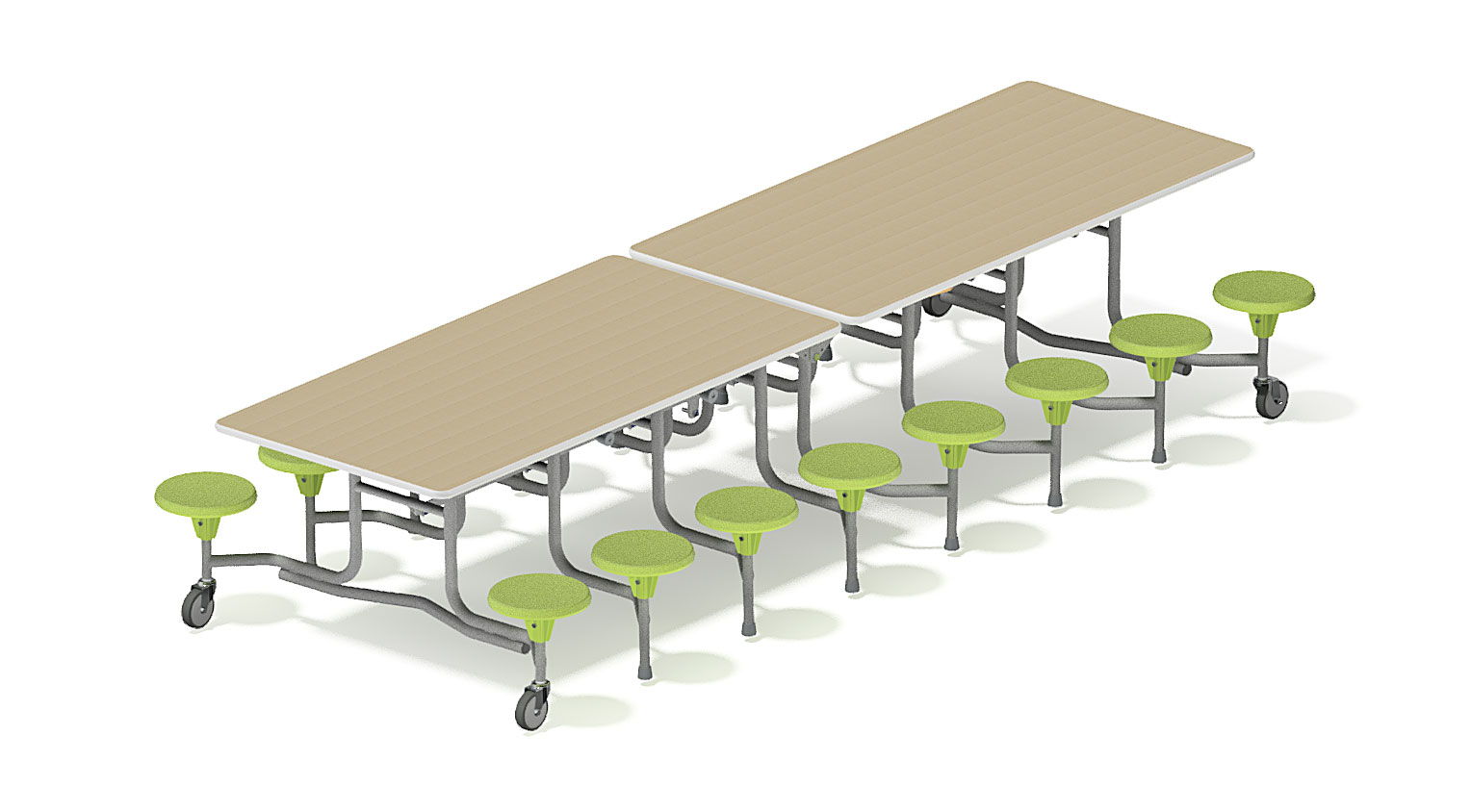 Diese Tisch-, Sitzkombination mit 16 fest montierten, runden Hockern lässt sich im Handumdrehen von stationär zu mobil zusammenklappen und somit platzsparend verstauen. Sie minimieren Geräusche, da die Stühle nicht umhergeschoben werden. Für Kindergärten.