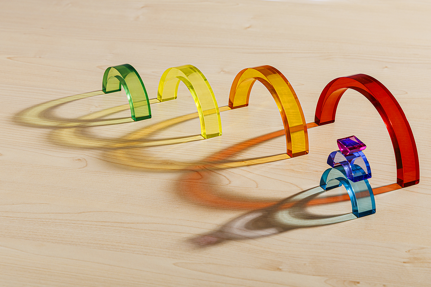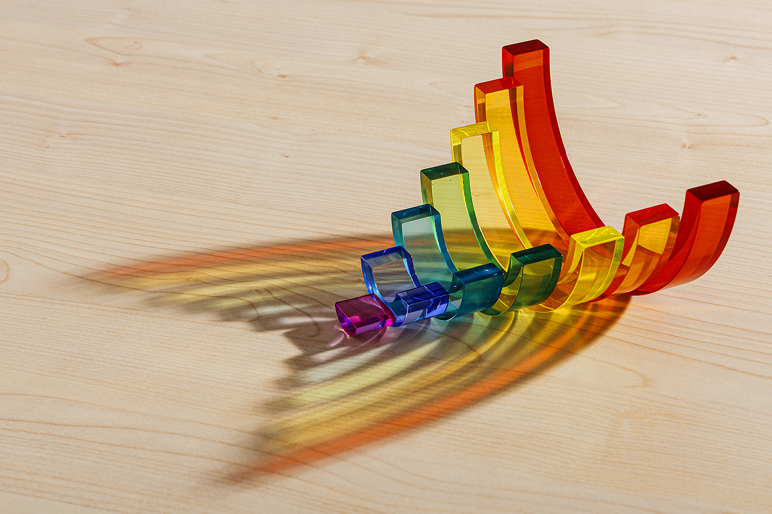 Besonders geeignet auf Lichtquellen, wie Lichtplatten und Leuchttische, zum Spielen in der Bauecke u.v.m.. Die Bögen können zu Türme gebaut werden oder als Bogenschaukel genutzt werden. Wenn die Sonne auf den Regenbogen scheint, dann entstehen schöne Lichtspiele und Lichtschatten.