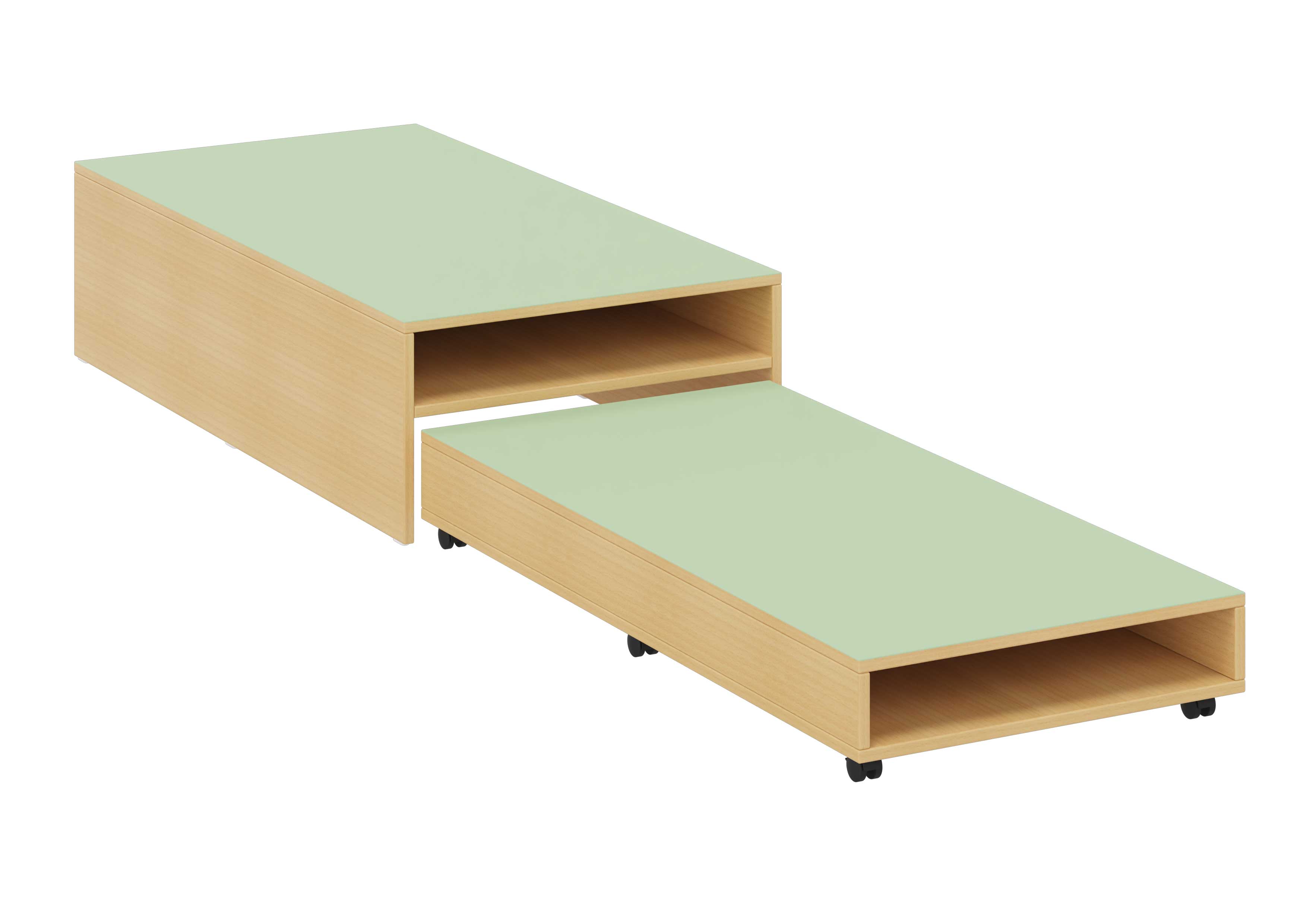 Praktisches 2-teiliges Schlafpodest, in verschiedenen Farben erhältlich. Das niedrigere Podest wird im höheren verstaut und kann einfach herausgezogen werden. Je nach Ausführung 2 bzw. 4 Schlafplätze für Matratzengröße 135 x 60 cm (z.B. Art. Nr. 772 100, bitte separat bestellen). Mit Stauraum zur Aufbewahrung der Matratzen. Belag aus Noraplan® Naturkautschuk.