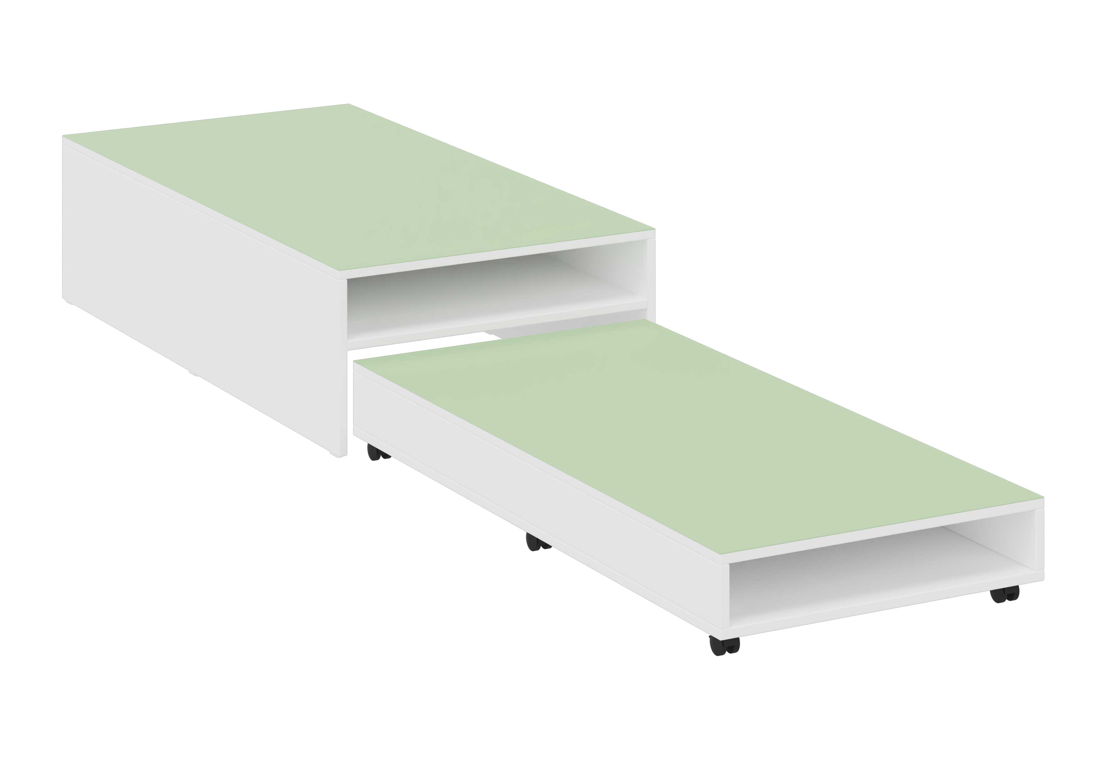 Praktisches 2-teiliges Schlafpodest, in verschiedenen Farben erhältlich. Das niedrigere Podest wird im höheren verstaut und kann einfach herausgezogen werden. Je nach Ausführung 2 bzw. 4 Schlafplätze für Matratzengröße 135 x 60 cm (z.B. Art. Nr. 772 100, bitte separat bestellen). Mit Stauraum zur Aufbewahrung der Matratzen. Belag aus Noraplan® Naturkautschuk.