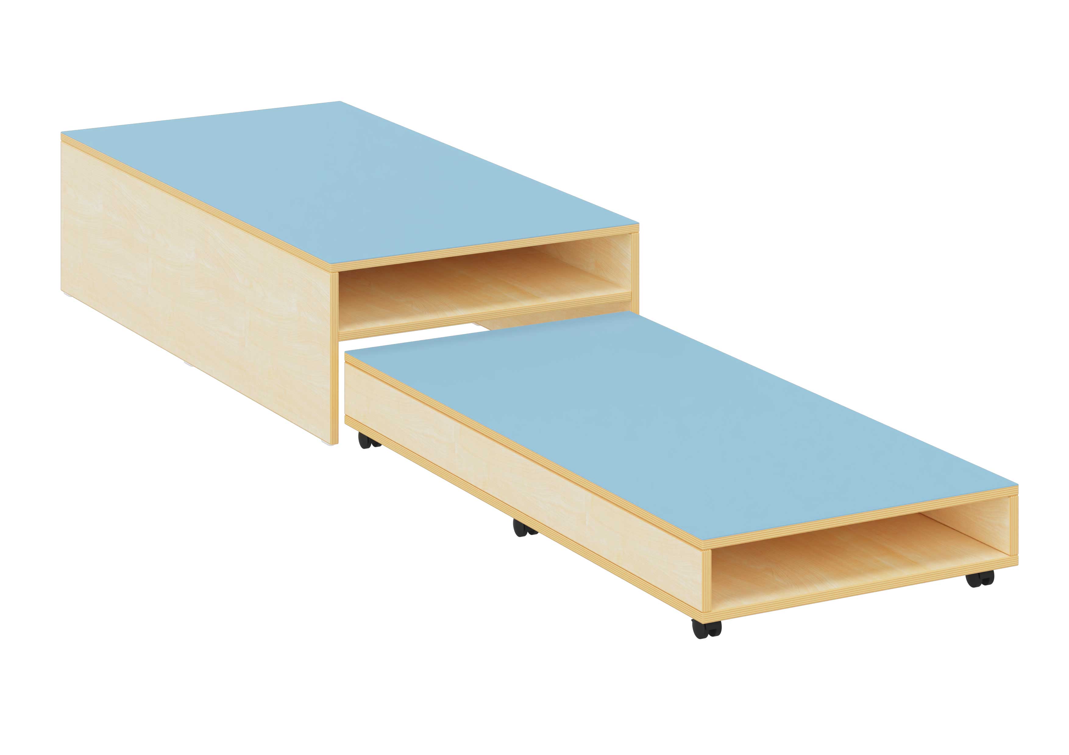 Praktisches 2-teiliges Schlafpodest, in verschiedenen Farben erhältlich. Das niedrigere Podest wird im höheren verstaut und kann einfach herausgezogen werden. Je nach Ausführung 2 bzw. 4 Schlafplätze für Matratzengröße 135 x 60 cm (z.B. Art. Nr. 772 100, bitte separat bestellen). Mit Stauraum zur Aufbewahrung der Matratzen. Belag aus Noraplan® Naturkautschuk.