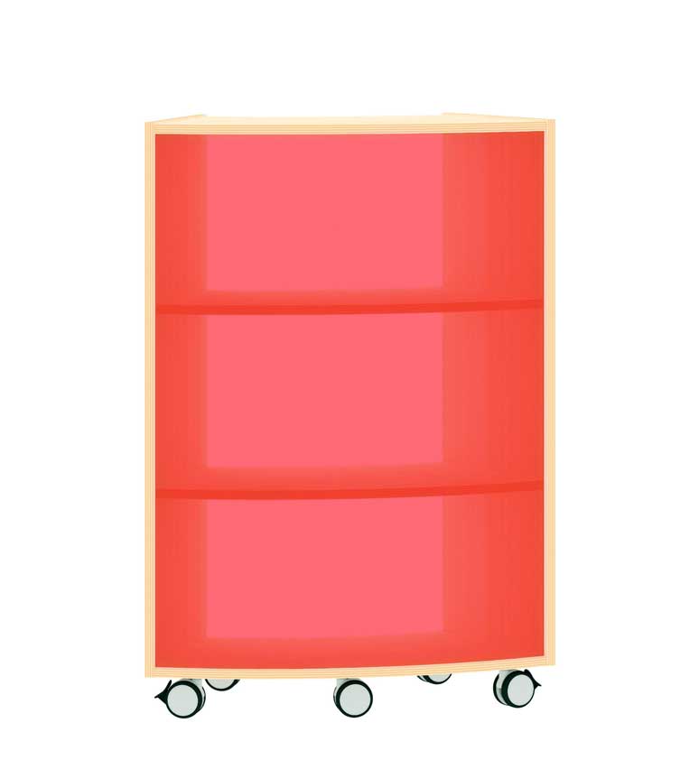 1 Bogenregal, Achtelkreis, (inklusive 5 Rollen), oberer Fachboden fest bei 77 cm Höhe, unterer Fachboden verstellbar, Achtelkreis, 45° Winkel, Breite innen 53,5 cm, Seitentiefe 40 cm, Gesamttiefe ca. 45 cm, Radien innen 70 cm, außen 110 cm