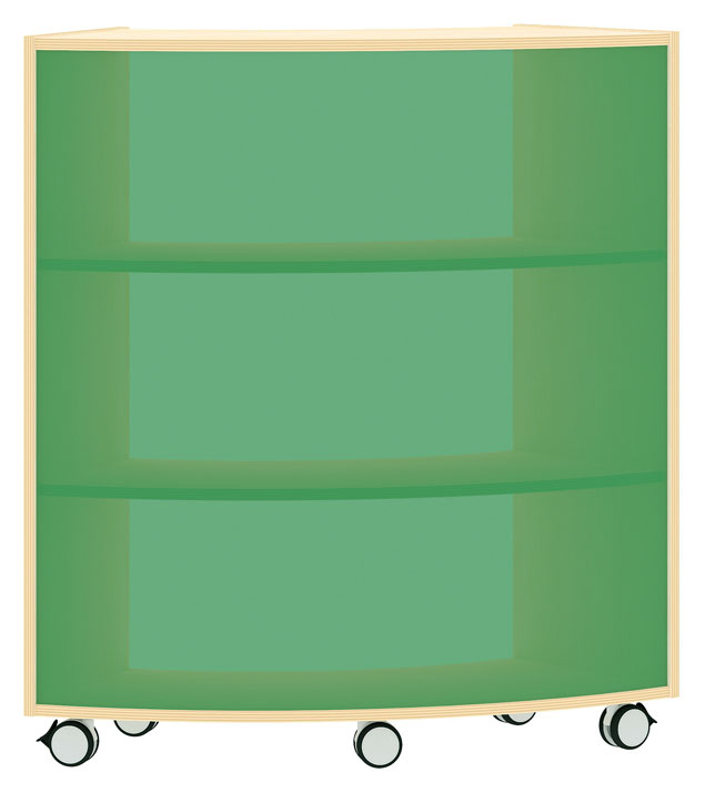 1 Bogenregal, Sechstelkreis, (auf 5 Rollen, 2 davon feststellbar), oberer Boden fest bei 77 cm Höhe, 1 Fachböden verstellbar, Sechstelkreis: 60° Winkel: innen 73,5 cm breit, Seiten: 40 cm gesamt ca. 50 cm tief, Radien: innen 70 cm, außen 110 cm