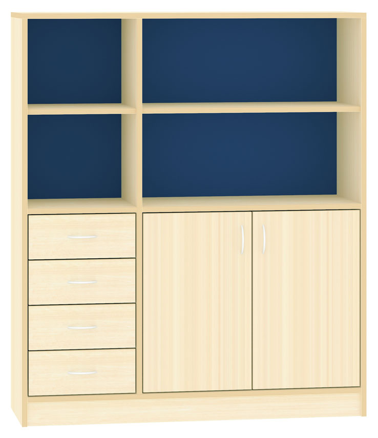 1 Schrank, (Unten 4 Schubkästen und 2 Türen, dahinter 2 verstellbare Fachböden, oben 2 Regalteile mit je 1 verstellbaren Fachboden)