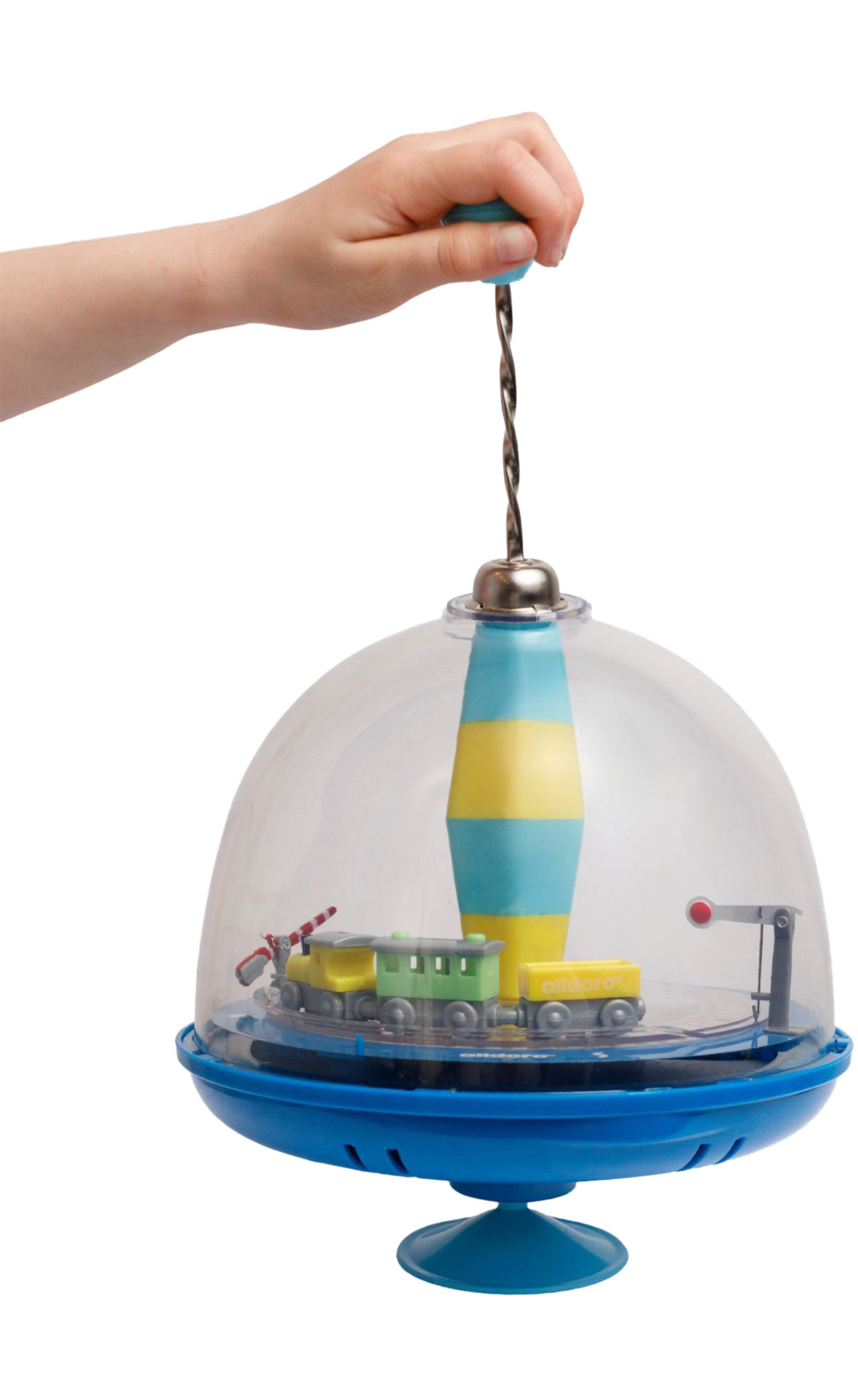 Die Lokomotive fährt mit ihren Waggons ihre Runden durch die Landschaft. Schranken und Signale bewegen sich wie bei einer echten Eisenbahn, während typische Zuggeräusche erklingen.