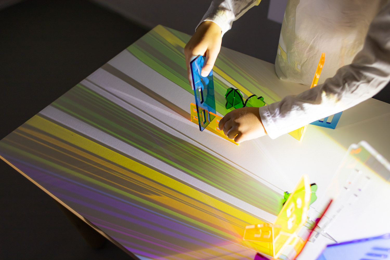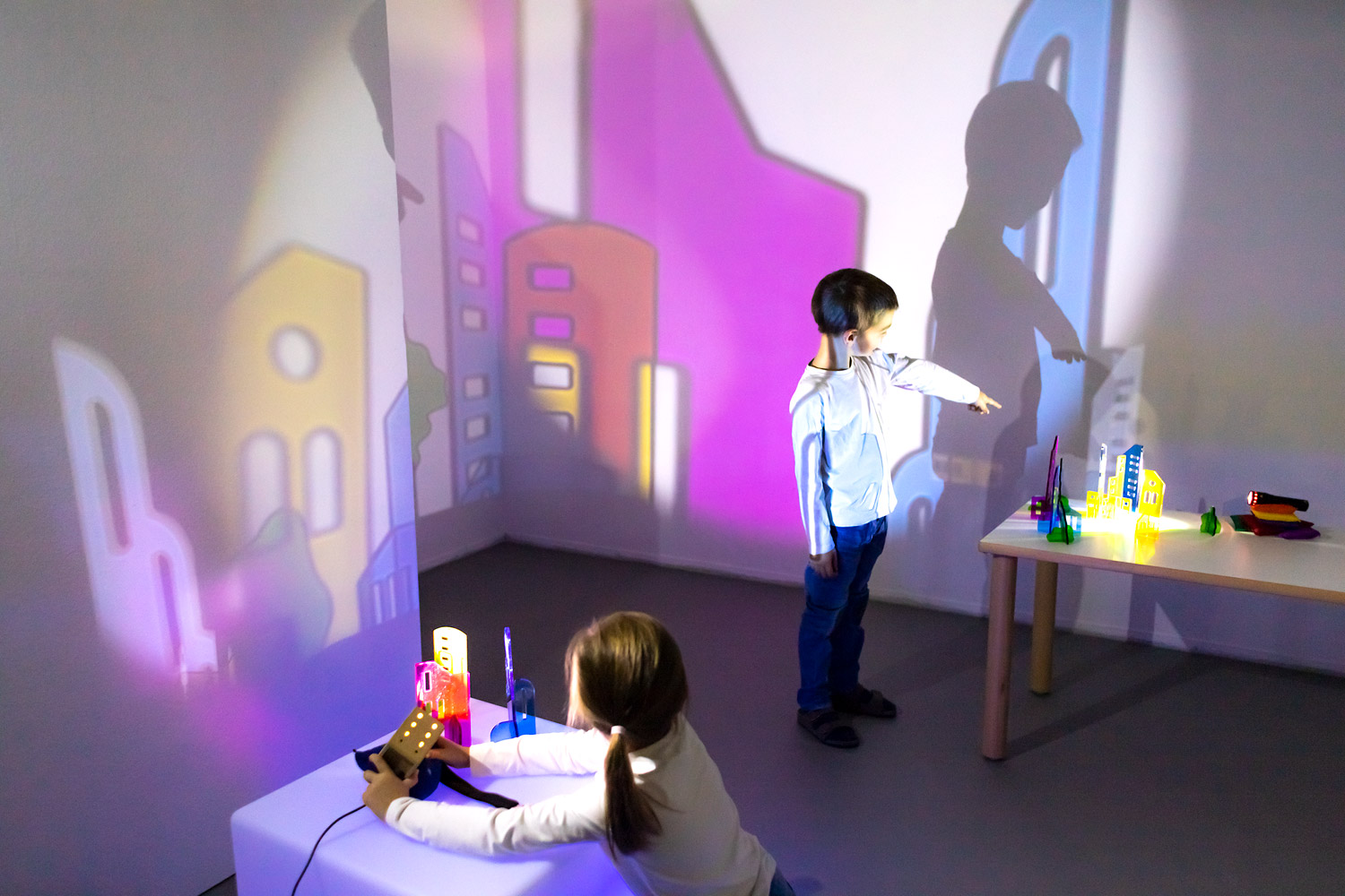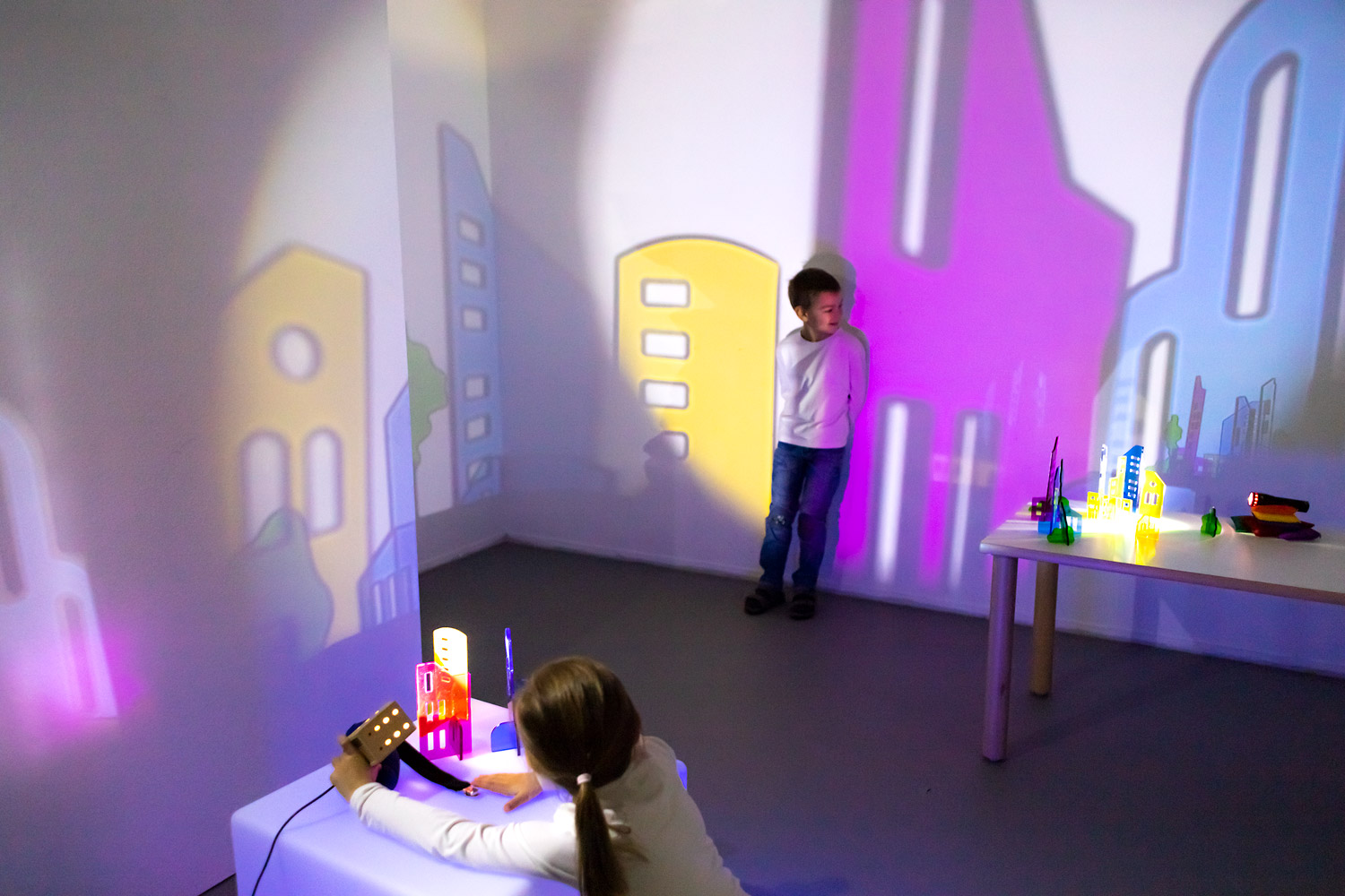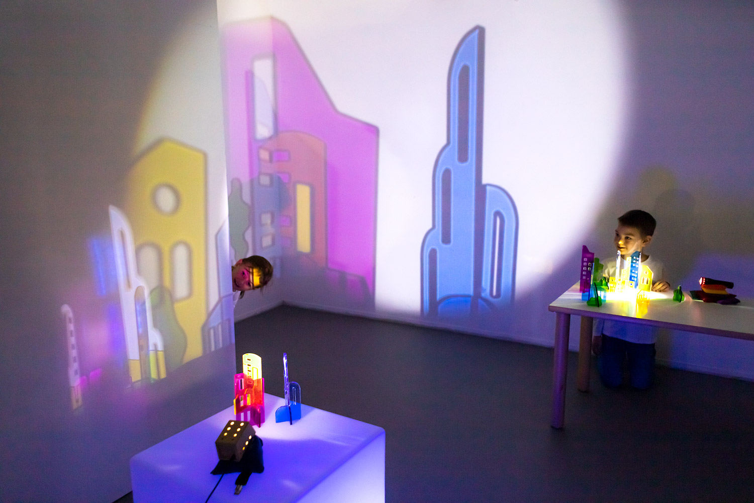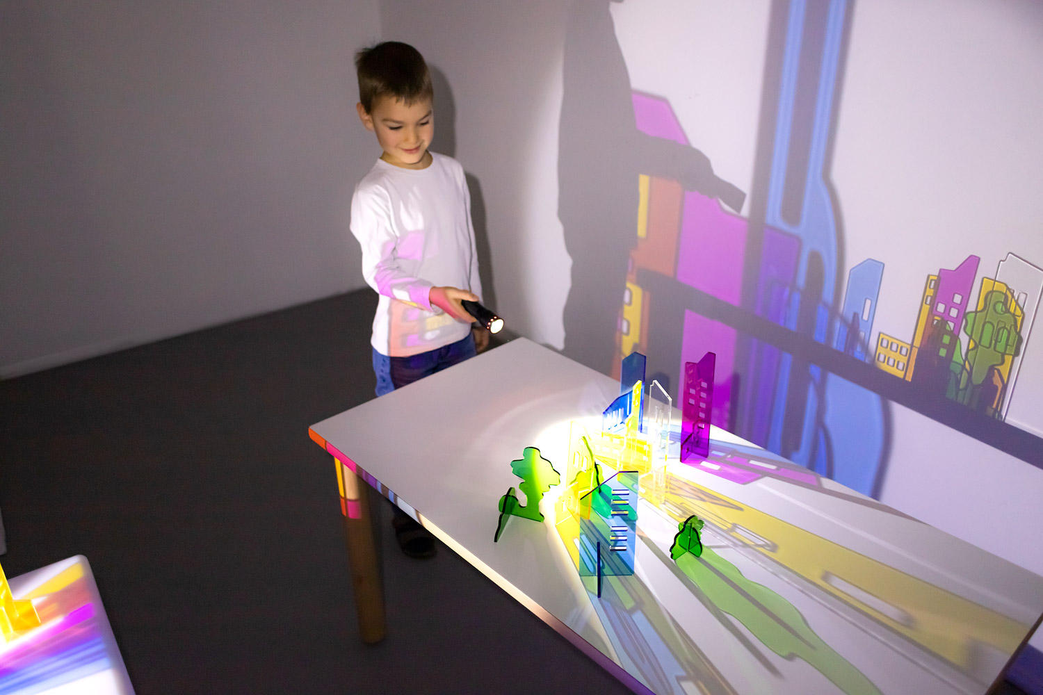 Das Phänomen Licht und Schatten fasziniert Kinder und fordert zum Experimentieren auf. Beim Beleuchten entstehen farbige Schatten einer Stadt, die sich effektvoll untereinander mischen. Kleine Häuser werden in der Projektion an der Wand zu einer beeindruckend großen, leuchtenden Skyline. Die unterschiedlich gestalteten Ober- und Unterteile lassen sich miteinander kombinieren und fantasievoll zusammensetzen.