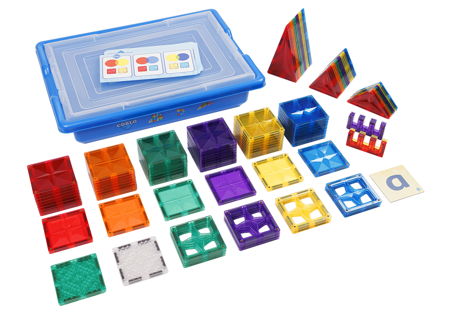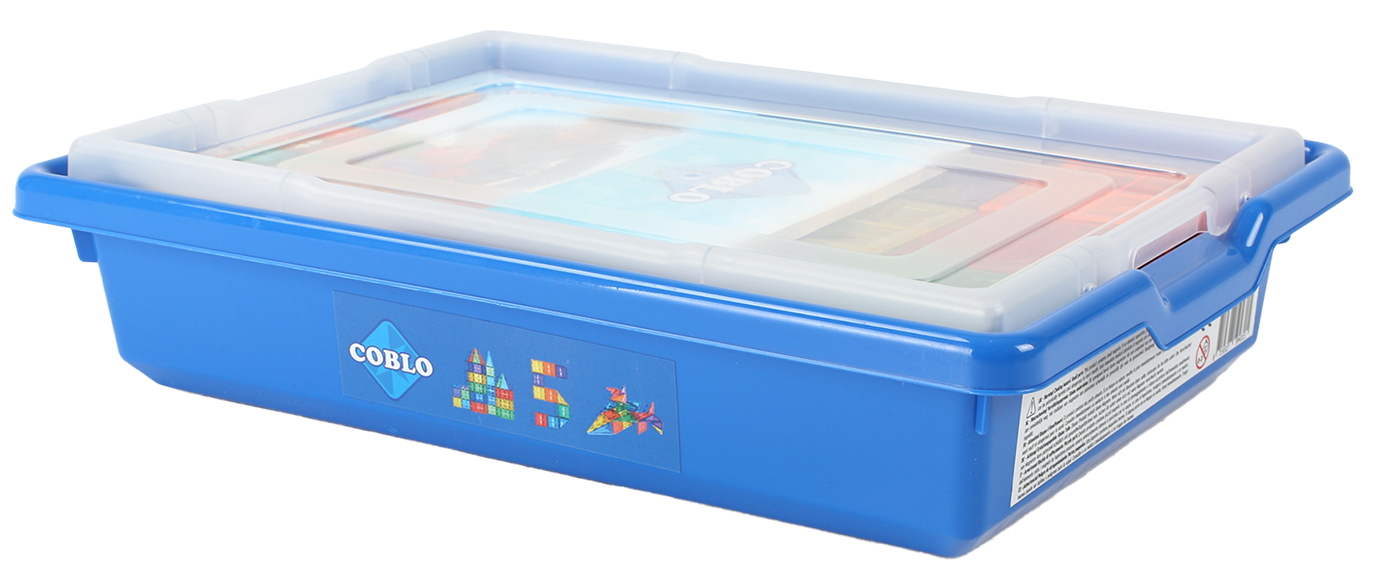 100 magnetische Teile (z. B. Quadrat 7,5 x 7,5 cm) 1 Inspirationsbuch (21 x 14,2 cm) 14 Aufgabenkarten (19,5 x 10 cm) mit 74 pädagogischen Aufgabenstellungen 1 Kunststoffbox aus mit Druckdeckel (40 x 29 x 9,5 cm)