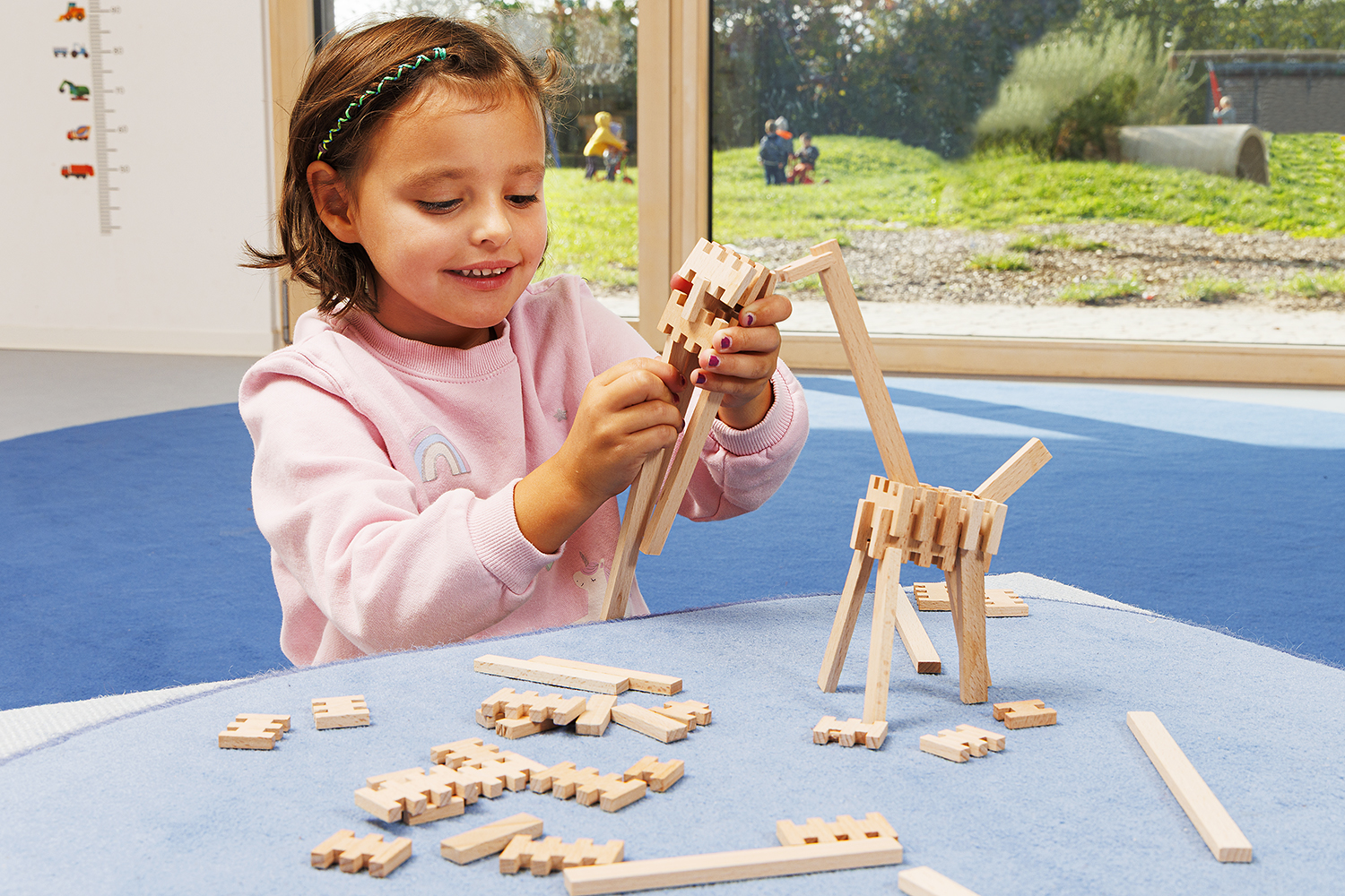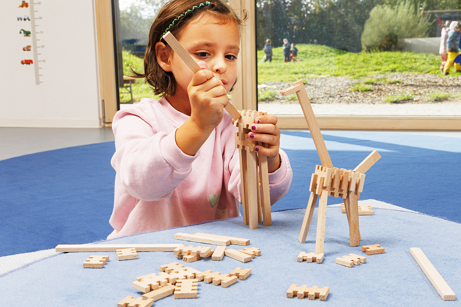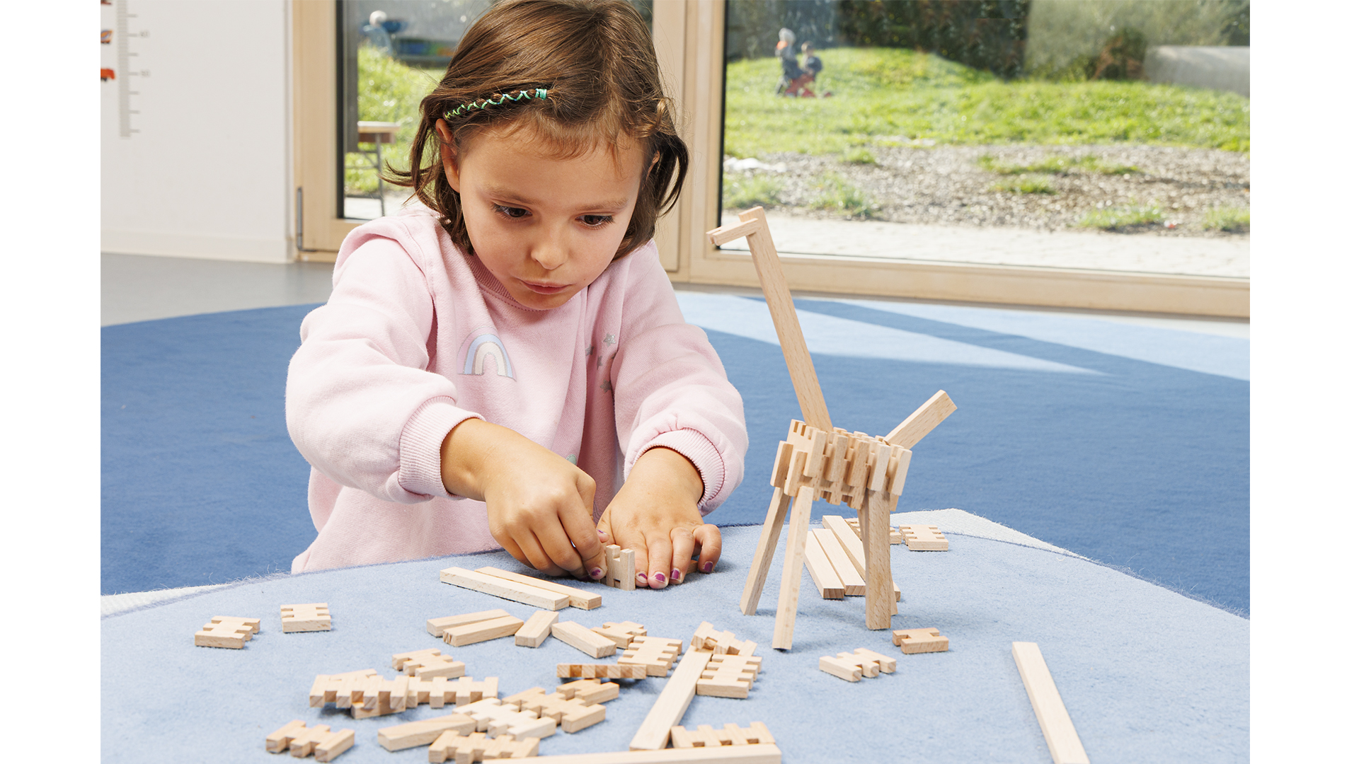 Das comblo® Basic bietet eine umfangreiche Auswahl an Bausteinen, mit denen sich unterschiedlichste Tiere, Bauwerke und abstrakte Gebilde mit ganz eigener Ästhetik gestalten lassen. Das Set eignet sich ideal für den Einsatz im Kindergarten: robust, übersichtlich und aus hochwertigem Buchenholz gefertigt. Schritt-für-Schritt-Anleitungen unterstützen den Einstieg, lassen aber gleichzeitig genug Raum für freies Spiel und eigene Lösungen – alleine, zu zweit oder in der Kleingruppe.