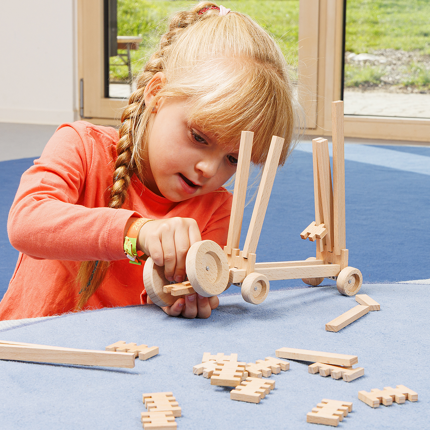 67-teiliges Set, bestehend aus: - 40 Steine in 4 verschiedenen Größen - 12 Räder (8 x klein, 4 x groß) - 15 Achsen in 3 verschiedenen Größen, aus Kunststoff - 1 x Inspirationsheft mit kreativen Ideen - 6 x diverse Schritt-für-Schritt Anleitungen - 1 x Karton (20 x 19 x 5,5 cm)