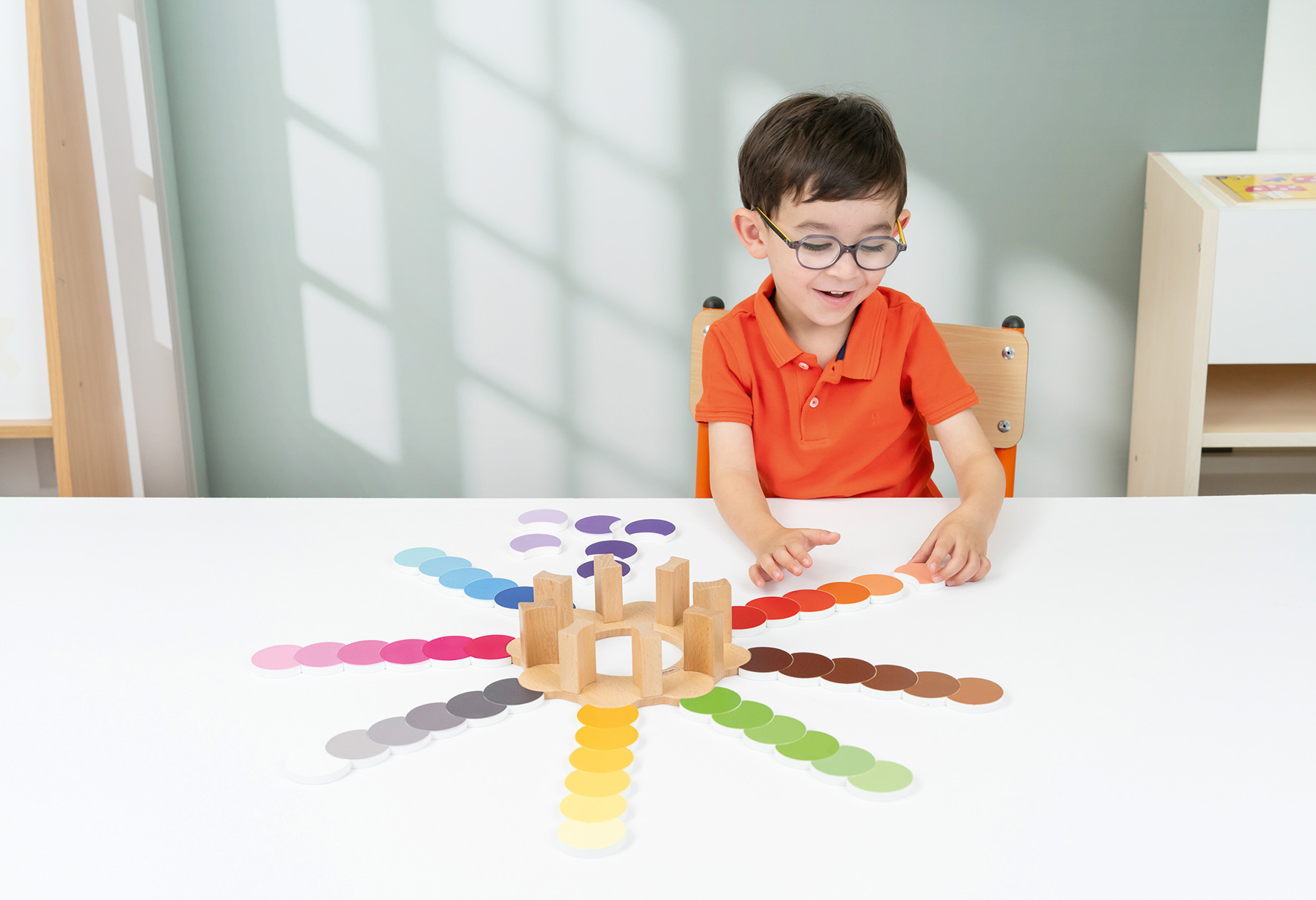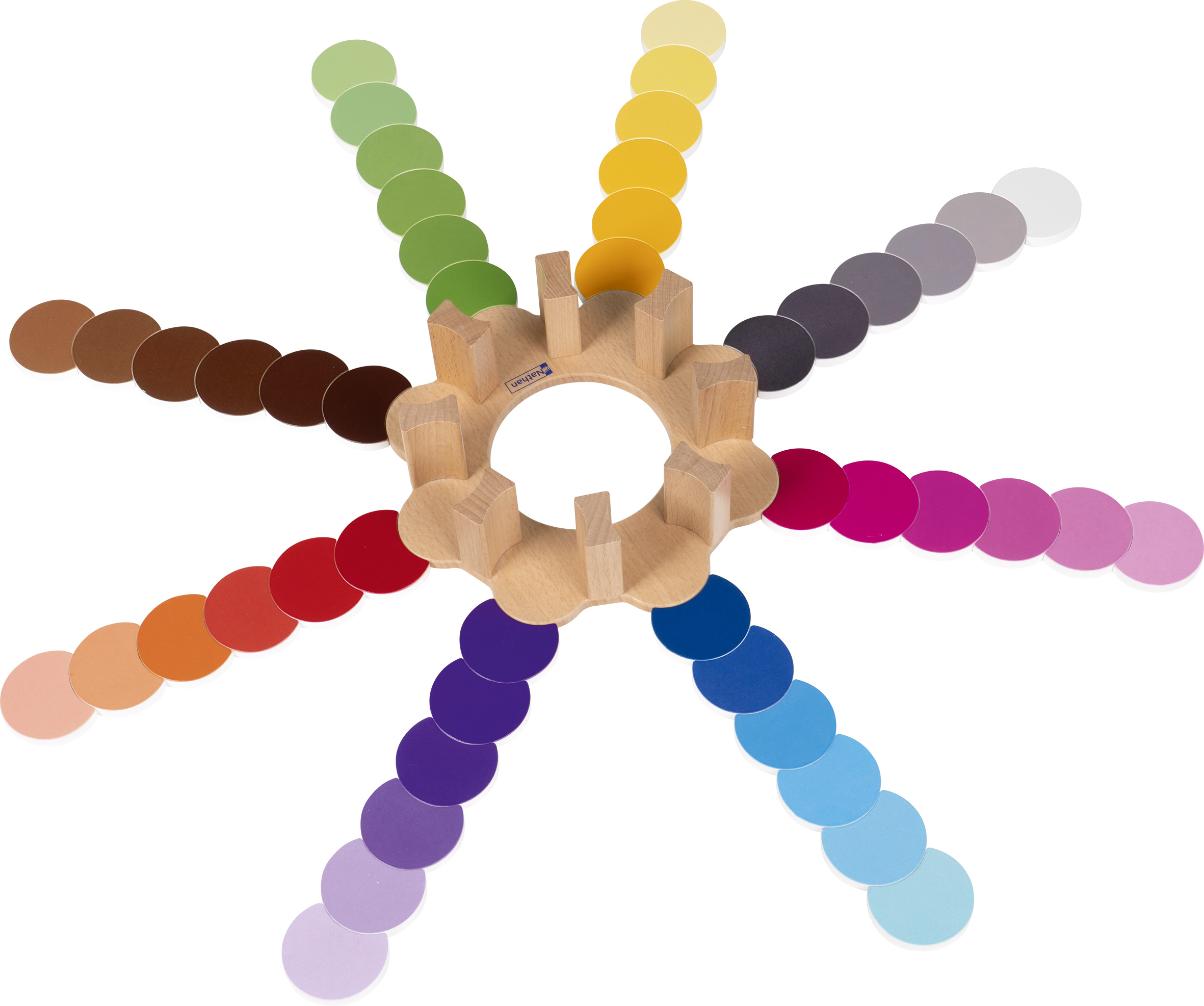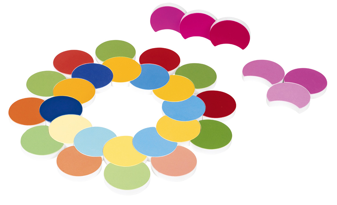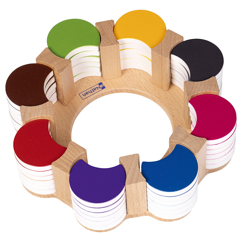 Mit der Farbenblume lernen Kinder Farbtöne vom Dunkelsten zum Hellsten zu ordnen, um eine fortschreitende Abstufung zu erschaffen. Als eine Adaptation der Sinnesübungen der Montessori Pädagogik führt diese Farbblume mit acht Farbfamilien das Kind in die visuelle Unterscheidung der Farben.