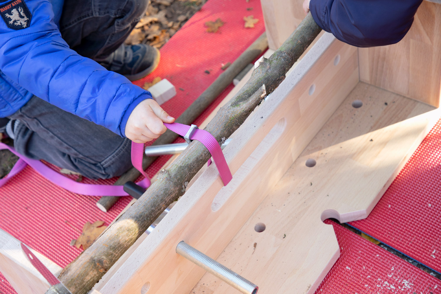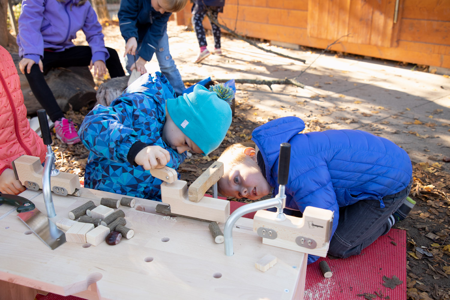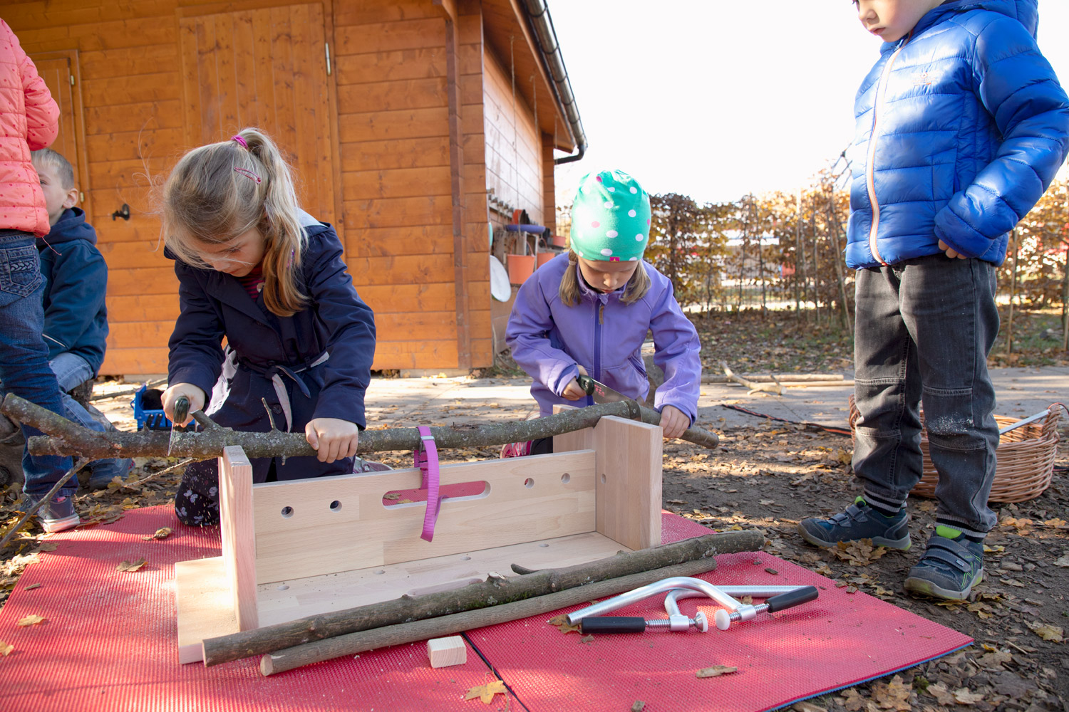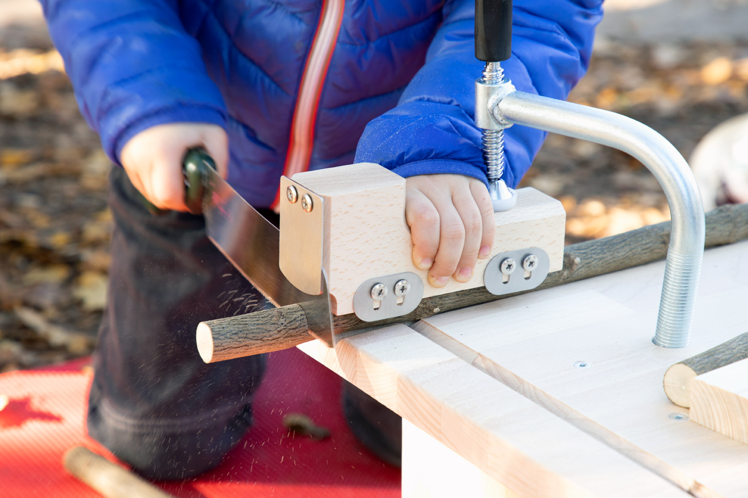 Die Dusy Werkbank ist klein - so kann sie leicht an den richtigen Ort getragen werden - drinnen und draußen: in den Projektraum, in die schattige Ecke, unters Vordach, in den Werkraum. Draußen gibt es viel Platz zum Hantieren und Zuschauen, Geräusche verhallen und Sägemehl muss nicht gefegt werden. Die niedrige Bank steht immer stabil. 2 Kinder können daran von allen Seiten arbeiten: stehend mit der Kraft aus dem ganzen Körper, kniend und sitzend für kleine, feine Arbeiten. Festspannen: Die Werkbank wird mit zwei Schraubzwingen geliefert, die zum Festspannen in die Bohrungen gesteckt werden. Zusammen mit den Aussparungen und Kerben gibt es viele Möglichkeiten auch runde Werkstücke sicher zu spannen. Größere Kinder schaffen das selbst– Erwachsene sollten dennoch überprüfen und nachziehen. Durch Drehen der Bank finden sich viele Möglichkeiten um z.B. größere Äste auch mit Gurten zu sichern. Arbeitsbereich: Als Unterlage markieren draußen Gymnastikmatten (518 586) eindeutig den Arbeitsbereich und schützen vor einem kalten Boden. Drinnen verhindern sie ein Rutschen auf glatten Böden oder Tischen und die Schallübertragung. Die Werkbank ermöglicht das sichere Gestalten, Forschen und Konstruieren mit freien Materialien.