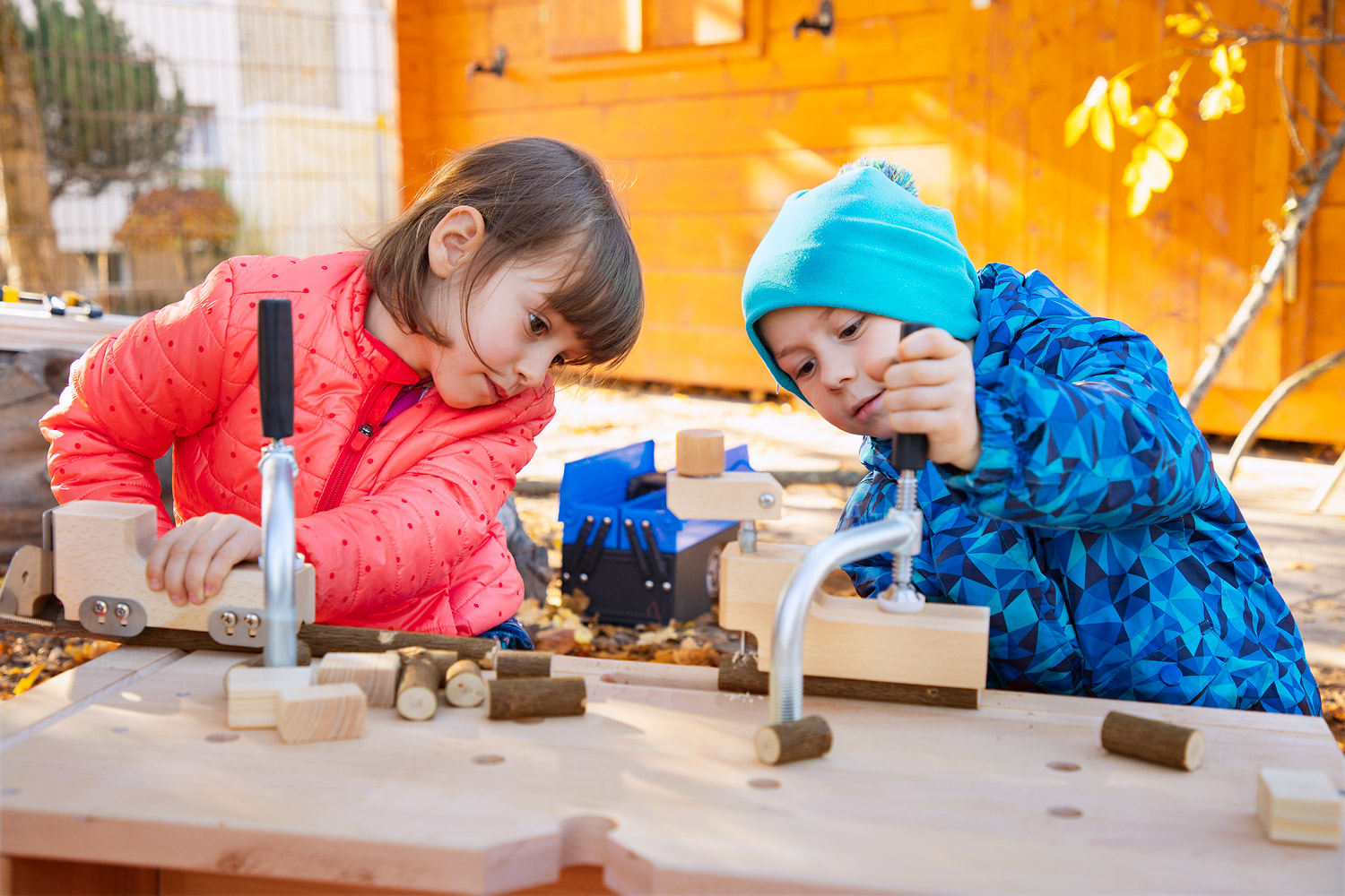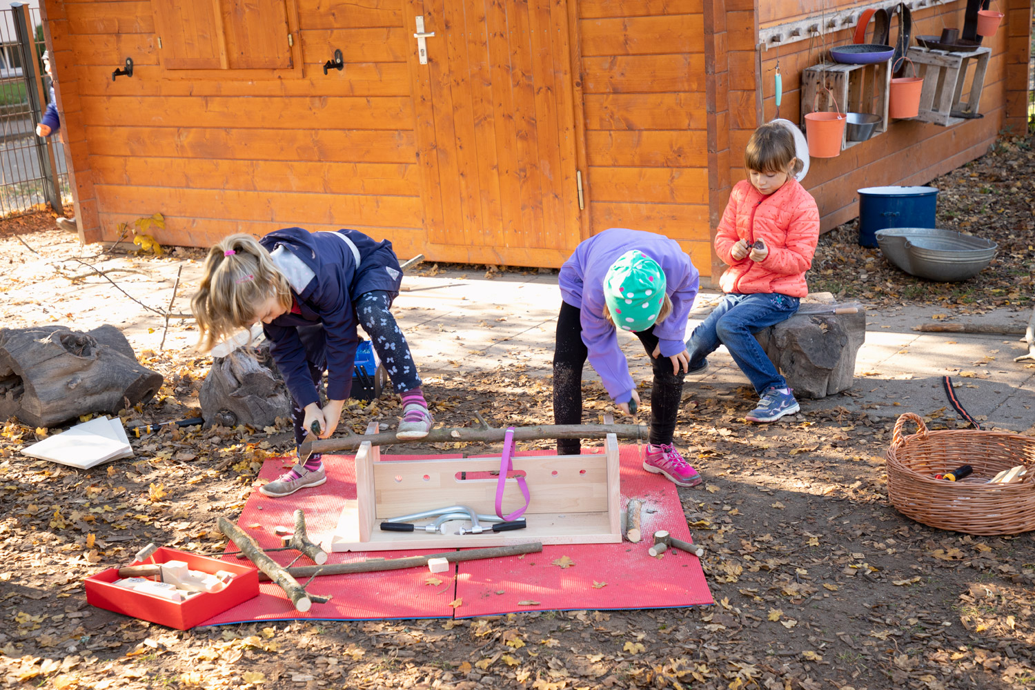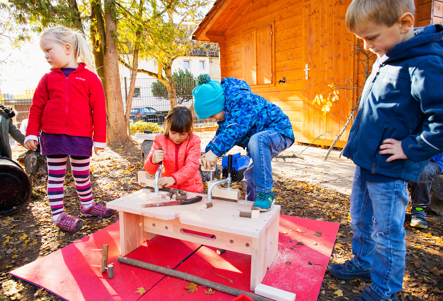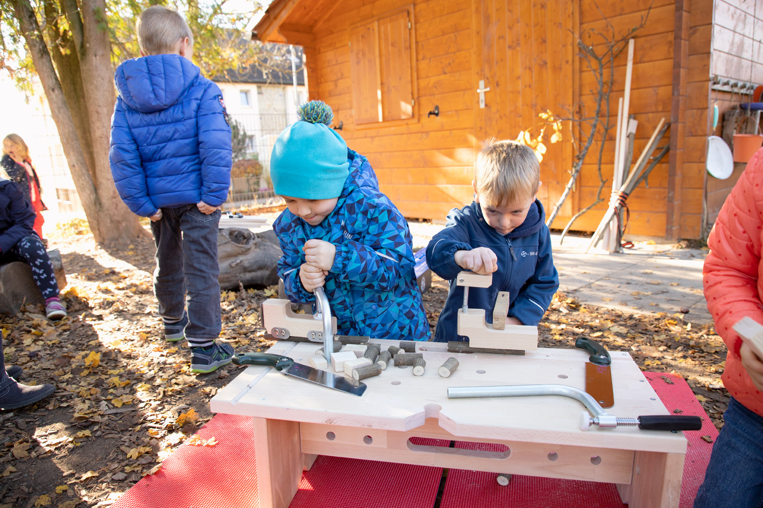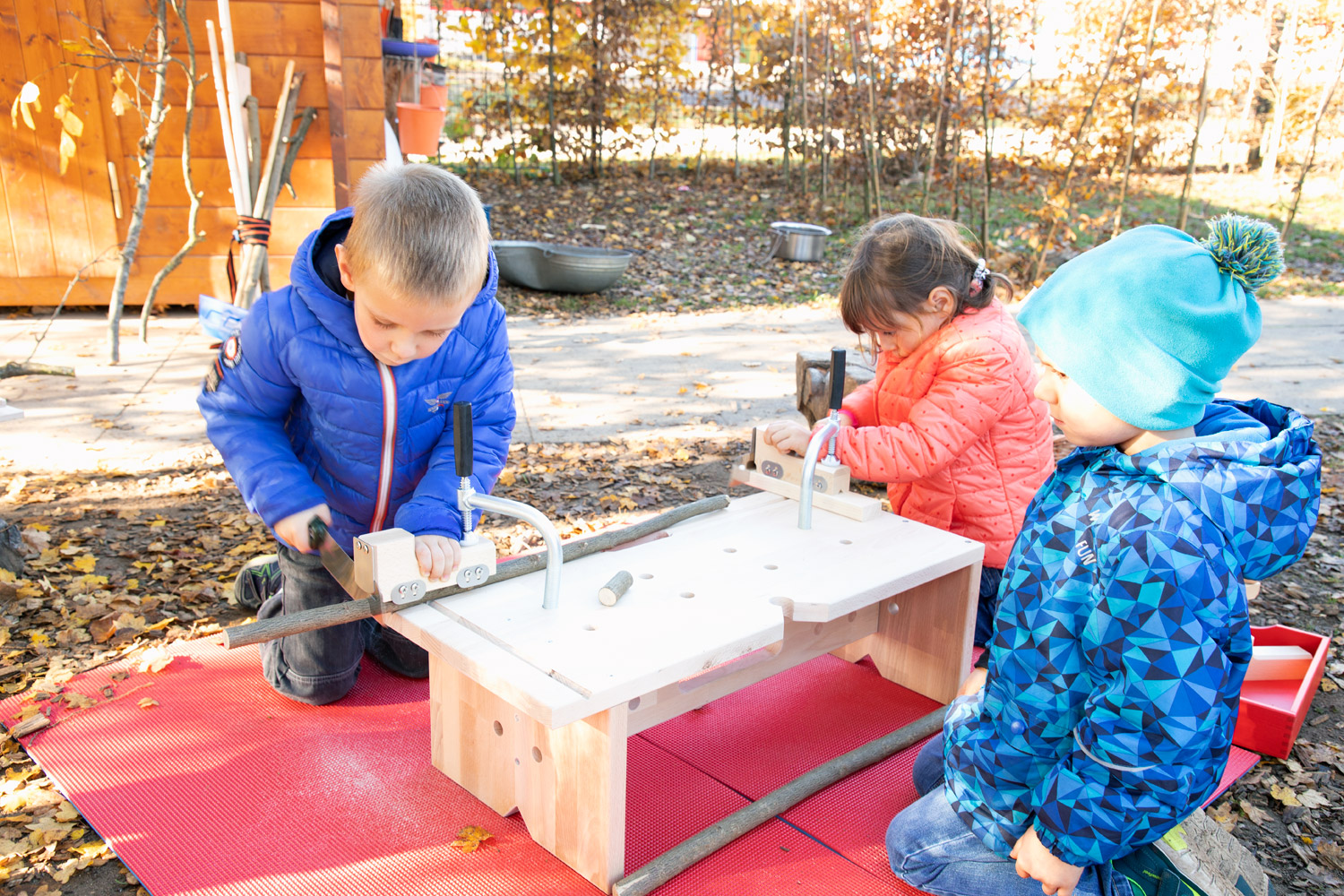 Die Dusy Werkbank ist klein - so kann sie leicht an den richtigen Ort getragen werden - drinnen und draußen: in den Projektraum, in die schattige Ecke, unters Vordach, in den Werkraum. Draußen gibt es viel Platz zum Hantieren und Zuschauen, Geräusche verhallen und Sägemehl muss nicht gefegt werden. Die niedrige Bank steht immer stabil. 2 Kinder können daran von allen Seiten arbeiten: stehend mit der Kraft aus dem ganzen Körper, kniend und sitzend für kleine, feine Arbeiten. Festspannen: Die Werkbank wird mit zwei Schraubzwingen geliefert, die zum Festspannen in die Bohrungen gesteckt werden. Zusammen mit den Aussparungen und Kerben gibt es viele Möglichkeiten auch runde Werkstücke sicher zu spannen. Größere Kinder schaffen das selbst– Erwachsene sollten dennoch überprüfen und nachziehen. Durch Drehen der Bank finden sich viele Möglichkeiten um z.B. größere Äste auch mit Gurten zu sichern. Arbeitsbereich: Als Unterlage markieren draußen Gymnastikmatten (518 586) eindeutig den Arbeitsbereich und schützen vor einem kalten Boden. Drinnen verhindern sie ein Rutschen auf glatten Böden oder Tischen und die Schallübertragung. Die Werkbank ermöglicht das sichere Gestalten, Forschen und Konstruieren mit freien Materialien.