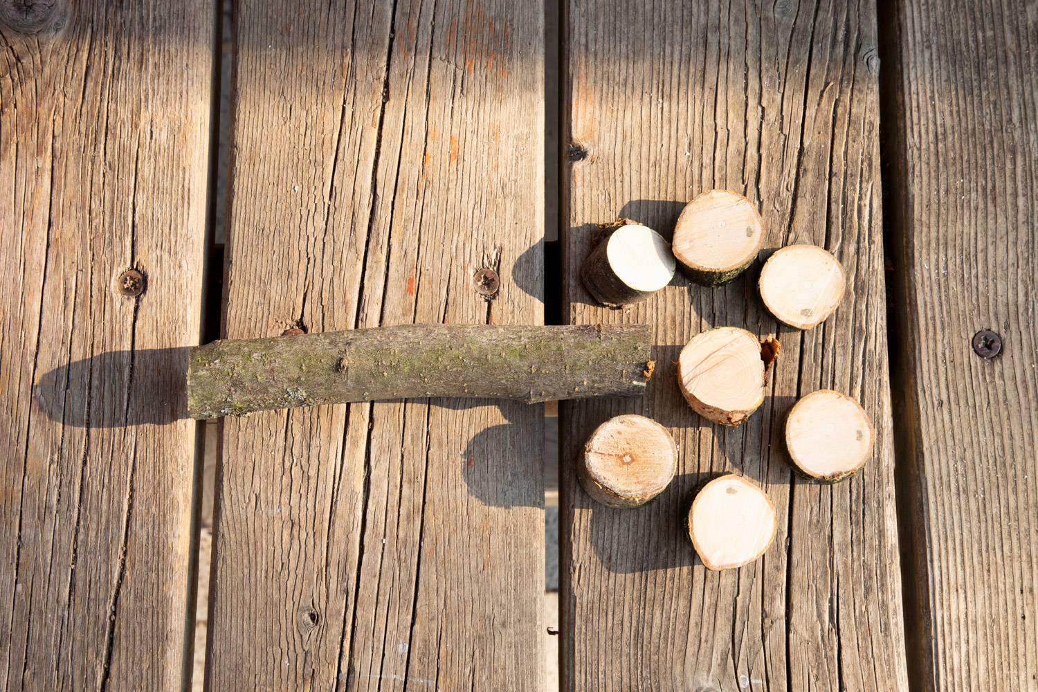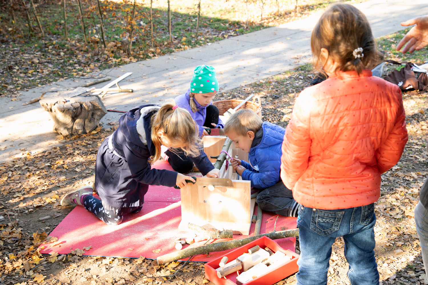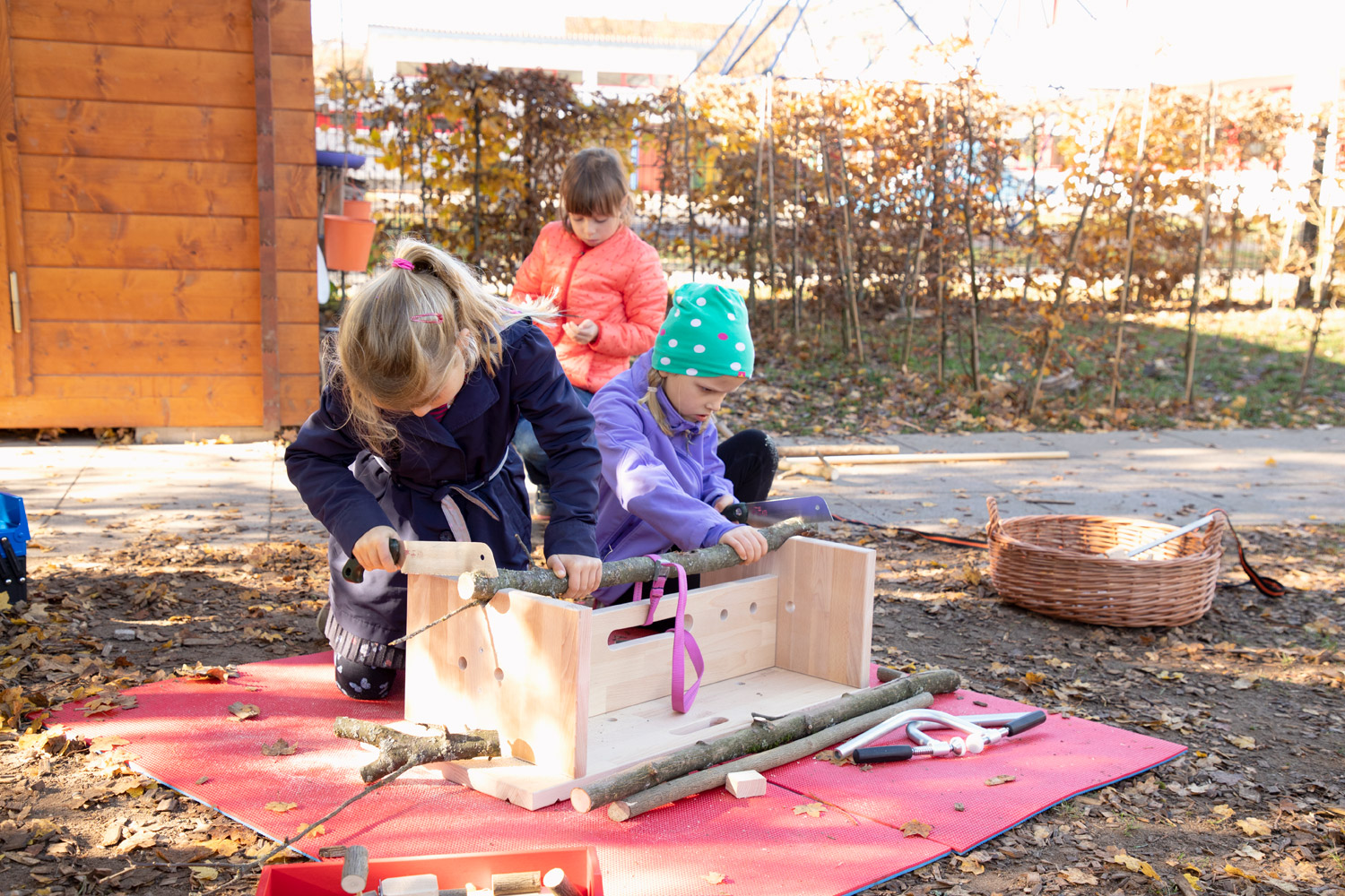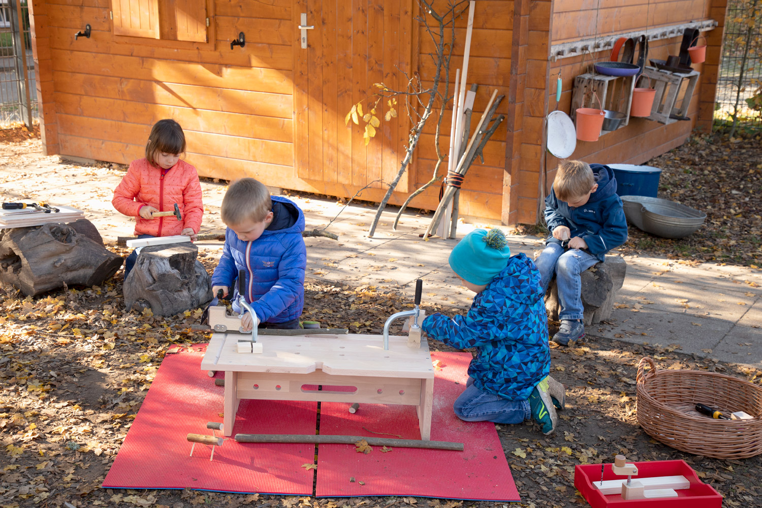 Die Dusy Werkbank ist klein - so kann sie leicht an den richtigen Ort getragen werden - drinnen und draußen: in den Projektraum, in die schattige Ecke, unters Vordach, in den Werkraum. Draußen gibt es viel Platz zum Hantieren und Zuschauen, Geräusche verhallen und Sägemehl muss nicht gefegt werden. Die niedrige Bank steht immer stabil. 2 Kinder können daran von allen Seiten arbeiten: stehend mit der Kraft aus dem ganzen Körper, kniend und sitzend für kleine, feine Arbeiten. Festspannen: Die Werkbank wird mit zwei Schraubzwingen geliefert, die zum Festspannen in die Bohrungen gesteckt werden. Zusammen mit den Aussparungen und Kerben gibt es viele Möglichkeiten auch runde Werkstücke sicher zu spannen. Größere Kinder schaffen das selbst– Erwachsene sollten dennoch überprüfen und nachziehen. Durch Drehen der Bank finden sich viele Möglichkeiten um z.B. größere Äste auch mit Gurten zu sichern. Arbeitsbereich: Als Unterlage markieren draußen Gymnastikmatten (518 586) eindeutig den Arbeitsbereich und schützen vor einem kalten Boden. Drinnen verhindern sie ein Rutschen auf glatten Böden oder Tischen und die Schallübertragung. Die Werkbank ermöglicht das sichere Gestalten, Forschen und Konstruieren mit freien Materialien.