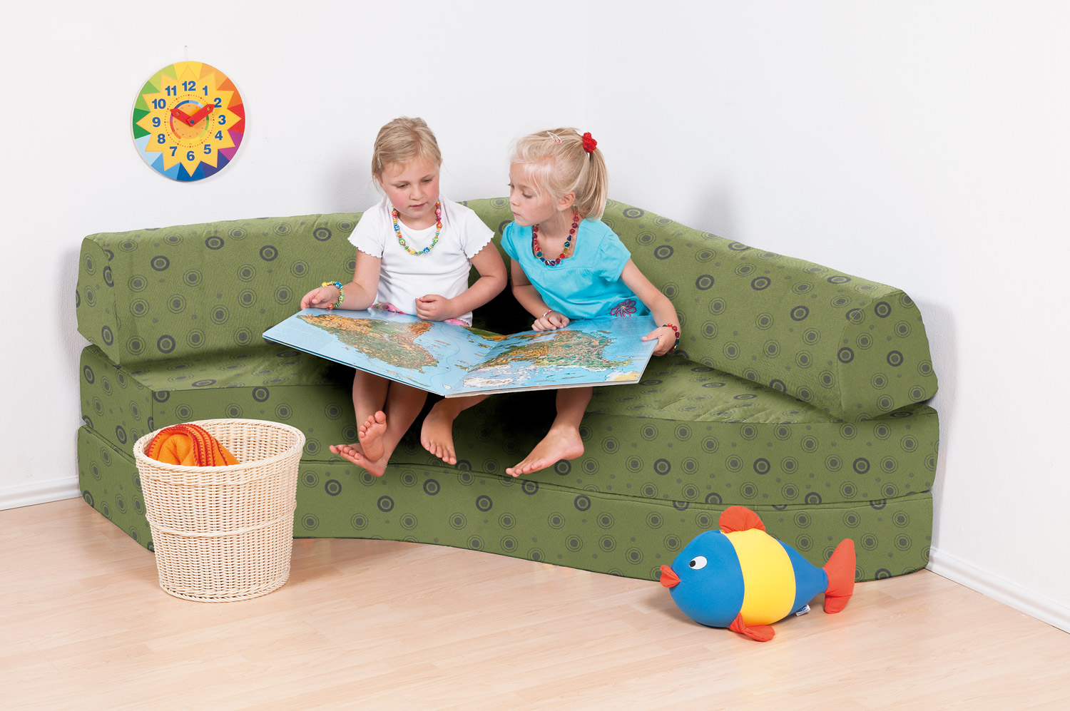 Angenehm gerundetes Ecksofa, bestehend aus zwei einzelnen, aufeinanderliegenden Sitzpolstern.