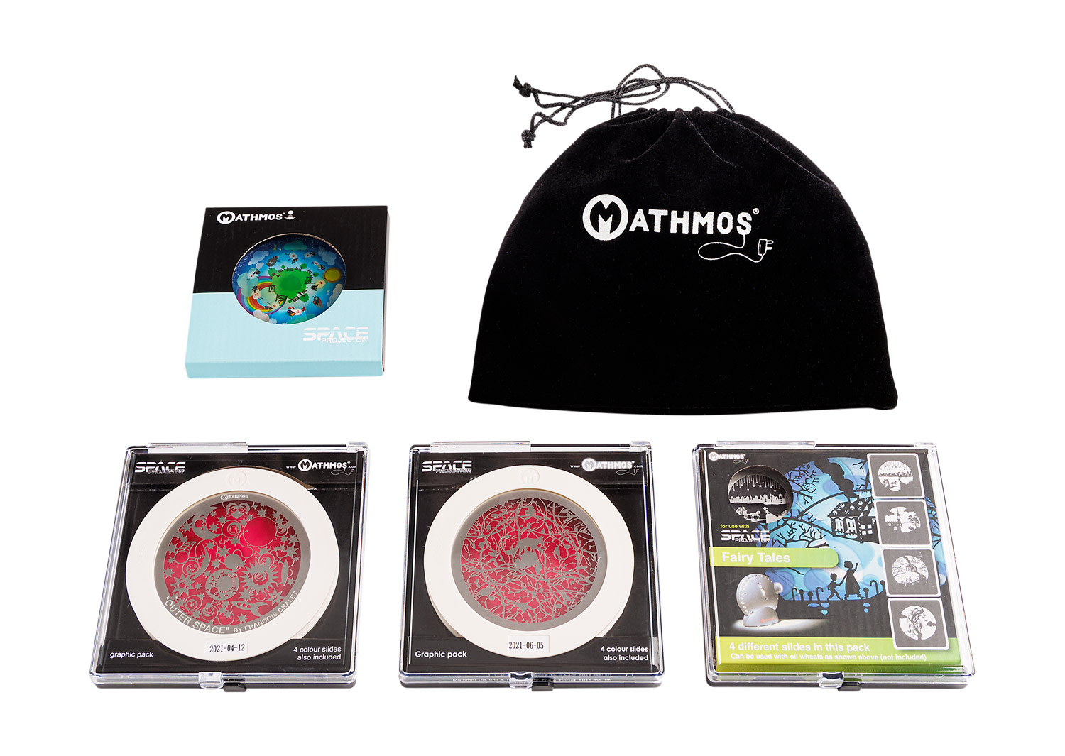 Graphik- und Dia-Paket für abwechslungsreiche, effektvolle Projektionen auf dem Mathmos® Space Projektor 531 573 (bitte separat bestellen).