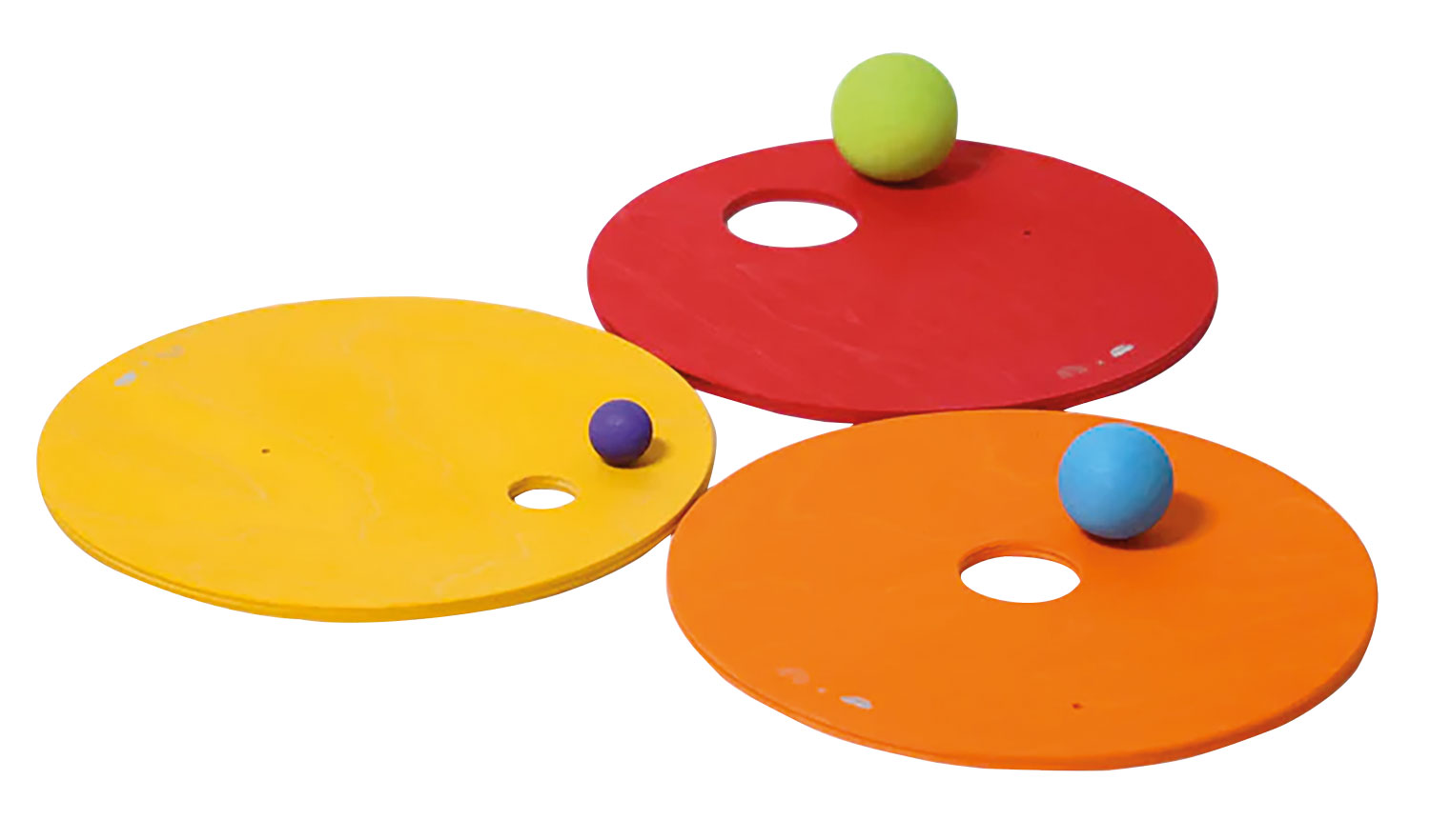 1 Set, (je 3 Kullerscheiben - Ø 21,3 cm, in drei verschiedenen Farben und drei verschieden große Löcher, je 3 Holzkugeln in drei verschiedenen Farben und Größen - 2 cm, 3,5 cm, 4,5 cm)