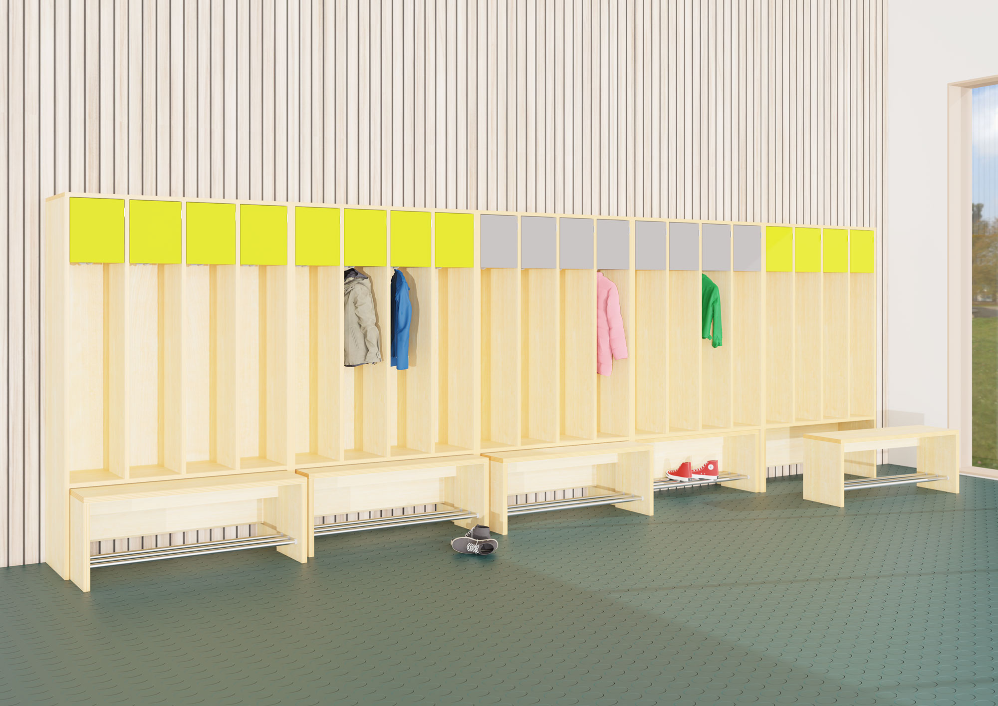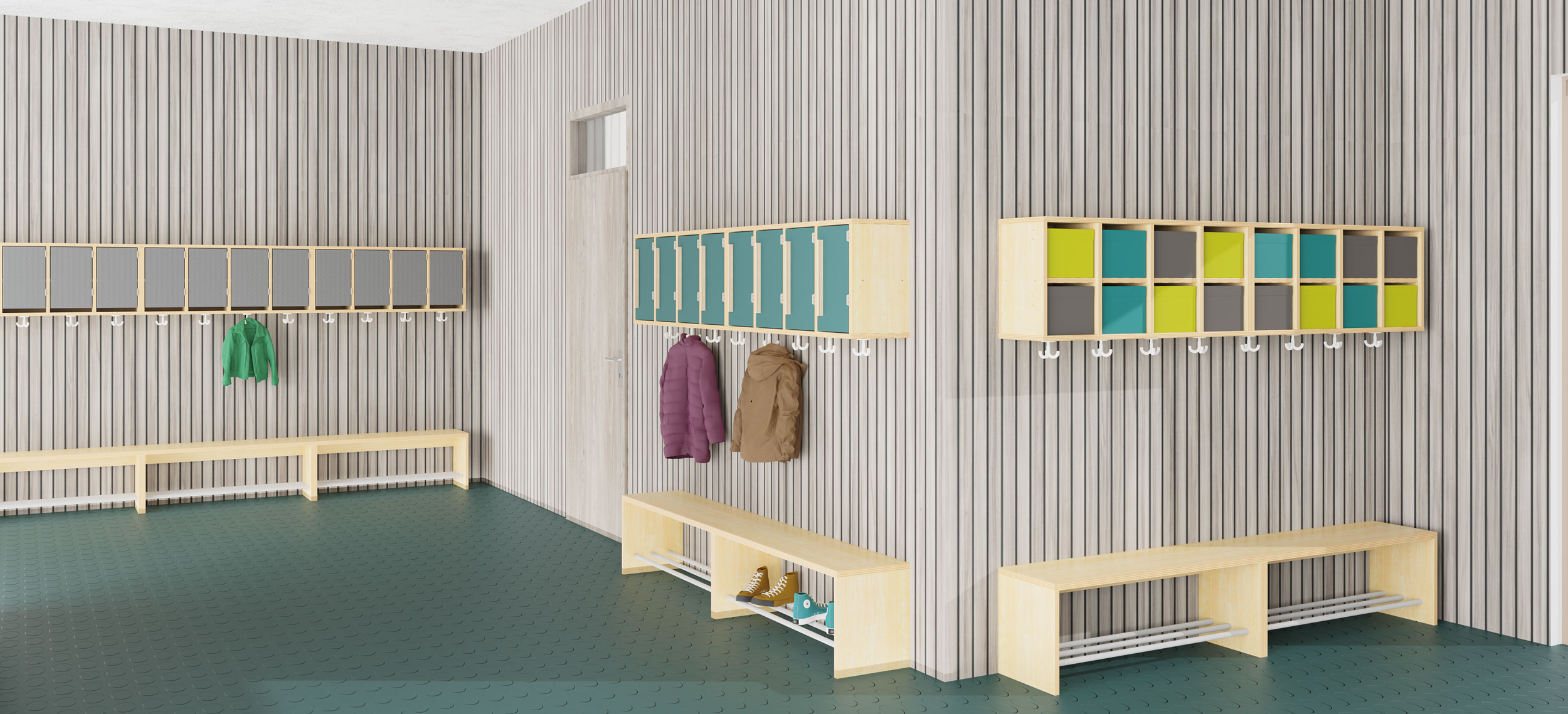Kinderlachen, freudiges Begrüßen, entspanntes Ankommen in schöner Atmosphäre, dies gelingt mit unserem neuen Garderobensystem hej.