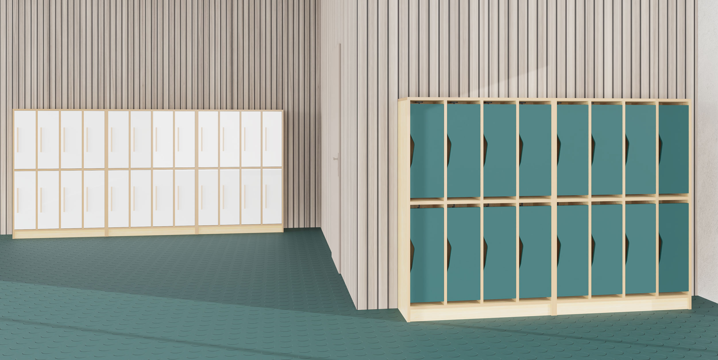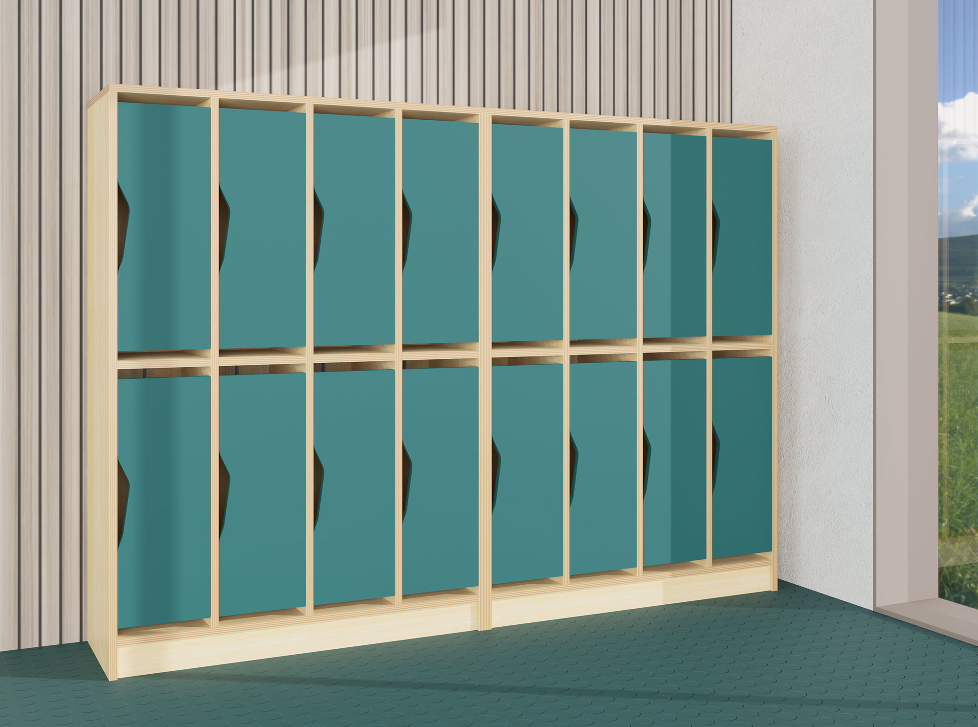 Tür mit formschöner Griff-Ausfräsung passend zur gewählten hej Fachgarderobe F. Erhältlich in den Dekoren Buche, Ahorn, weiß, grau, petrol oder hellgrün.