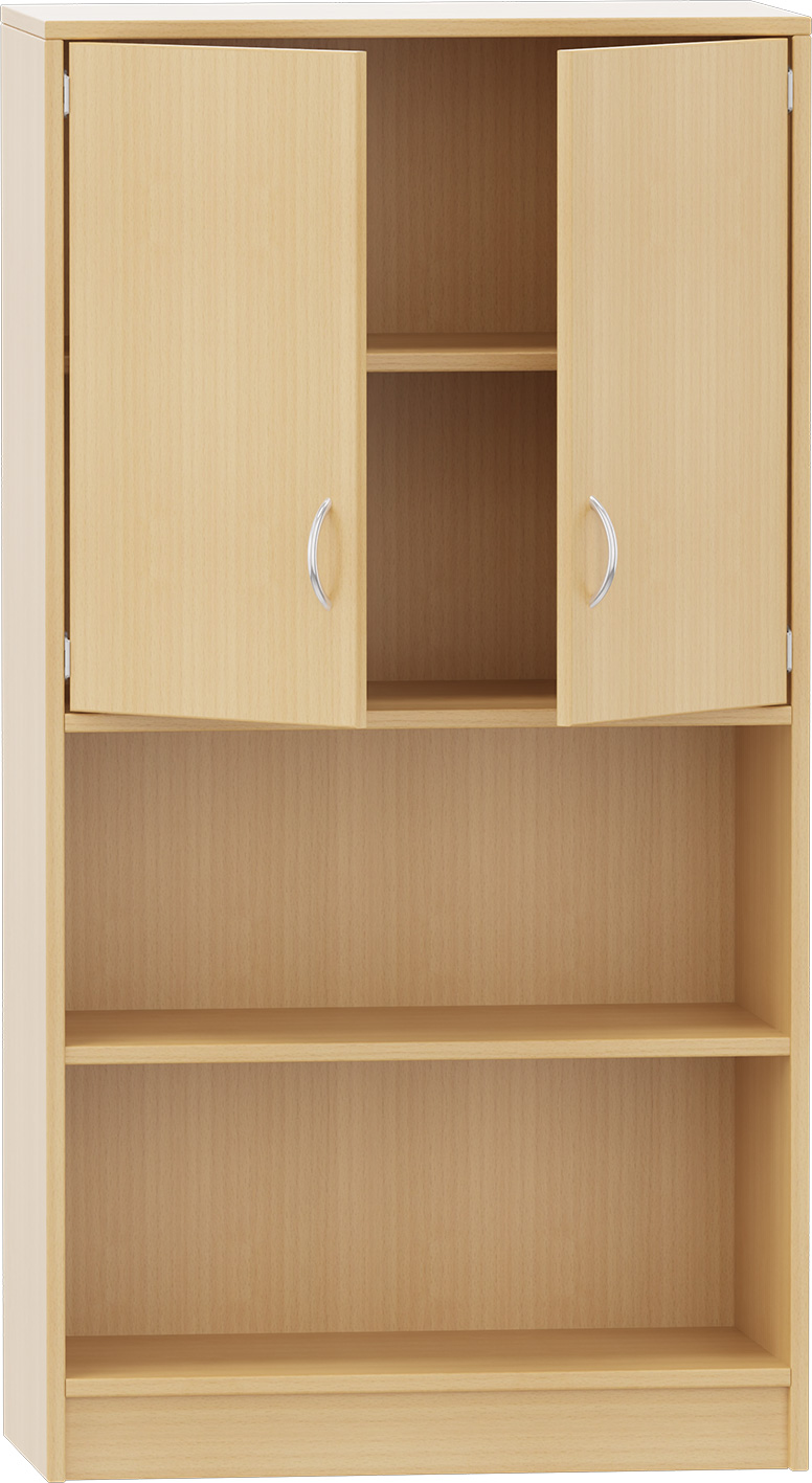 1 Schrank, (Oben 2 Türen, dahinter 1 verstellbarer Fachboden, unten offen mit einem verstellbaren Fachboden)