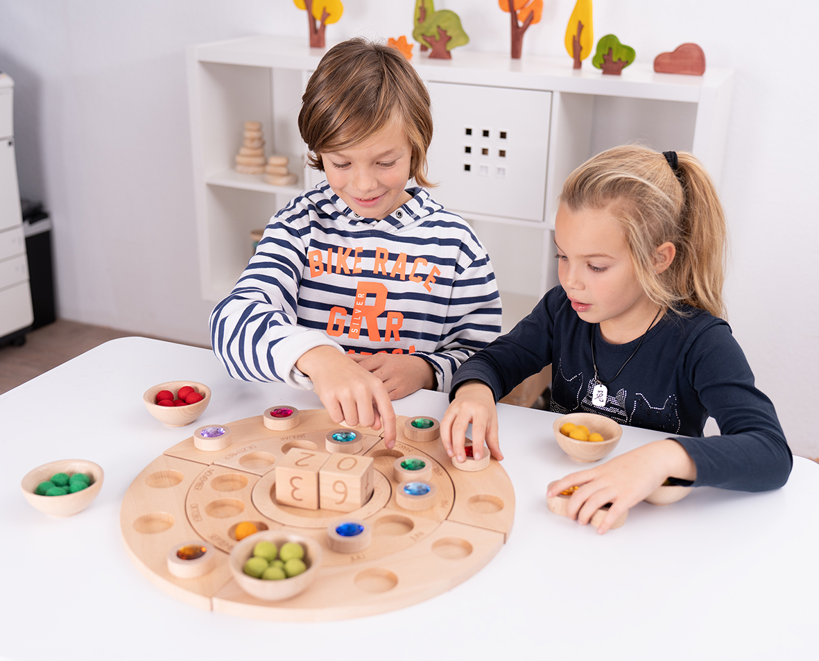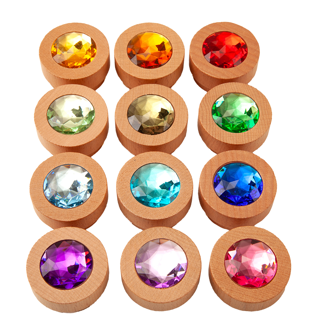 Die runden in Holz gefassten Funkelsteine begeistern die Kinder, denn es sind richtige Schatzsteine. Die Schmucksteine sind stapelbar und eignen sich perfekt für Legespiele, zum Bauen und Spielen, für Weihnachtsdeko und den Einsatz im Jahreszeitenkreis.