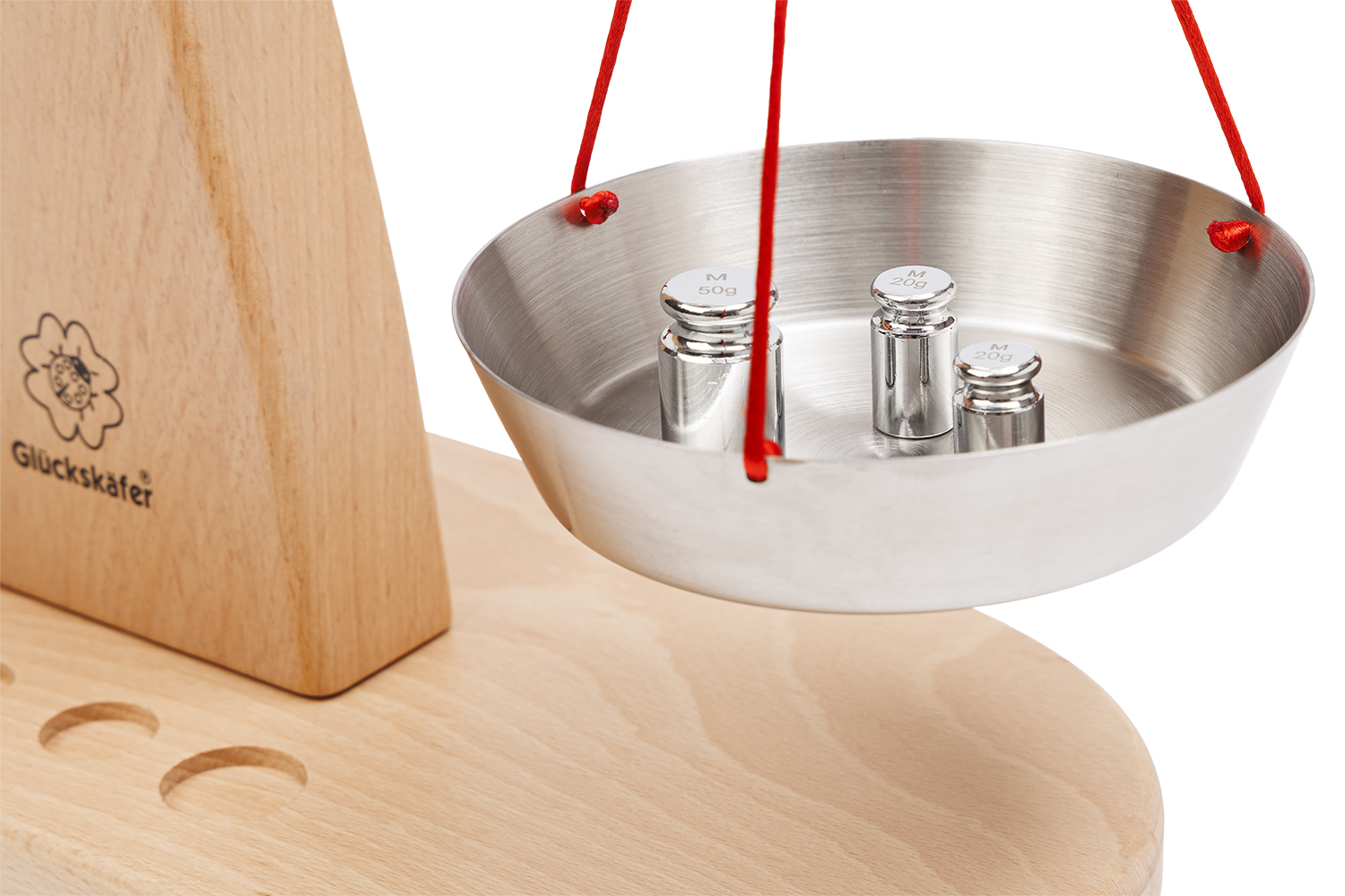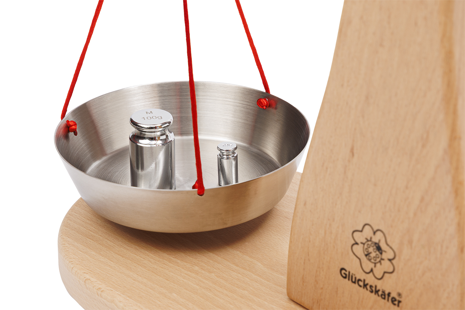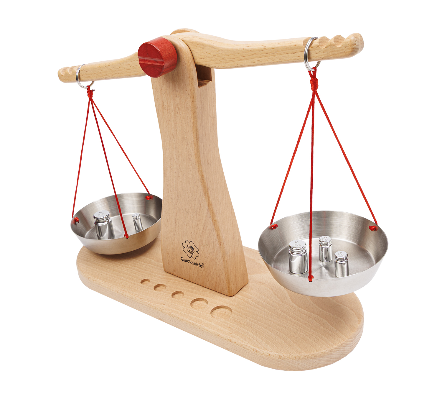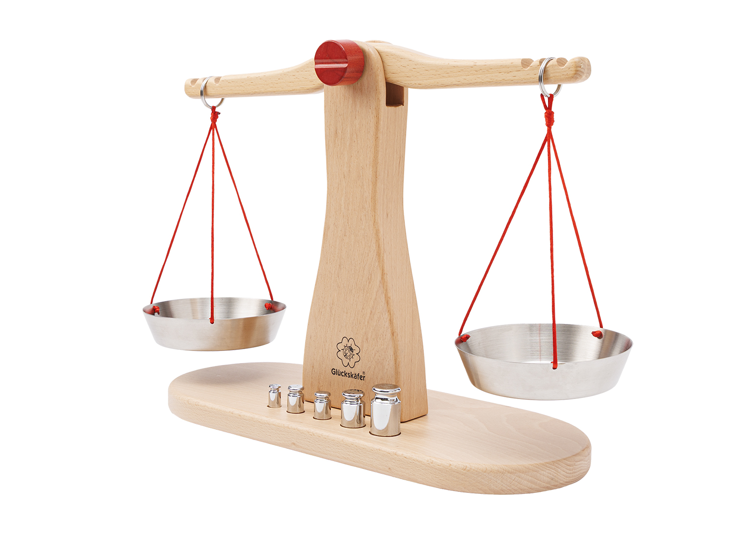 Unsere Kaufladen-Waage von Glückskäfer ist ein sehr hochwertiges und liebevoll gearbeitetes Holzspielzeug mit einem hohen pädagogischen Spielwert. Die Waage wurde aus massivem Buchenholz hergestellt. Die Holzoberfläche ist geölt. Die sogenannte „Balkenwaage“, der wir heute noch ab und zu an Marktständen begegnen, hat zwei Waagschalen. Diese hängen an den beiden Enden des beweglichen, waagrecht angebrachten Balkens. Will man etwas abwiegen, legt man in die eine Schale das entsprechende Gewicht hinein und füllt dann die andere Schale solange mit der gewünschten Ware, bis der Balken waagrecht ausgerichtet und ausbalanciert ist. Das grundsätzliche Prinzip des Abwiegens zeigt sich anhand der klassischen Balkenwaage sehr anschaulich und leicht verständlich. In diesem Umstand liegt auch der hohe pädagogische Wert der Waage für den spielerischen Umgang im Kinderkaufladen. Denn Kinder können auf diese Weise sehr anschaulich das Prinzip des „Wägens“ verstehen und verinnerlichen. Zugleich bekommen sie ein Gefühl für die Maßeinheiten von Gewichten und können diesen wichtigen Entwicklungsschritt, dem sie thematisch auch in der Schule begegnen, zuhause ganz praktisch nachvollziehen.