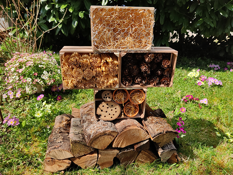 Setze Tontöpfe mit den gebohrten Holzstücken in Lücken zwischen den Kisten ein – so entstehen kleine, naturnahe Details.