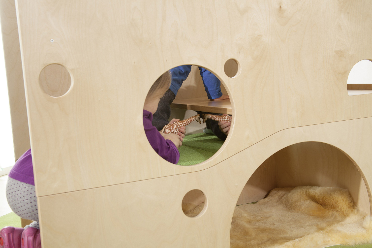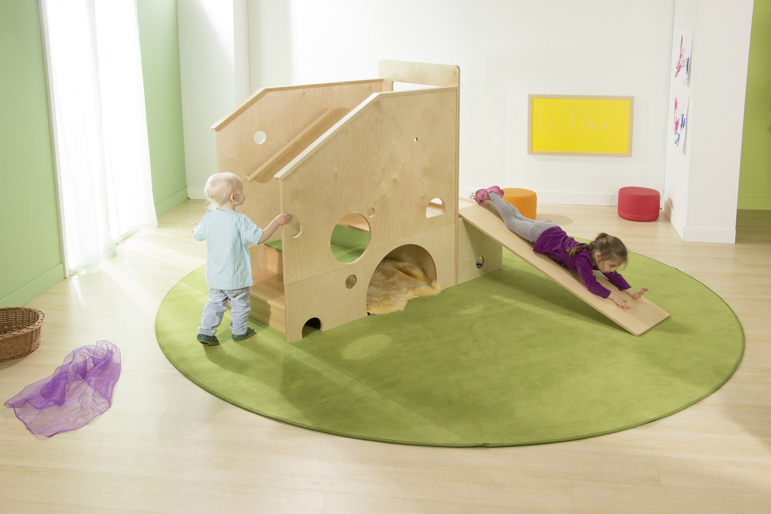 Das Kabäuschen bietet Kindern unterschiedliche Bewegungs-, Rückzugs- und Spielmöglichkeiten. Im unteren Bereich gibt es eine Höhle mit einem Geheimfach unter dem Treppenaufstieg, 1 Treppenstufe ist mit Tretford Teppich belegt, ein Spiegelstreifen ist an der Treppe angebracht, an der Querseite sind Schlitze für das "Einwurfspiel" zur Höhle hin. Spielerisch können Bewegungsabläufe trainiert werden, wie das Treppenlaufen, Klettern, Springen, Rutschen (in Kombination mit der Rampe Art. Nr. 101 472, bitte separat bestellen). Das Kabäuschen funktioniert als kleines Bewegungs-und Rückzugshäuschen und kann mit dem ebenfalls separat erhältlichen Kasten Art. Nr. 101 471 und Rampe kombiniert werden, so dass weitere Bewegungsmöglichkeiten gegeben sind. Ist das Häuschen zum Klettern und Springen von den Pädagogen für die Kinder „geschlossen“, kann die Rampe die große Öffnung einfach verschließen (einfaches Einhängen der Rampe am Kabäuschen). Das Möbelstück kann an der Wand stehen, in Kombination mit Kasten und Rampe in Innen- und Außenecken, oder als Raumteiler.