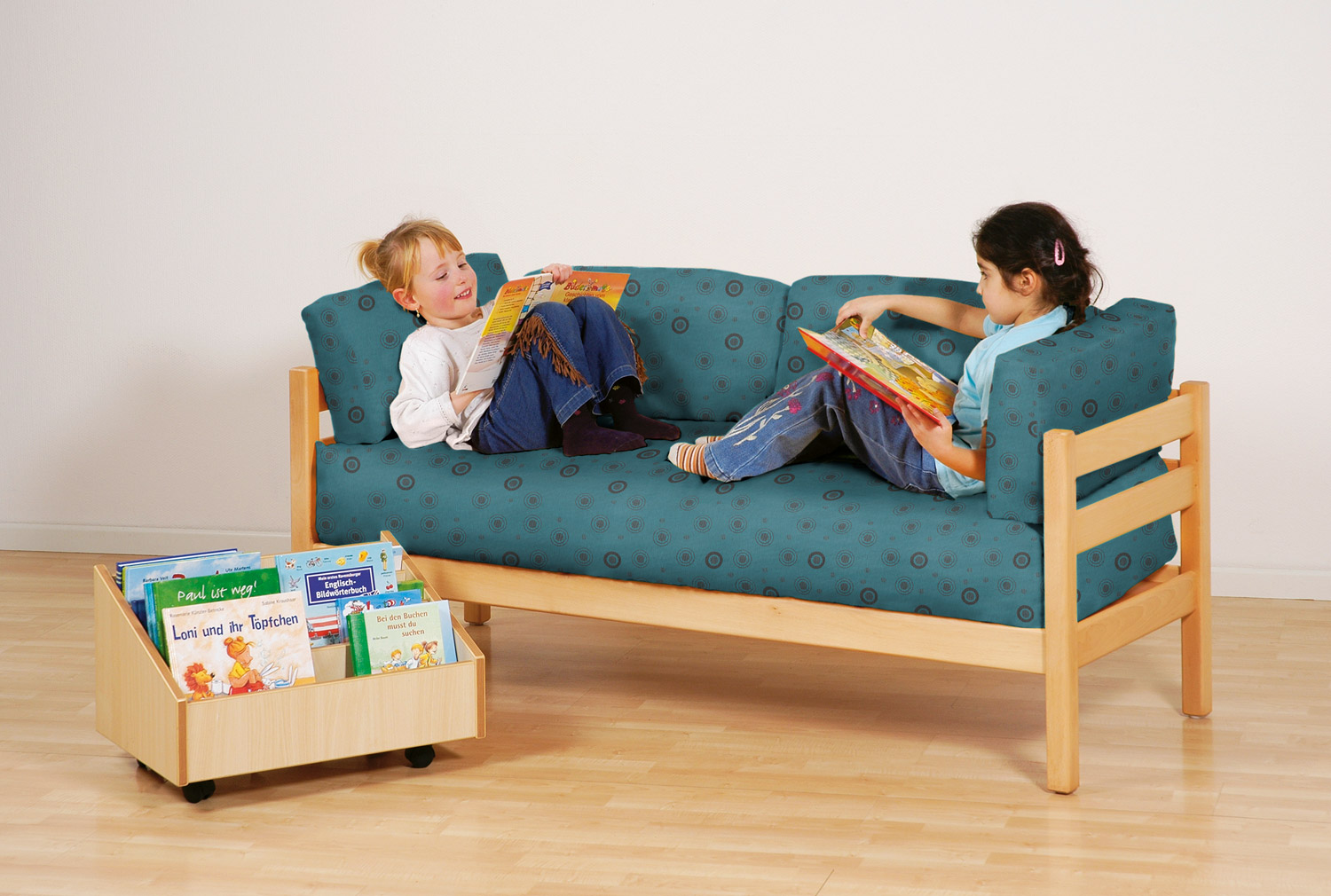 Das Kindersofa mit durchgehendem Sitzpolster lädt zum Hineinkuscheln und Schmökern ein.