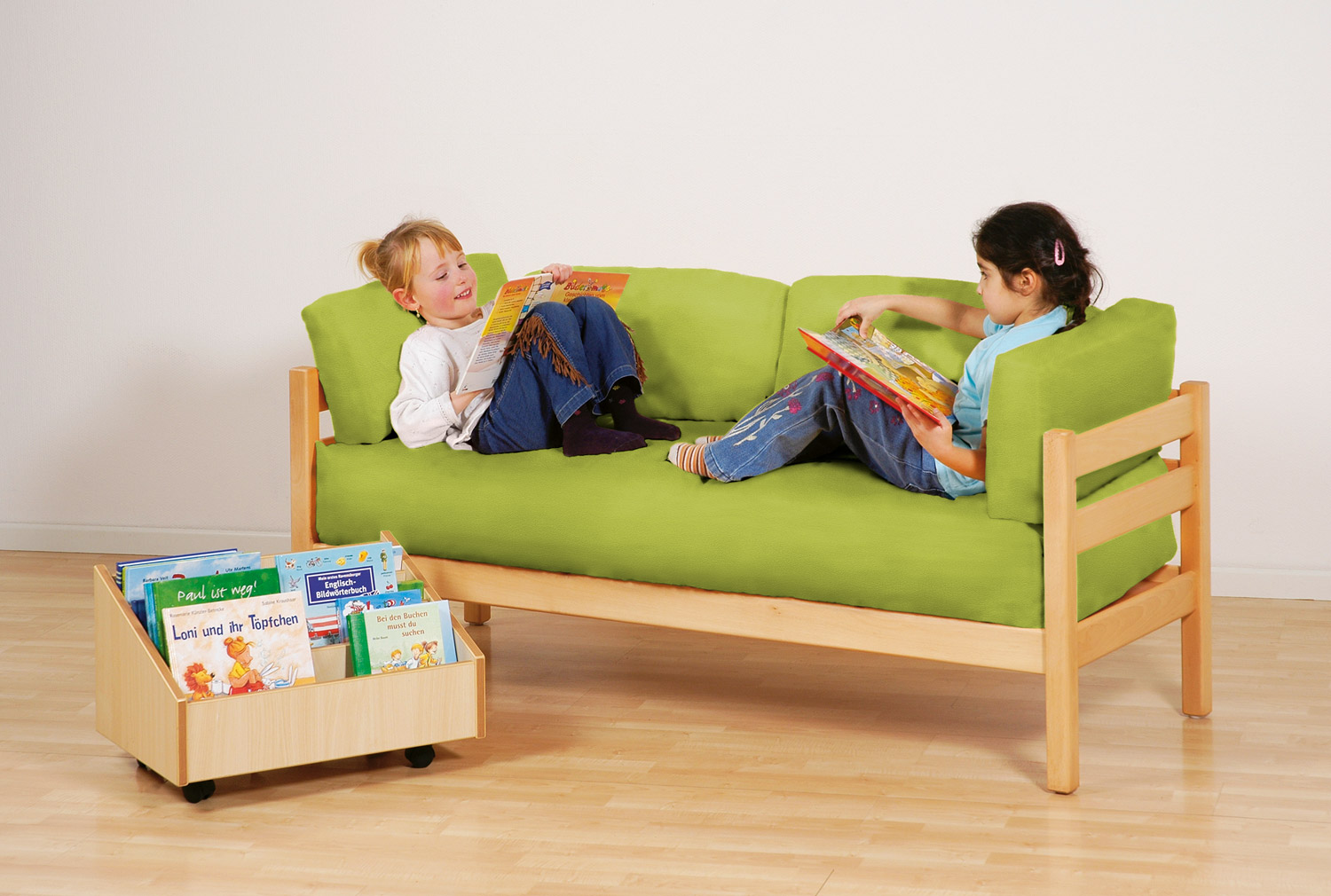 Das Kindersofa mit durchgehendem Sitzpolster lädt zum Hineinkuscheln und Schmökern ein.