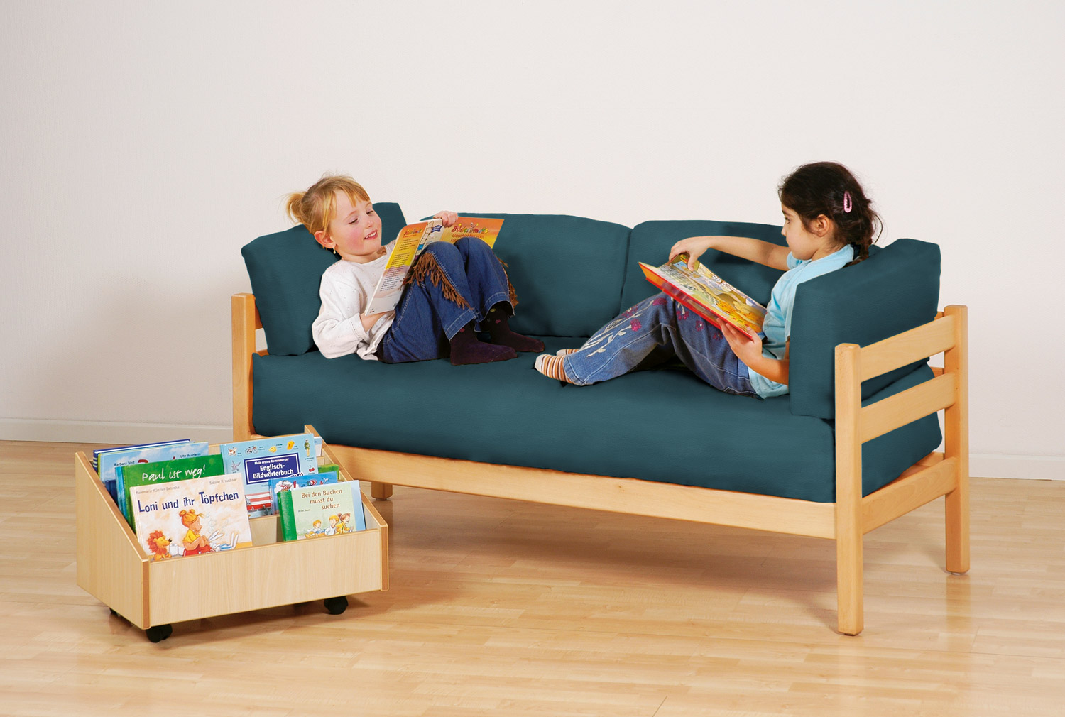 Das Kindersofa mit durchgehendem Sitzpolster lädt zum Hineinkuscheln und Schmökern ein.