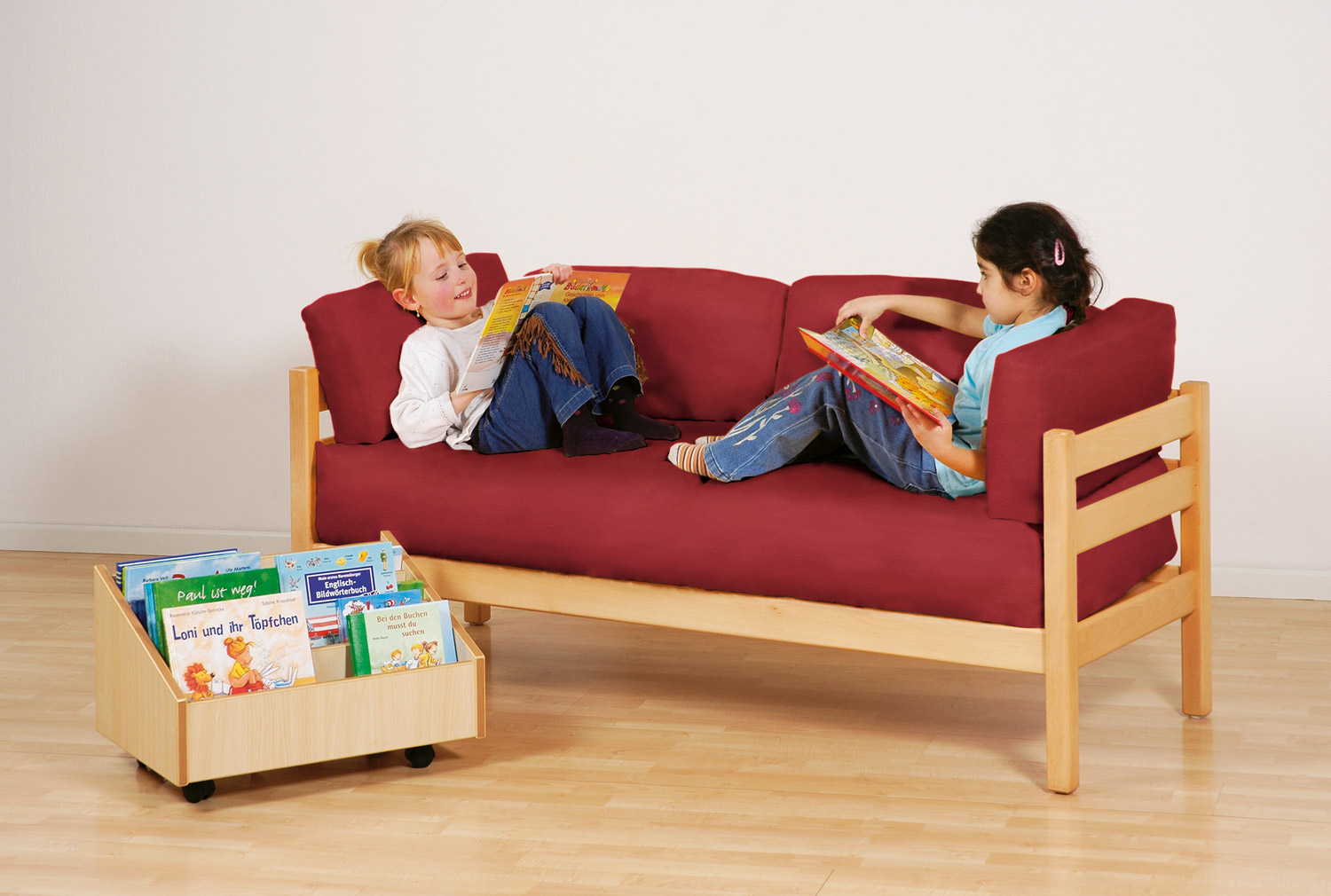 Das Kindersofa mit durchgehendem Sitzpolster lädt zum Hineinkuscheln und Schmökern ein.
