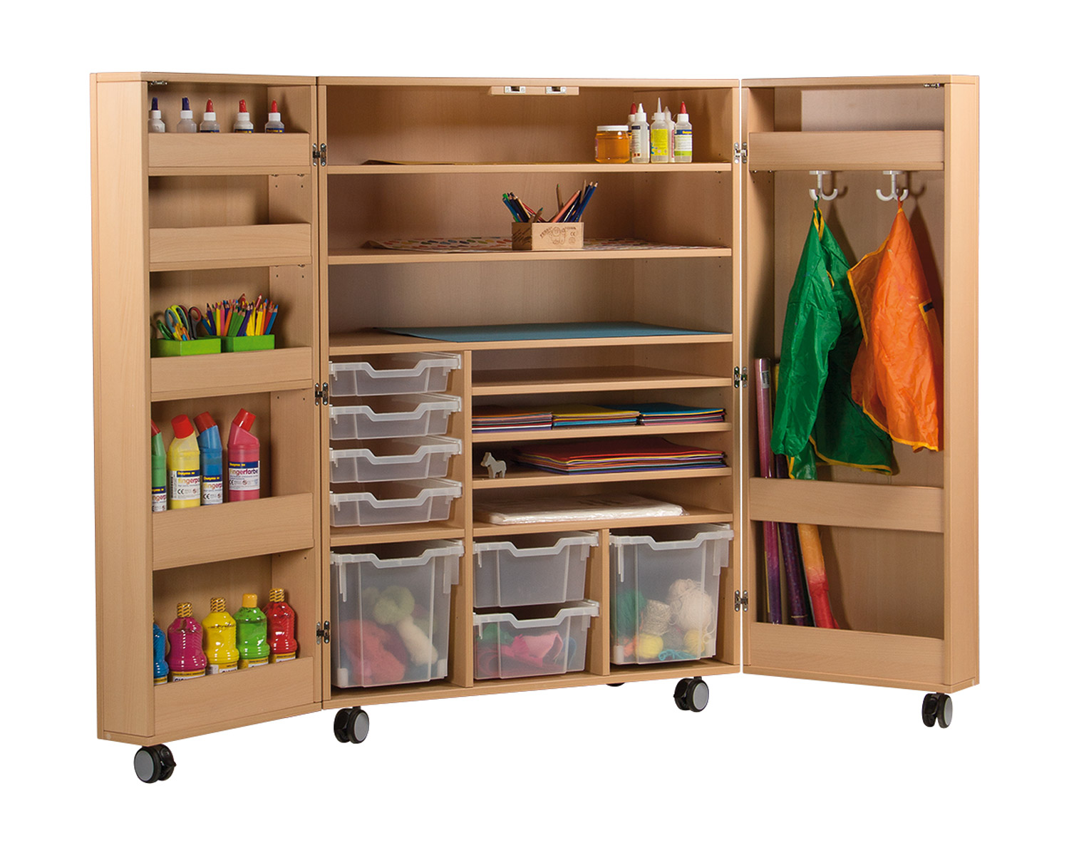 Der Klapp-Materialschrank ist mit Ablagfächern für Papier und Kartonagen bis zu einer Größe von 50,5 x 67,0 cm ausgestattet.
