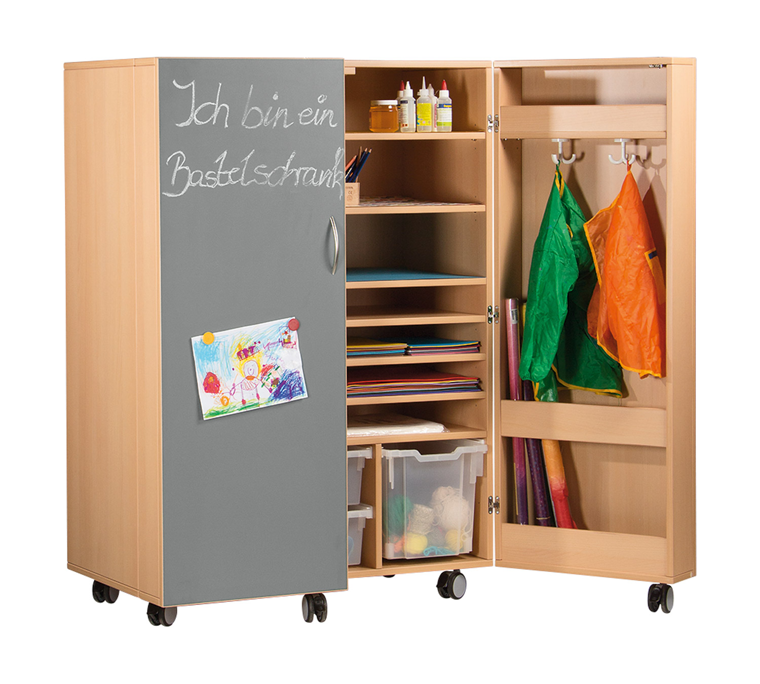 1 Klapp-Materialschrank, (2 Haken für Malerkittel, Schürzen usw. in der rechten Koffertür mit inbegriffen inkl. Schnappschloss), Kunststoffkästen (Größe I, II oder V) und Schienen bitte separat bestellen