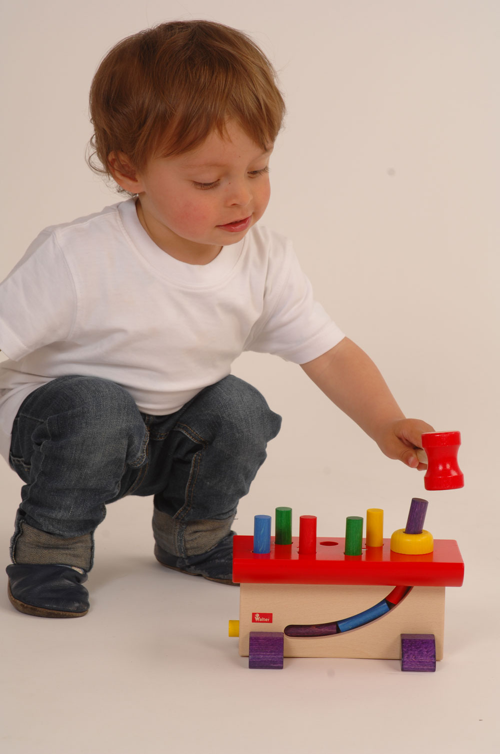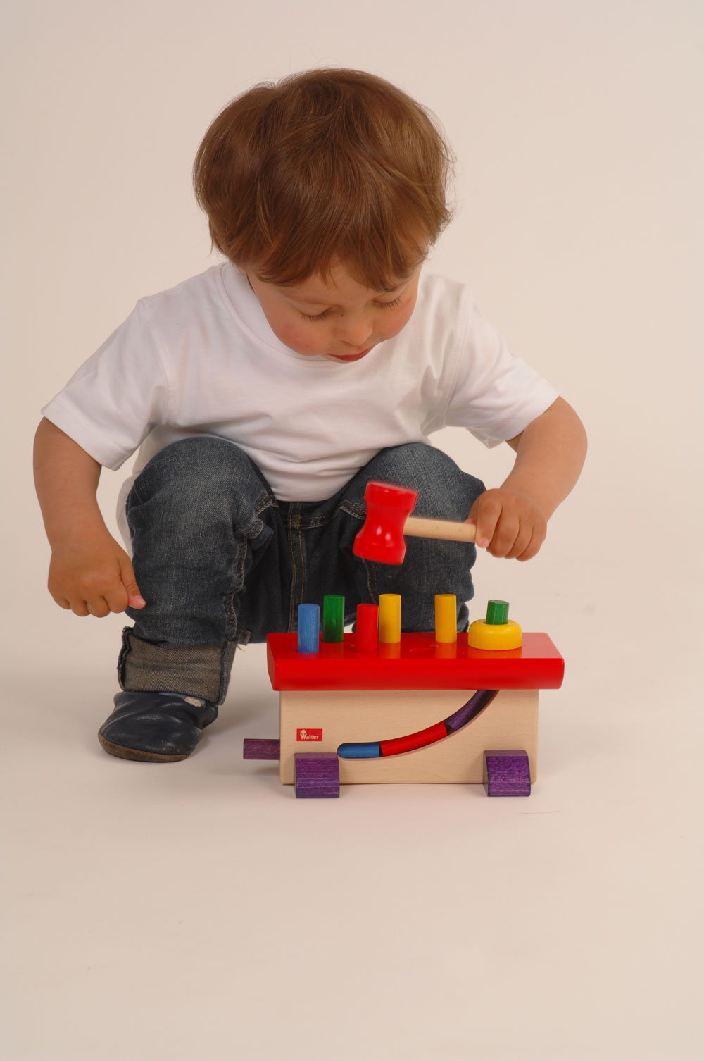Es klopft, pocht und trommelt…. Spätestens dann, wenn man schon glaubt, ein Specht sei in der heimischen Wohnung eingezogen, sollte man einen Blick ins Kinderzimmer riskieren. Denn es besteht durchaus die Möglichkeit, dass der liebe Nachwuchs bei seinen Erkundungen die Hammerbank entdeckt hat und nun fröhlich darauf herum hämmert. Ob Kinder es – wie die Spechte – auf bis zu 20 Schläge pro Sekunde schaffen, bleibt dahingestellt. Dass aber das Gehirn – vor allem die koordinativen und die motorischen Fähigkeiten – bei jedem Schlag gefördert werden, das kann man beim Zuschauen beobachten. Das wunderschöne Klopfspiel macht Kindern ab ca. eineinhalb bis zwei Jahren einfach Freude. Die kleinen Holzteile werden in die gelbe Klopfvorrichtung eingesteckt und dann hineingehämmert. Seitlich kann man die Teile dann durch die Hammerbank durchrutschen sehen, bis sie wieder herausfallen. Somit ist das klassische Holzspielzeug ersichtlich und verständlich für Kinder, was seinen pädagogischen Wert mitbegründet und Verlässlichkeit und Sicherheit schenkt. Die klassische Hammerbank ist aus stabilem Buchenholz gefertigt und besonders stabil und robust. Es handelt sich um eine hochwertige handwerkliche Schreinerarbeit. Die Oberflächen sind mit Farben auf Wasserbasis gestaltet und speichelecht.