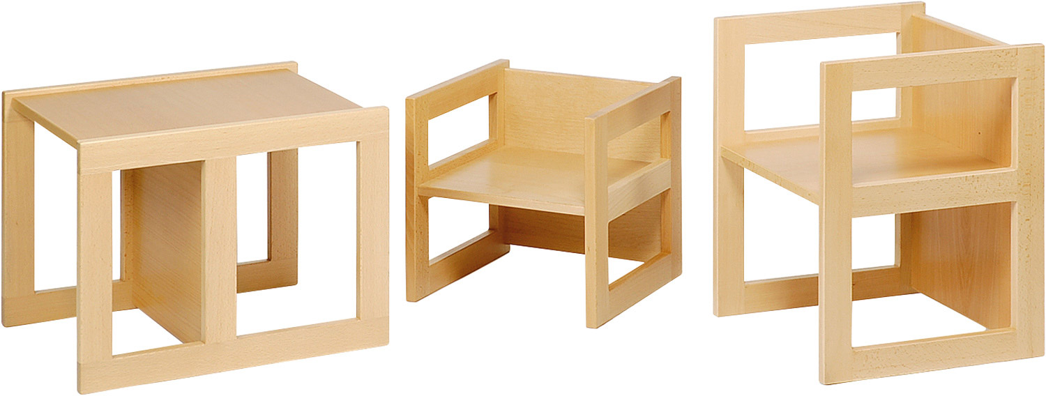 Mal Stuhl, mal Tisch, mal Hocker. Die äußerst stabile, fest verleimte Konstruktion aus massivem Buchenholz garantiert auch bei starker Beanspruchung, dauerhaft Stabilität und Sicherheit. Der kleine Kombihocker kann in den großen eingeschoben werden.