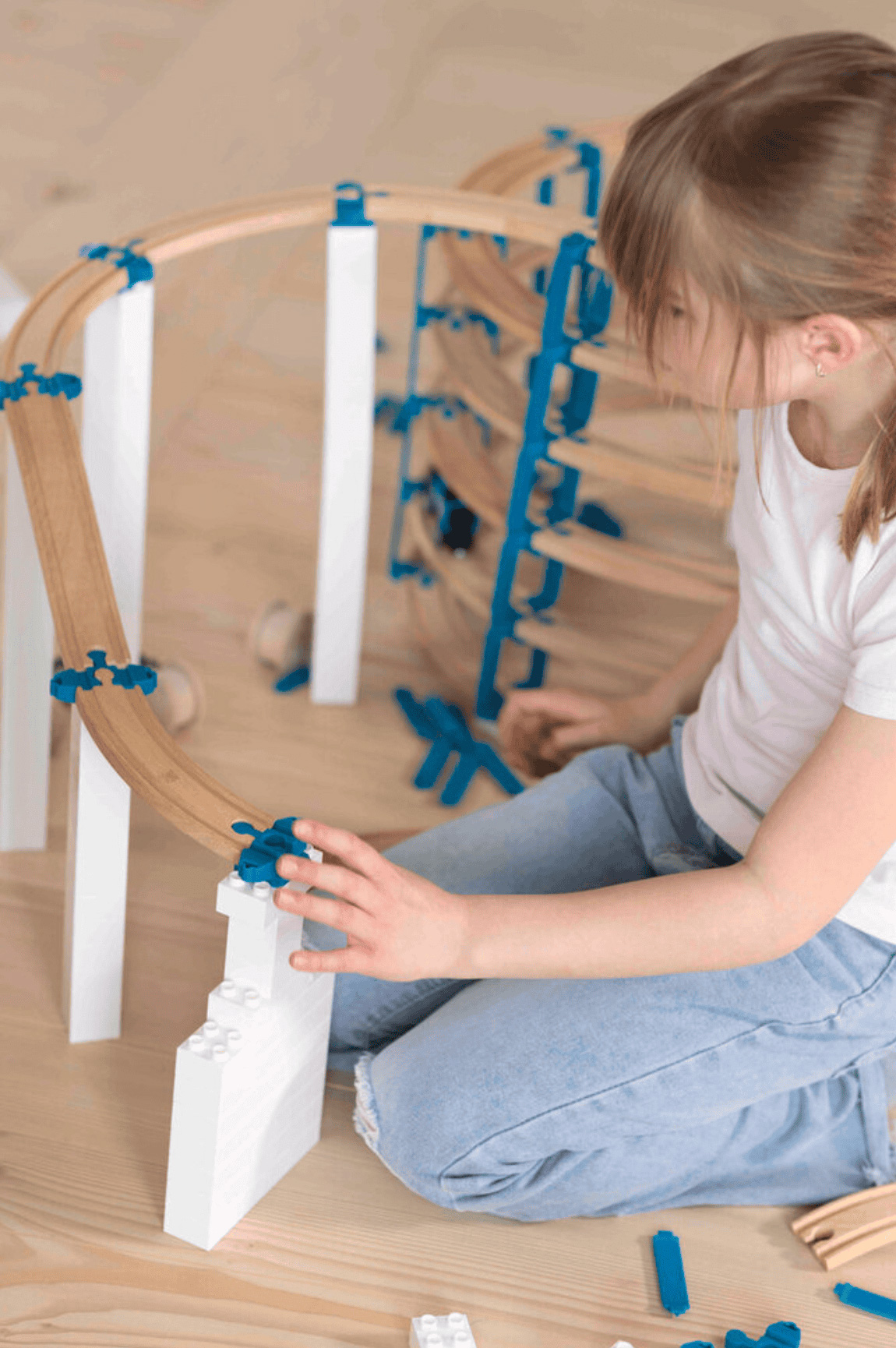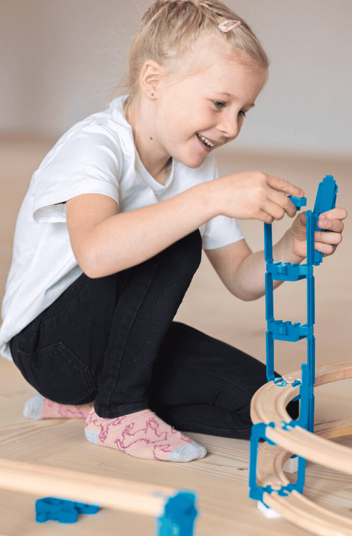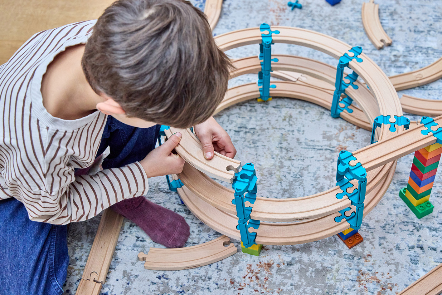 Mit den besonderen Adaptern lassen sich Spielwelten mühelos in die Höhe erweitern – für spektakuläre Spiralen, Brücken und mehrstöckige Konstruktionen. Holzwalzen können mit elektrischem Zug oder Hand nach oben transportiert werden und rollen anschließend selbstständig wieder hinab. Durch selbst gebastelte Kartonbanden, die sich dank „Lift“-Säulen leicht befestigen lassen, wird das System zur Murmelbahn für Kugeln mit Ø 2–4,5 cm. Kompatibel mit allen gängigen Holzeisenbahnschienen und Klemmbausteinen. Die Kunststoffelemente bestehen aus langlebigem und recyclebarem ABS-Kunststoff.