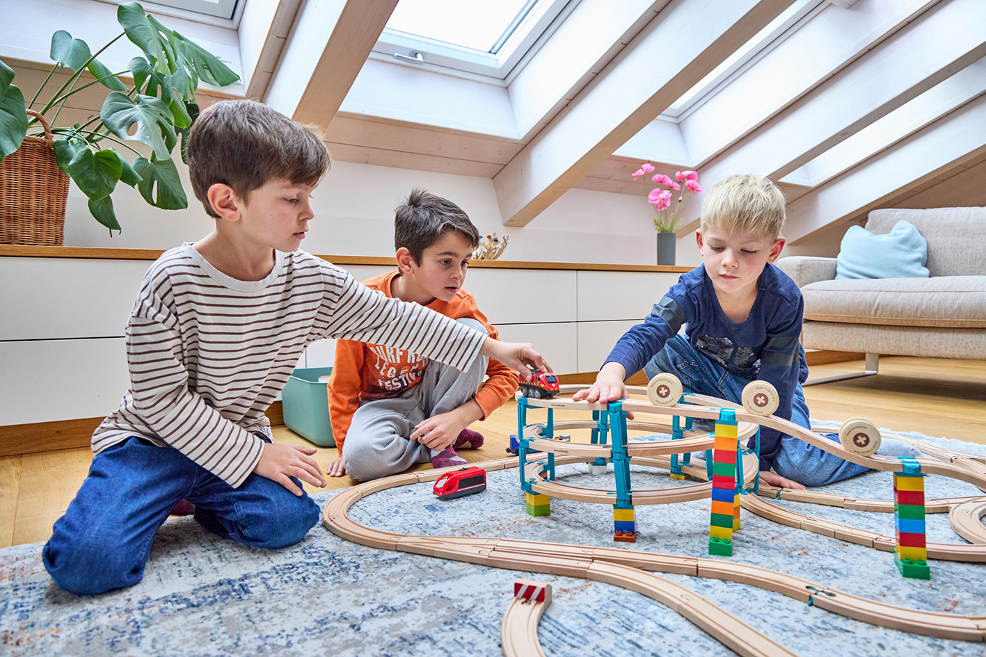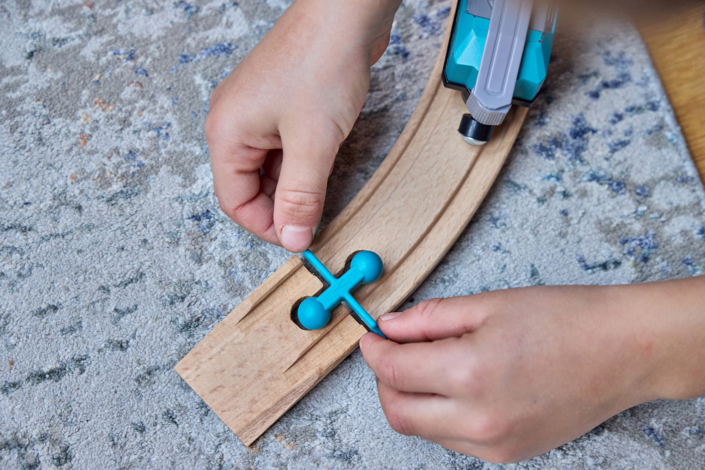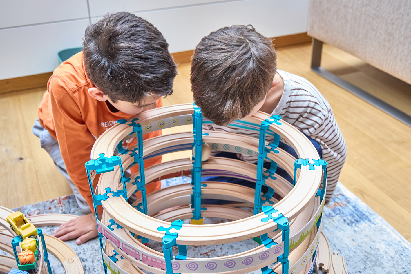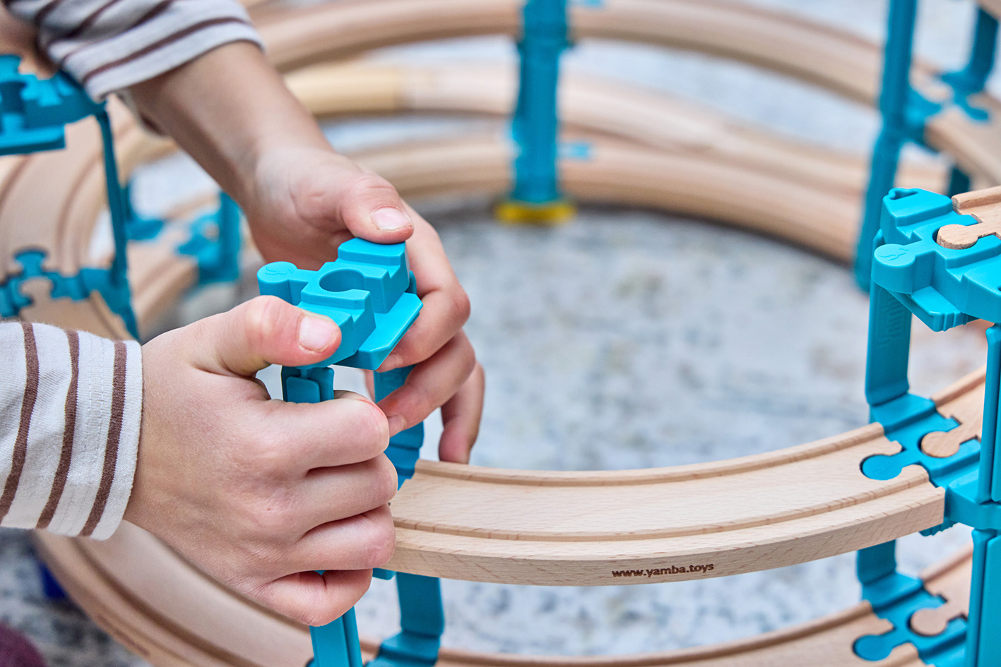 Mit den besonderen Adaptern lassen sich Spielwelten mühelos in die Höhe erweitern – für spektakuläre Spiralen, Brücken und mehrstöckige Konstruktionen. Holzwalzen können mit elektrischem Zug oder Hand nach oben transportiert werden und rollen anschließend selbstständig wieder hinab. Durch selbst gebastelte Kartonbanden, die sich dank „Lift“-Säulen leicht befestigen lassen, wird das System zur Murmelbahn für Kugeln mit Ø 2–4,5 cm. Kompatibel mit allen gängigen Holzeisenbahnschienen und Klemmbausteinen. Die Kunststoffelemente bestehen aus langlebigem und recyclebarem ABS-Kunststoff.