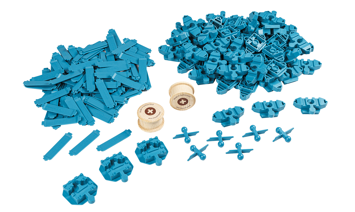 51 x Verbinder (Verbinder zwischen Klemmbausteinen und Schienen, ca. 4,4 x 3,5 cm), 88 x Lift-Verbinder (Säulen 7,4 x 1,5 cm), 2 x Rolli (Holzwalze, ca. Ø 5 cm) aus Buche natur, 3 x Kreuzungs-Adapter (5,5 x 6,2 cm), 6 x Bar (Adapter für Gleisstücke, ca. 5 x 4 cm), im Karton