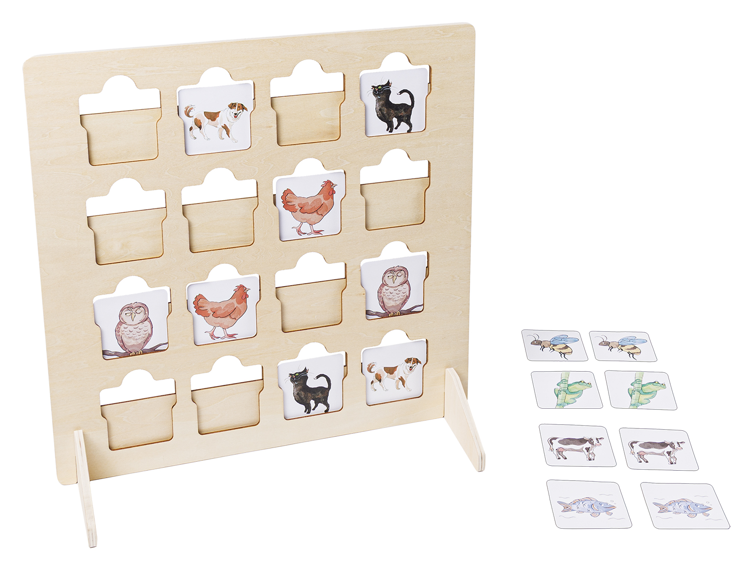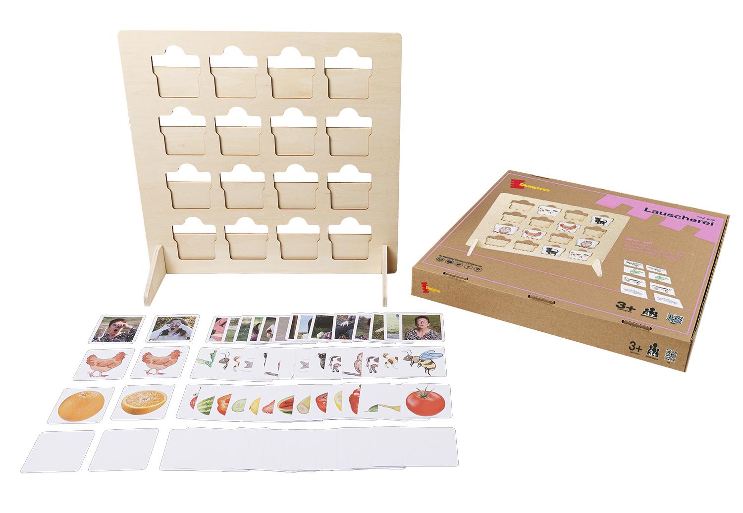 Lauscherei ist ein abwechslungsreiches Hör- und Memospiel, bei dem Kinder Paare nicht mit den Augen, sondern mit den Ohren finden. Nach dem Aufbau des Spielbretts werden die Bildkarten eingesetzt und mit passenden Geräuschen verknüpft. Die Kinder spielen verdeckt hinter dem Brett, während die anderen die gemachten Geräusche nachahmen. So versuchen die Spieler, allein anhand der Laute passende Paare zu erkennen. Die Runde endet, sobald alle Paare gefunden sind. Lauscherei lässt sich leicht variieren – etwa durch das Reduzieren der Karten, das Mischen verschiedener Themen oder das Beibehalten der Karten im Brett für höhere Ansprüche. Die Blankokarten eröffnen zusätzliche Möglichkeiten, z. B. für eigene Begriffe, Reime oder Liedtitel, die die Kinder gemeinsam auswählen. So bleibt das Spiel flexibel, kreativ und vielseitig einsetzbar. Das Spiel eignet sich bestens für den Einsatz in Kita, Grundschule, Förder- und Sprachunterricht sowie in inklusiven Gruppen.