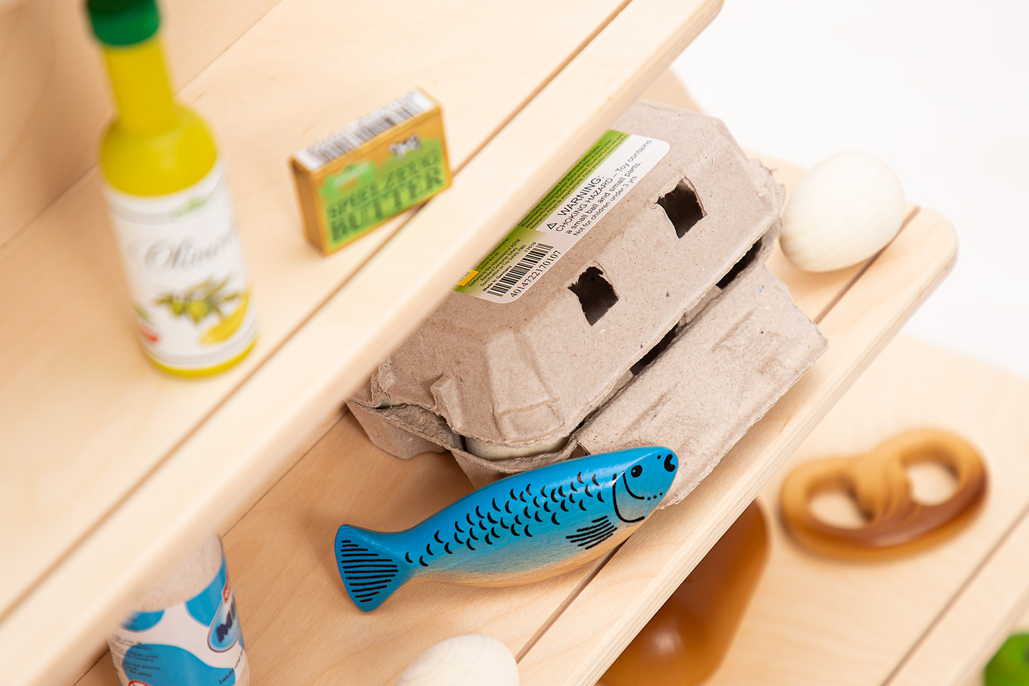 1 Set, Kategorie Zucker (1 Lutscher Ø 5,5 cm, 1 Zucker), Kategorie Fette (1 Olivenöl 12 cm hoch, 1 Butter), Kategorie Proteine/Eiweiß (6 Eier im Karton je Ø 3,5 cm, 1 Milch 11 cm hoch, 1 Quark, 1 Käse, 1 Fisch 11,6 cm lang, 1 Paar Würstchen, 1 Grillsteak 8 x 5,5 cm, 1 Schinken), Kategorie Kohlenhydrate (1 Toastbrotscheibe 6 x 5,4 cm, 1 Brot 10,9 x 5,5 cm, 1 Brezel, 3 Kartoffeln im Netz je Ø 4,2 cm, 15 Farfalle in der Dose je ca. 2,5 cm lang), Kategorie Obst (1 Ananas 9 cm hoch, in der Stiege: 1 Apfel grün 6 cm hoch, 1 Pflaume, 1 Orange Ø 4,2 cm, 1 Erdbeere, 1 Banane 9,5 cm lang), Kategorie Gemüse (1 Kürbis Ø 6,1 cm, 1 Salatkopf Ø 12 cm, in der Stiege: 1 Karotte 14 cm lang, 1 Gurke 11,8 cm lang, 1 Radieschen, 1 Tomate, 1 Champignon 3,5 cm hoch, 2 Rucola Blätter)