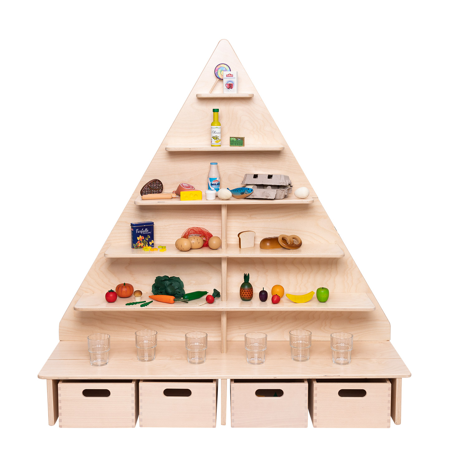 Dieses hochwertige Set aus Holzlebensmitteln wurde speziell für die Ernährungspyramide (103 525) zusammengestellt. Wie bei einer gesunden Ernährung wichtig, wurden Lebensmittel aus jeder Gruppe ausgesucht. Die Kinder werden schnell merken, dass es zum Beispiel nur wenig in der Kategorie Zucker, dafür aber umso mehr Teile in der Kategorie Gemüse gibt. Nutzen Sie die Neugier und die Situation und kommen Sie mit den Kindern darüber ins Gespräch. Zeigen Sie ihnen anhand dieses Sets auf, welche Lebensmittel in welchen Mengen in der gesunden Ernährung eine Rolle spielen. Vielleicht wollen die Kinder auch ihre Lieblingsspeisen preisgeben und Sie können diese mal genauer unter die Lupe nehmen. Vielfältige Einsatzmöglichkeiten sind möglich.