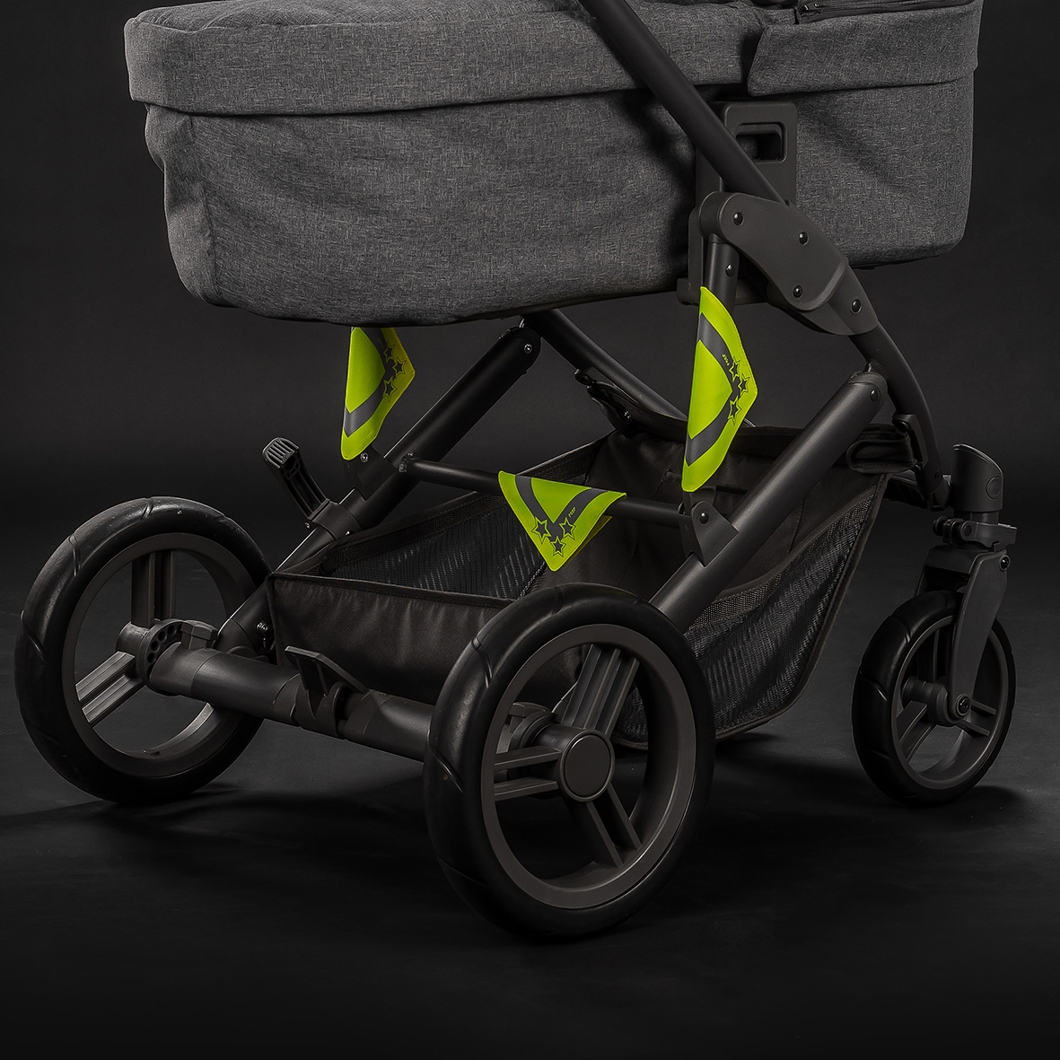 Durch die schnelle und einfache Anbringung mit Klettverschluss an verschiedenen Gestellen (wie Kinderwagen, Buggy, Laufrad, Rucksack) erhöht sich die Sichtbarkeit im Dunkeln, bei schlechtem Wetter oder im Straßenverkehr. Leuchtende Signalfarbe mit reflektierender Bedruckung, Materialien entsprechen den Anforderungen der EN 20471 für Warnkleidung. Nicht mit chemischen Mitteln zu reinigen.