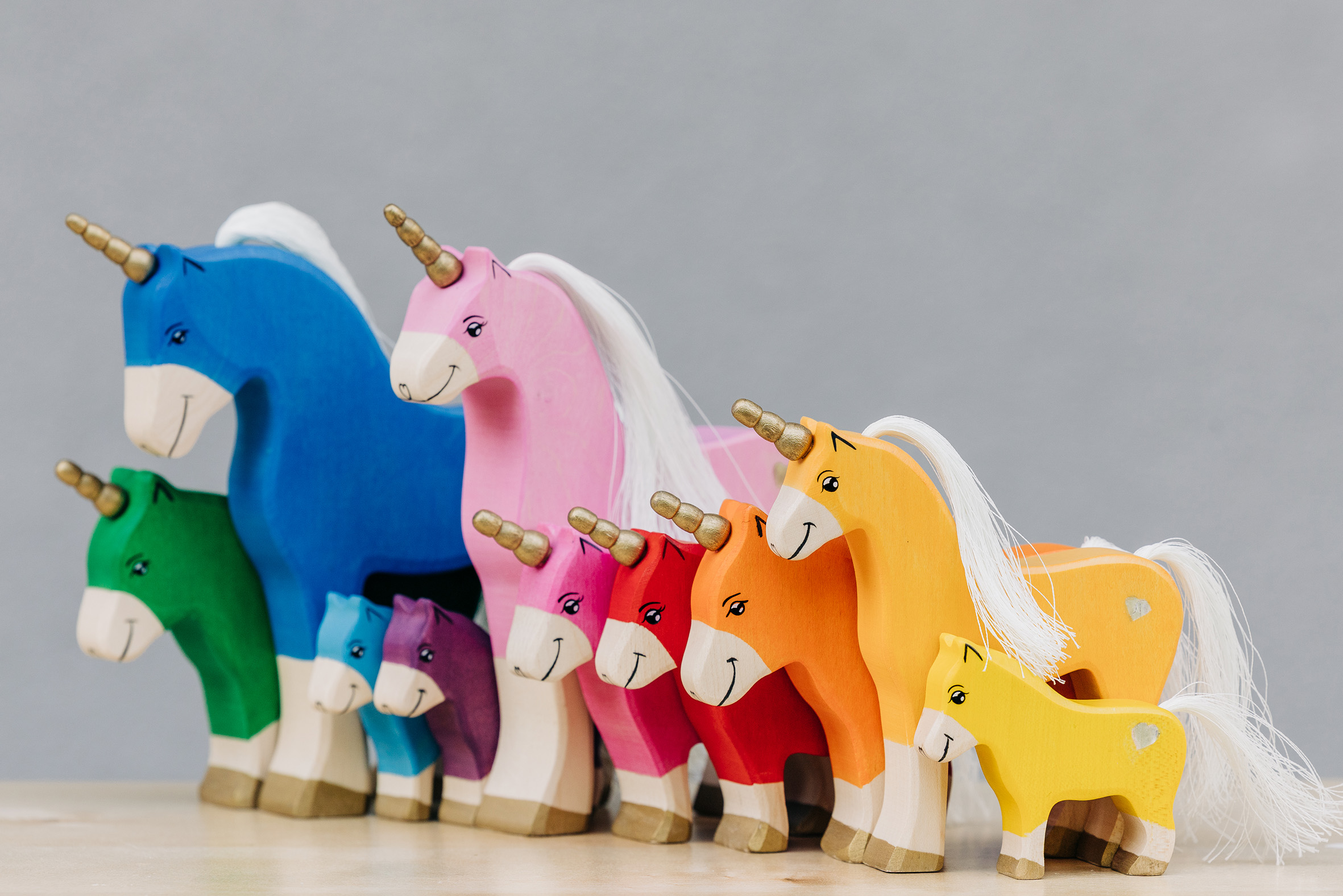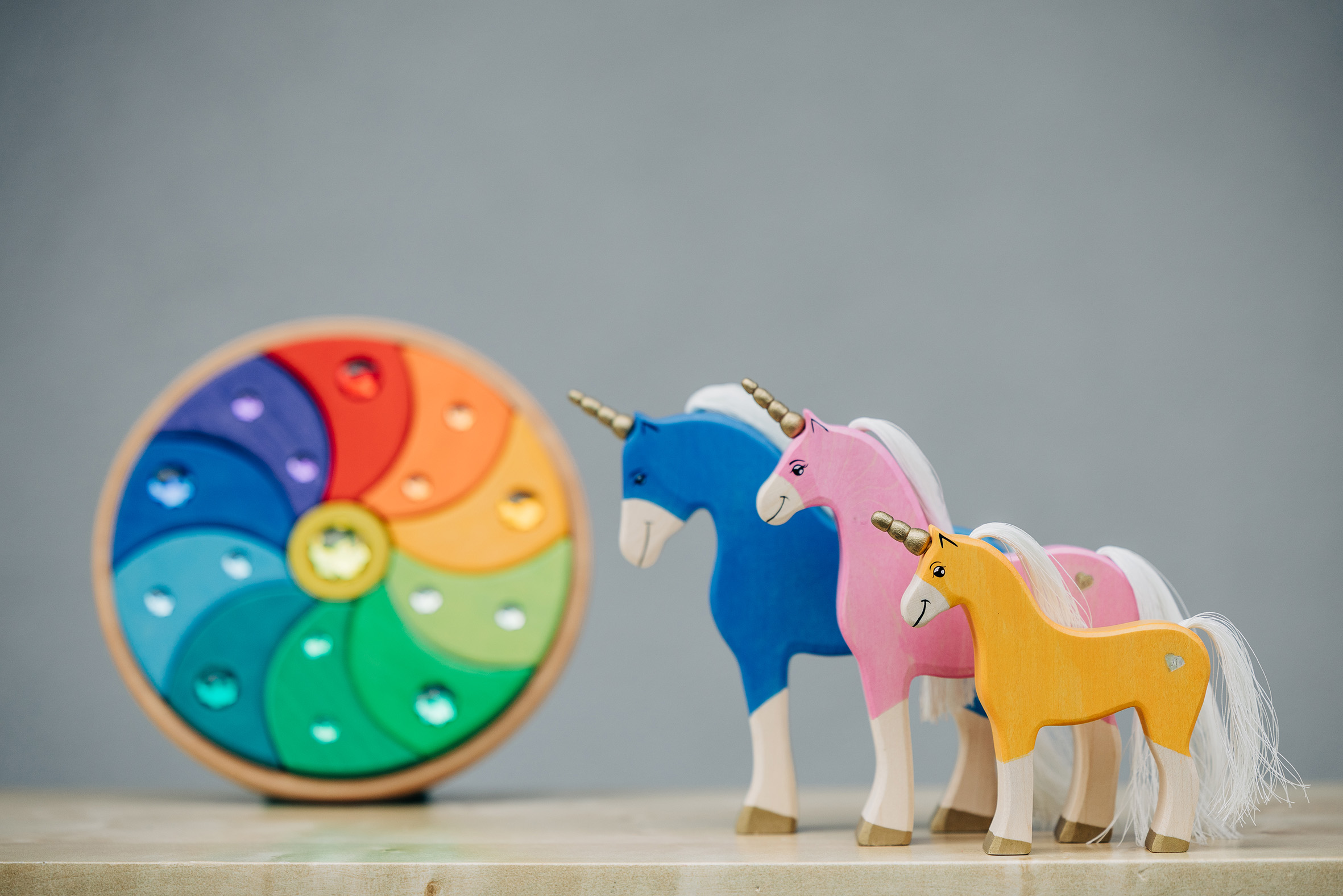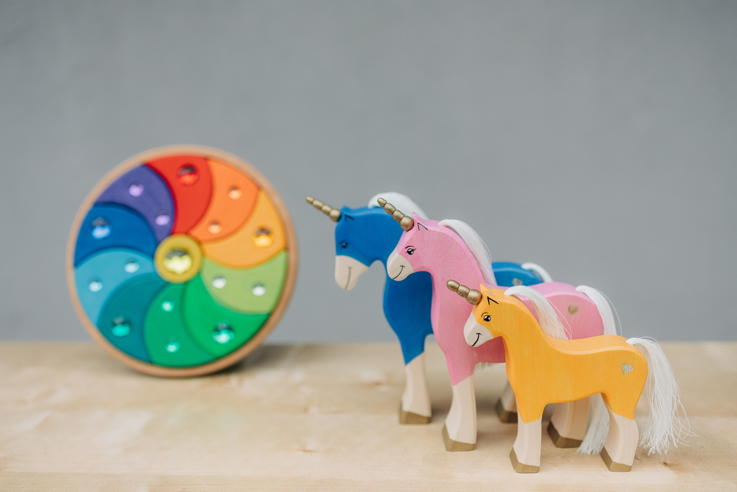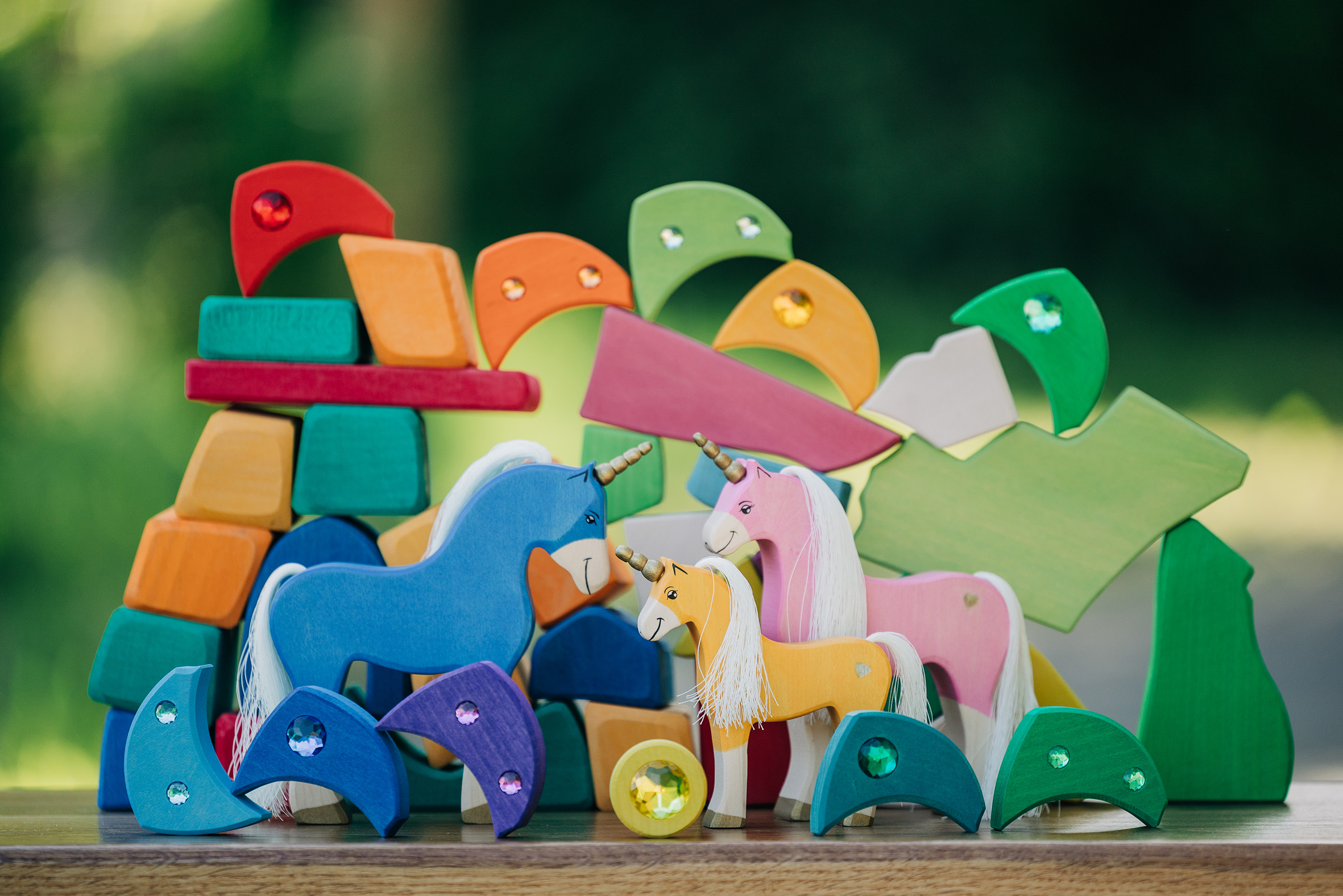 Willkommen in einer Welt voller Farben, Magie und unendlicher Fantasie! Unsere liebevoll handgefertigten Einhörner aus Holz laden Kinder dazu ein, in eine bunte Traumwelt einzutauchen, funkelnde Edelsteine und geheimnisvolle Abenteuer auf sie warten. Das stolze blaue Einhorn bewacht den Regenbogenpalast, während das goldene Einhorn neugierig durch die farbenfrohe Landschaft galoppiert. Und das zarte rosafarbene Einhorn bringt mit seiner Sanftheit eine Prise Zauber und Freundlichkeit in jede Geschichte. Begleitet werden die Fabelwesen von leuchtenden Holzbausteinen, die wie funkelnde Regenbogenkristalle wirken. Ob Türme, Regenbogenbrücken oder magische Höhlen – die bunten Elemente lassen sich immer wieder neu kombinieren und eröffnen unendliche Spielmöglichkeiten. Lass die Magie einziehen – entdecke jetzt unsere zauberhafte Einhorn-Welt!