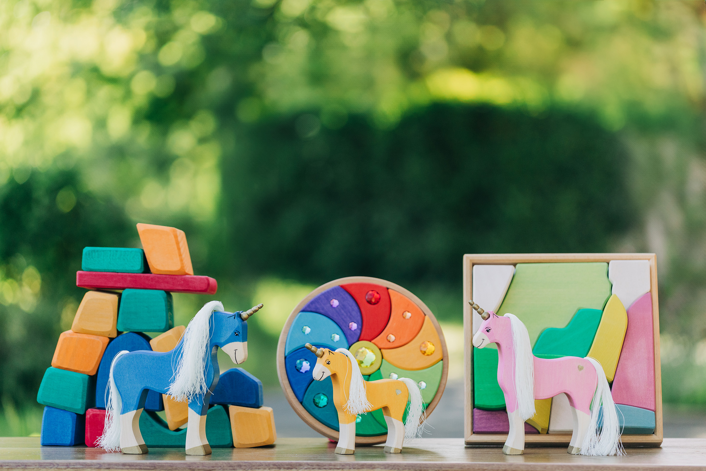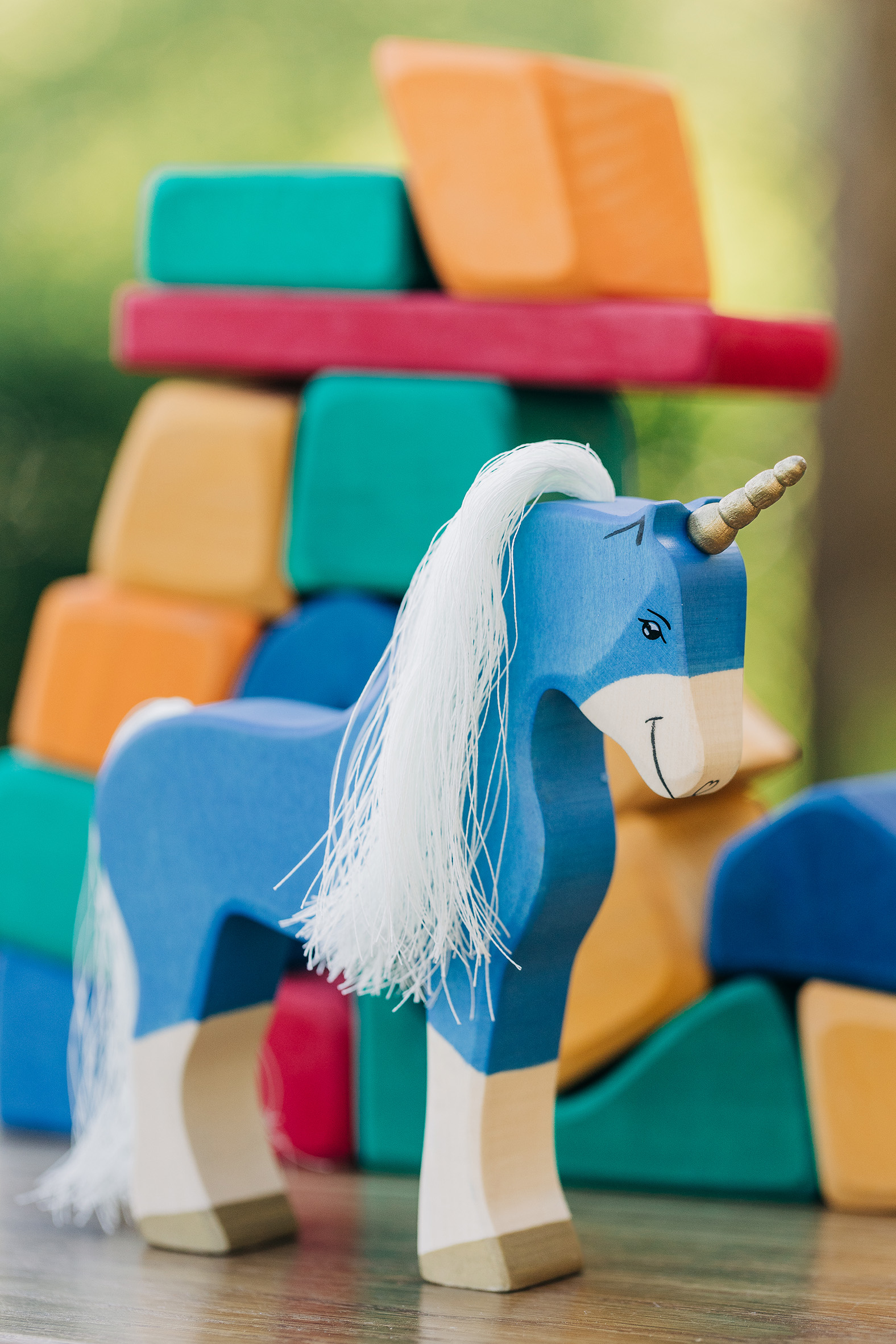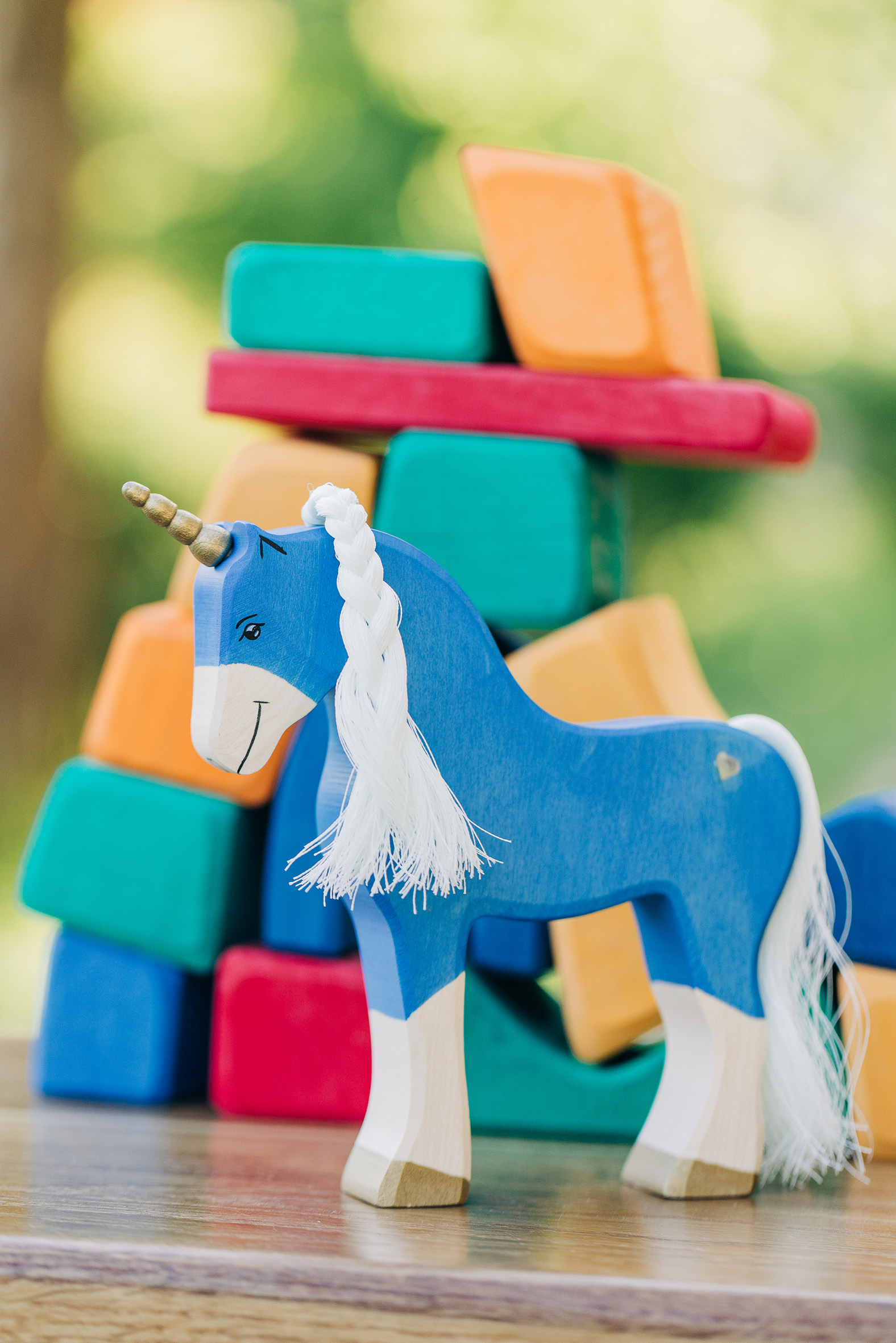 Willkommen in einer Welt voller Farben, Magie und unendlicher Fantasie! Unsere liebevoll handgefertigten Einhörner aus Holz laden Kinder dazu ein, in eine bunte Traumwelt einzutauchen, funkelnde Edelsteine und geheimnisvolle Abenteuer auf sie warten. Das stolze blaue Einhorn bewacht den Regenbogenpalast, während das goldene Einhorn neugierig durch die farbenfrohe Landschaft galoppiert. Und das zarte rosafarbene Einhorn bringt mit seiner Sanftheit eine Prise Zauber und Freundlichkeit in jede Geschichte. Begleitet werden die Fabelwesen von leuchtenden Holzbausteinen, die wie funkelnde Regenbogenkristalle wirken. Ob Türme, Regenbogenbrücken oder magische Höhlen – die bunten Elemente lassen sich immer wieder neu kombinieren und eröffnen unendliche Spielmöglichkeiten. Lass die Magie einziehen – entdecke jetzt unsere zauberhafte Einhorn-Welt!