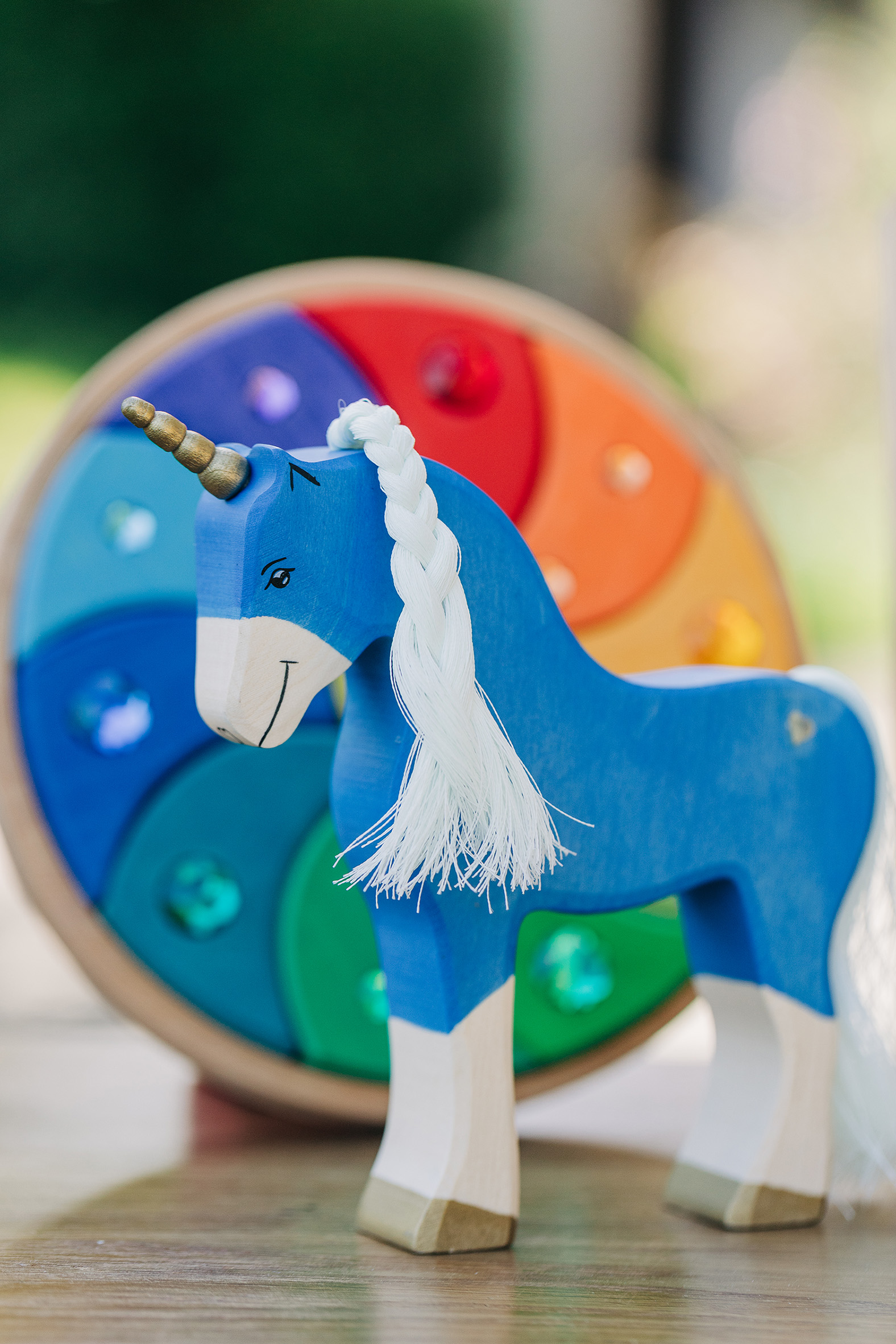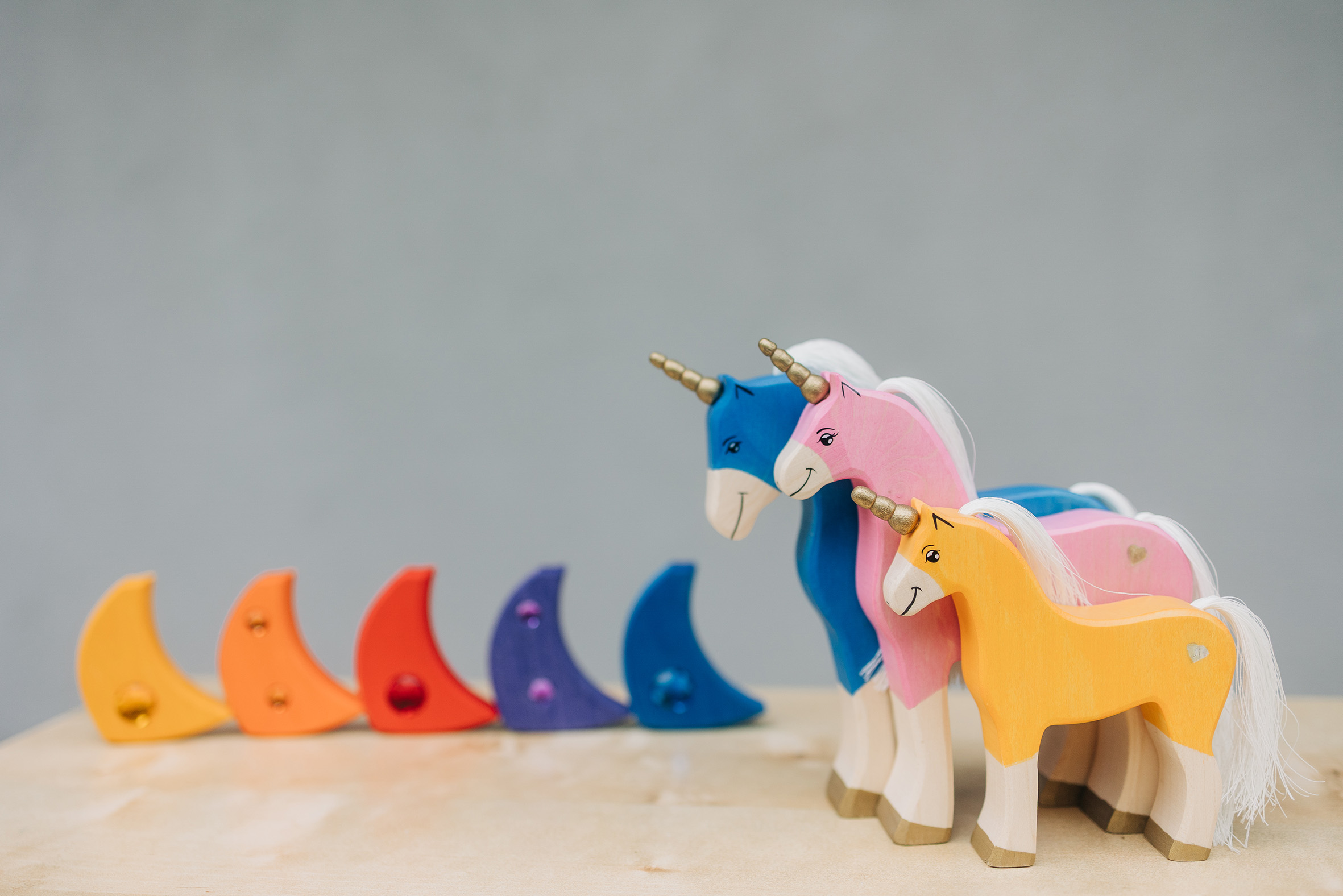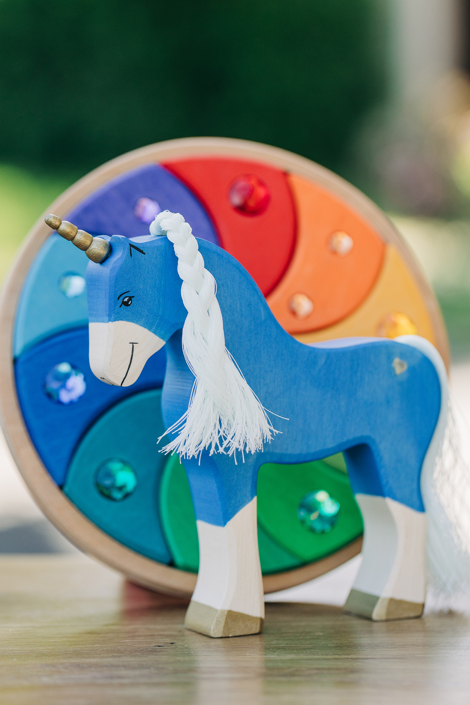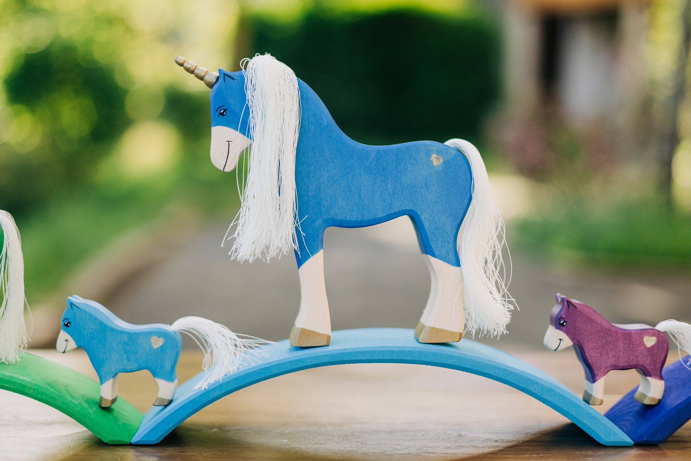 Willkommen in einer Welt voller Farben, Magie und unendlicher Fantasie! Unsere liebevoll handgefertigten Einhörner aus Holz laden Kinder dazu ein, in eine bunte Traumwelt einzutauchen, funkelnde Edelsteine und geheimnisvolle Abenteuer auf sie warten. Das stolze blaue Einhorn bewacht den Regenbogenpalast, während das goldene Einhorn neugierig durch die farbenfrohe Landschaft galoppiert. Und das zarte rosafarbene Einhorn bringt mit seiner Sanftheit eine Prise Zauber und Freundlichkeit in jede Geschichte. Begleitet werden die Fabelwesen von leuchtenden Holzbausteinen, die wie funkelnde Regenbogenkristalle wirken. Ob Türme, Regenbogenbrücken oder magische Höhlen – die bunten Elemente lassen sich immer wieder neu kombinieren und eröffnen unendliche Spielmöglichkeiten. Lass die Magie einziehen – entdecke jetzt unsere zauberhafte Einhorn-Welt!