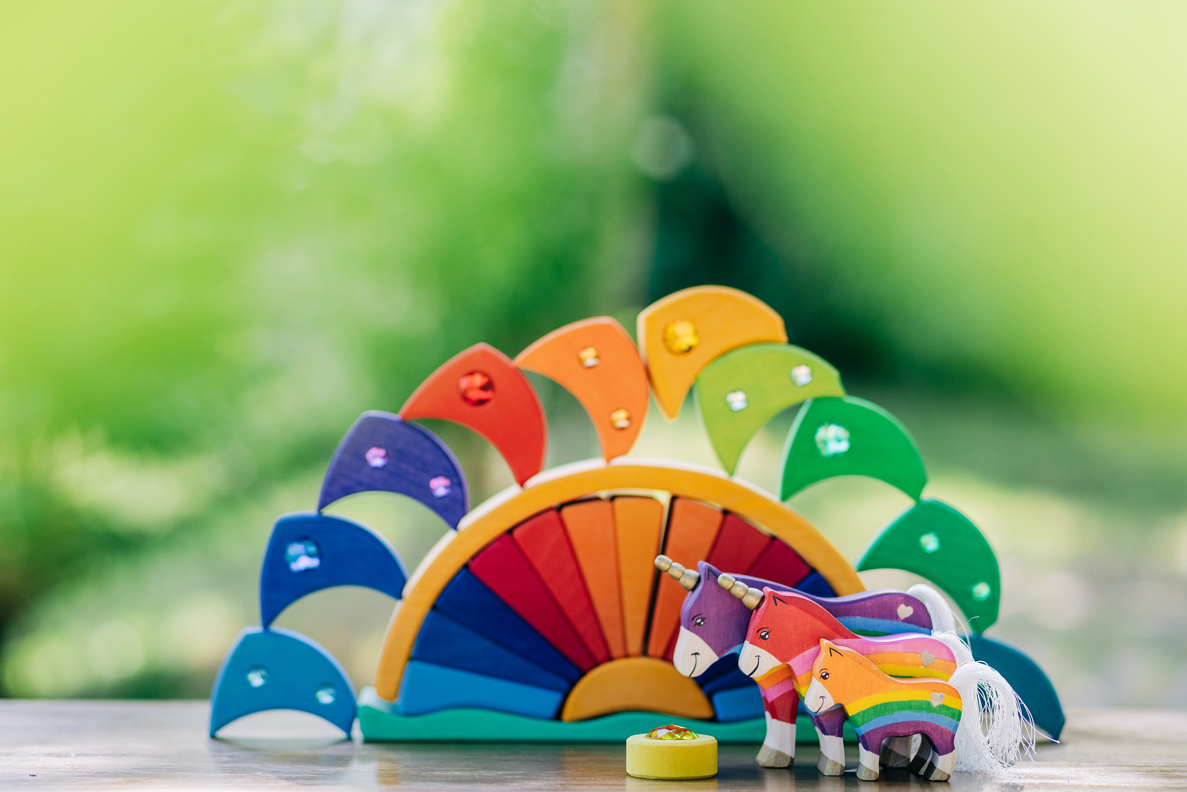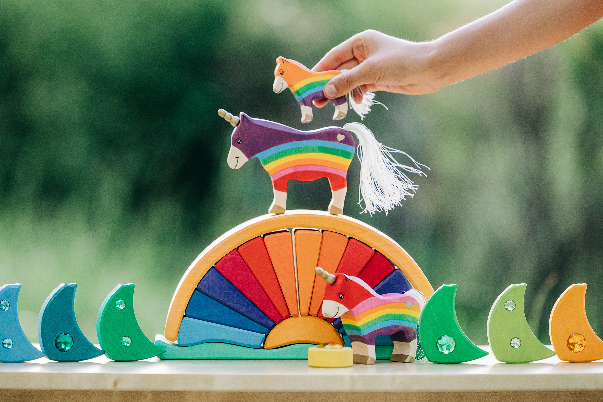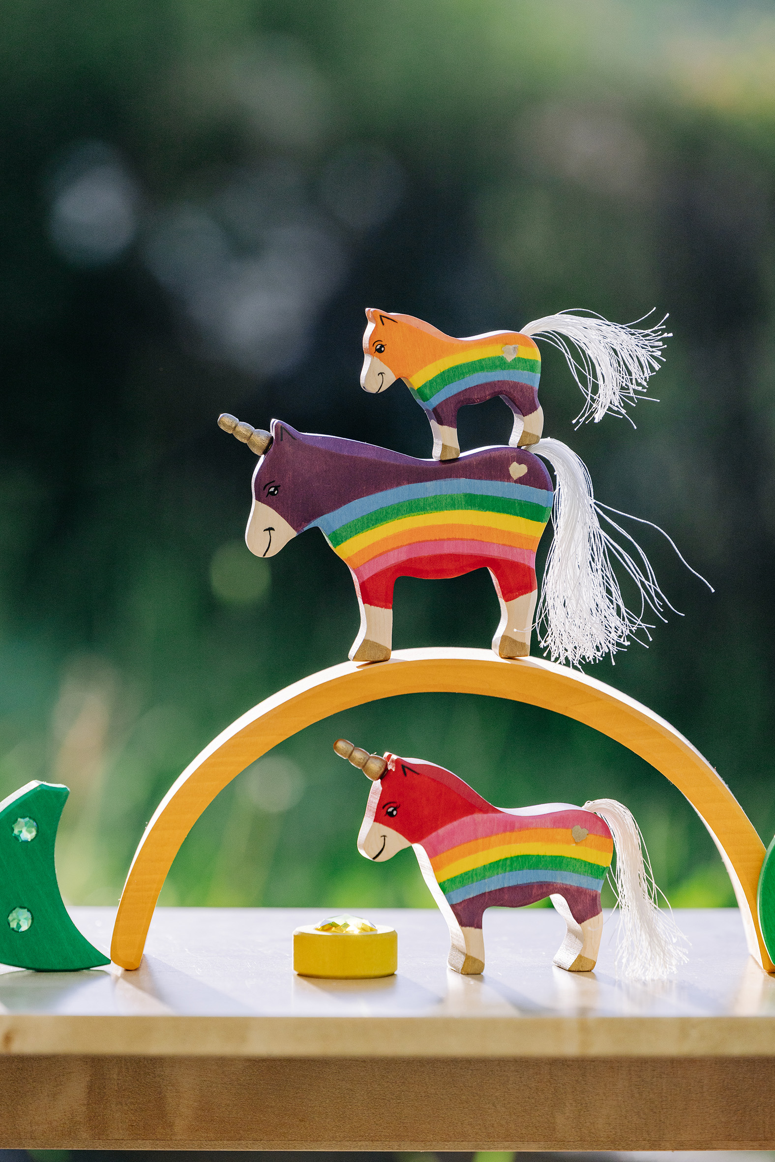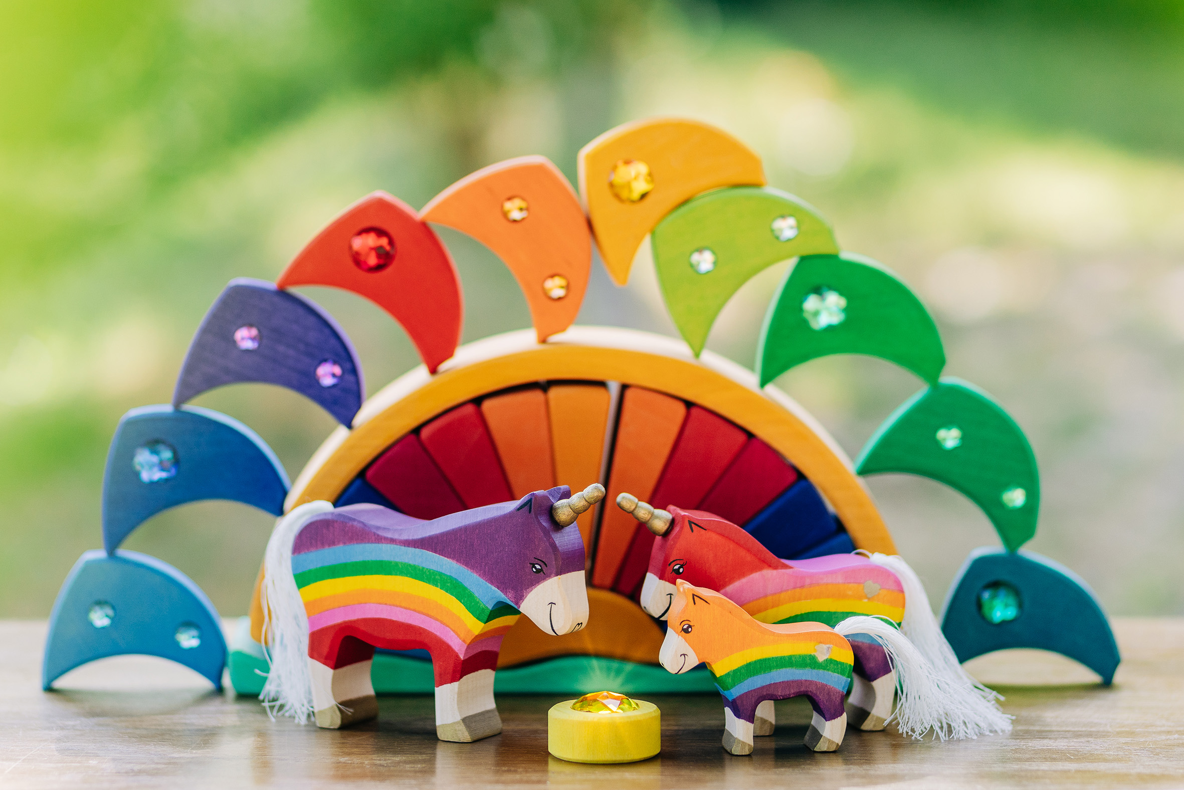 Es gibt Momente, in denen die Welt ein bisschen mehr Glanz und Farbe vertragen kann – und genau dafür sind unsere Regenbogen-Einhörner geschaffen! Hier treffen kräftige Regenbogenfarben auf sanfte Holzstrukturen, funkelnde Schmucksteine auf liebevoll handgemalte Details. Die Einhörner – vom stolzen Leitpferd bis zum fröhlichen Fohlen – bringen Magie ins Kinderzimmer und wecken die Fantasie der Kleinsten. Begleitet werden sie von einem strahlenden Regenbogenbogen, der nicht nur ein dekoratives Highlight ist, sondern auch zum Stapeln, Sortieren und Bauen einlädt. Die glitzernden Elemente fangen das Licht wie kleine Sonnenstrahlen ein und lassen die Szene erstrahlen – fast so, als wäre gerade ein Sommerregenbogen zum Greifen nah. Was diese Spielwelt so besonders macht: Fantasievoll & kreativ: Einhörner, Regenbögen und bunte Steine eröffnen unendliche Spielideen. Handarbeit mit Herz: Aus nachhaltigem Holz gefertigt und mit kindersicheren Farben bemalt. Magischer Glitzer: Kleine Schmucksteine verleihen dem Set das gewisse Funkeln. Spiel & Deko zugleich: Perfekt zum Spielen, aber auch ein echter Hingucker im Kinderzimmer. Ob wilde Einhornabenteuer über Regenbogenbrücken oder friedliche Märchenmomente im glitzernden Licht – dieses Set macht jedes Spiel zu einer Reise in eine magische Welt. Lass die Fantasie fliegen und hol dir den Regenbogenzauber nach Hause!
