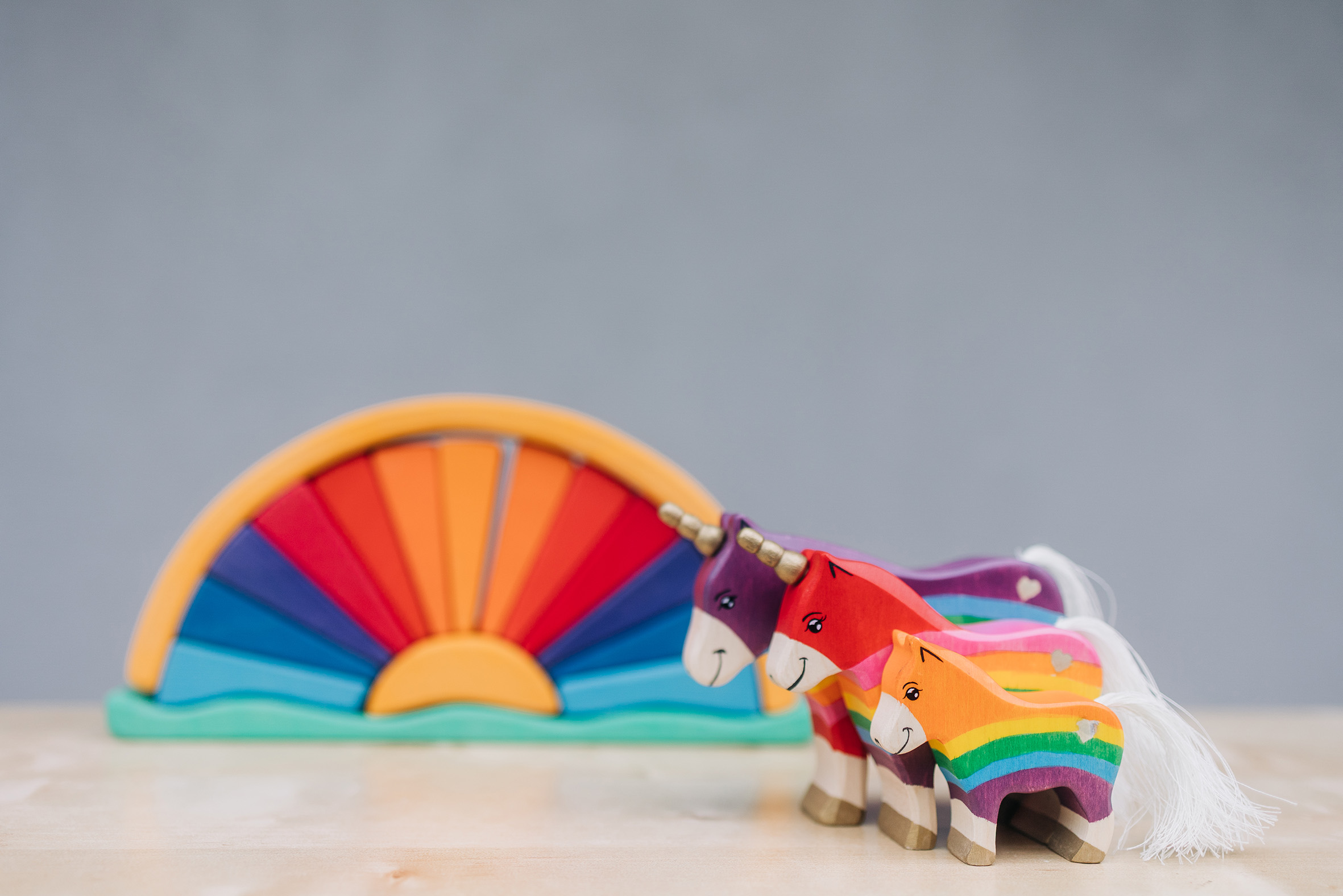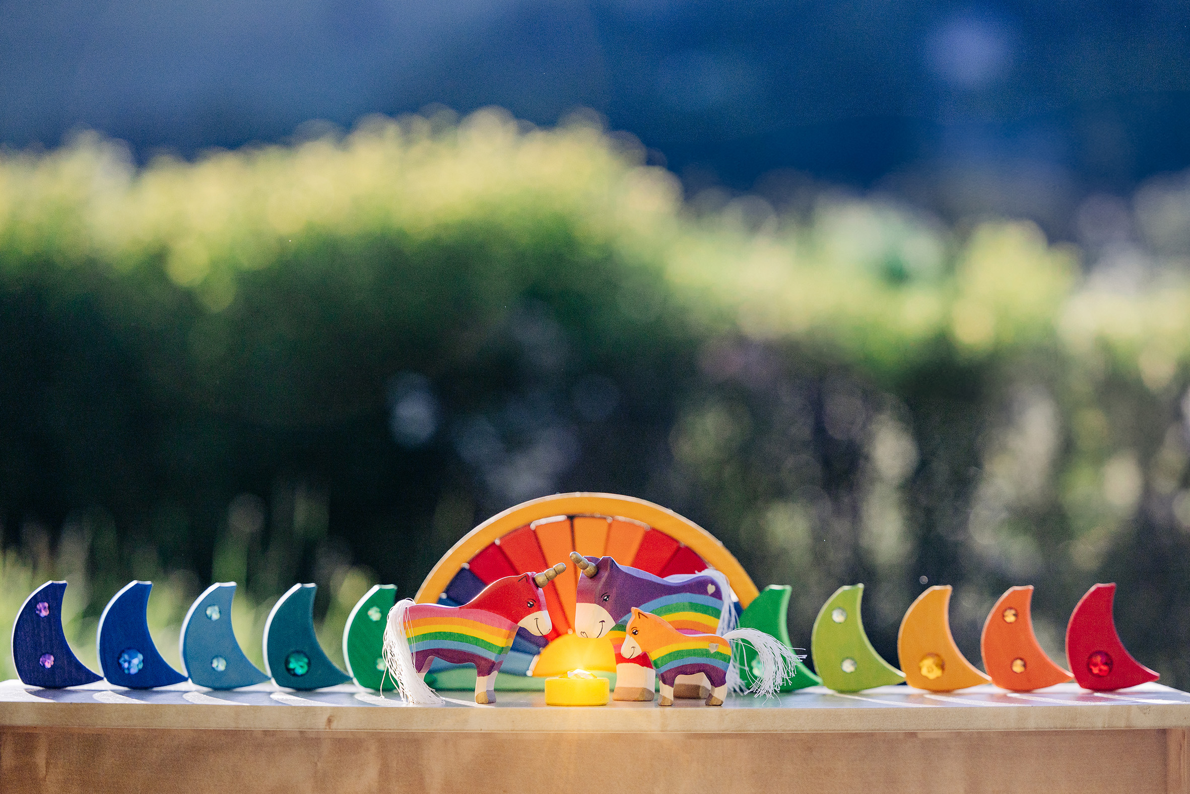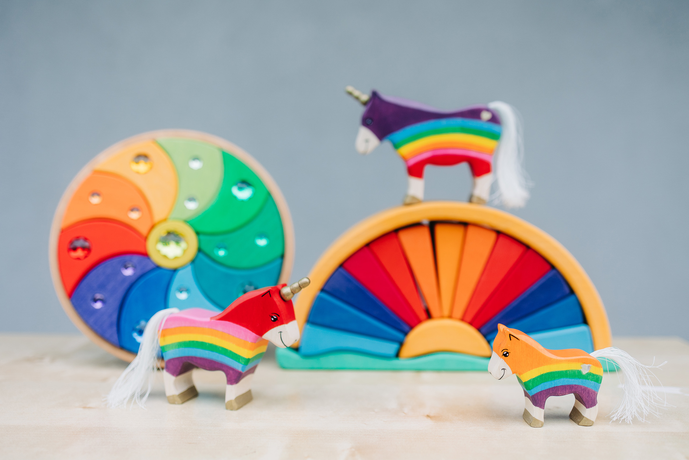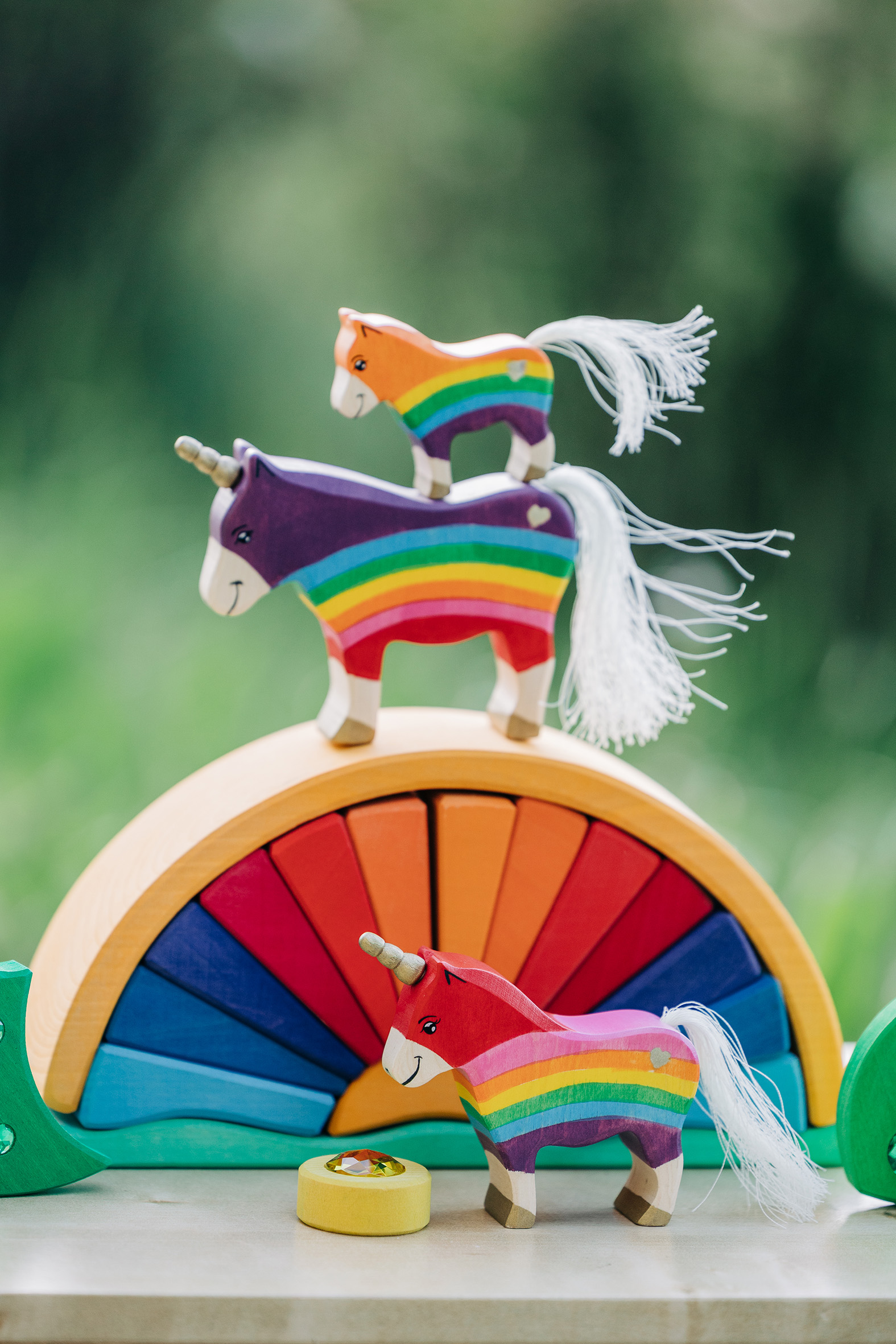 Es gibt Momente, in denen die Welt ein bisschen mehr Glanz und Farbe vertragen kann – und genau dafür sind unsere Regenbogen-Einhörner geschaffen! Hier treffen kräftige Regenbogenfarben auf sanfte Holzstrukturen, funkelnde Schmucksteine auf liebevoll handgemalte Details. Die Einhörner – vom stolzen Leitpferd bis zum fröhlichen Fohlen – bringen Magie ins Kinderzimmer und wecken die Fantasie der Kleinsten. Begleitet werden sie von einem strahlenden Regenbogenbogen, der nicht nur ein dekoratives Highlight ist, sondern auch zum Stapeln, Sortieren und Bauen einlädt. Die glitzernden Elemente fangen das Licht wie kleine Sonnenstrahlen ein und lassen die Szene erstrahlen – fast so, als wäre gerade ein Sommerregenbogen zum Greifen nah. Was diese Spielwelt so besonders macht: Fantasievoll & kreativ: Einhörner, Regenbögen und bunte Steine eröffnen unendliche Spielideen. Handarbeit mit Herz: Aus nachhaltigem Holz gefertigt und mit kindersicheren Farben bemalt. Magischer Glitzer: Kleine Schmucksteine verleihen dem Set das gewisse Funkeln. Spiel & Deko zugleich: Perfekt zum Spielen, aber auch ein echter Hingucker im Kinderzimmer. Ob wilde Einhornabenteuer über Regenbogenbrücken oder friedliche Märchenmomente im glitzernden Licht – dieses Set macht jedes Spiel zu einer Reise in eine magische Welt. Lass die Fantasie fliegen und hol dir den Regenbogenzauber nach Hause!
